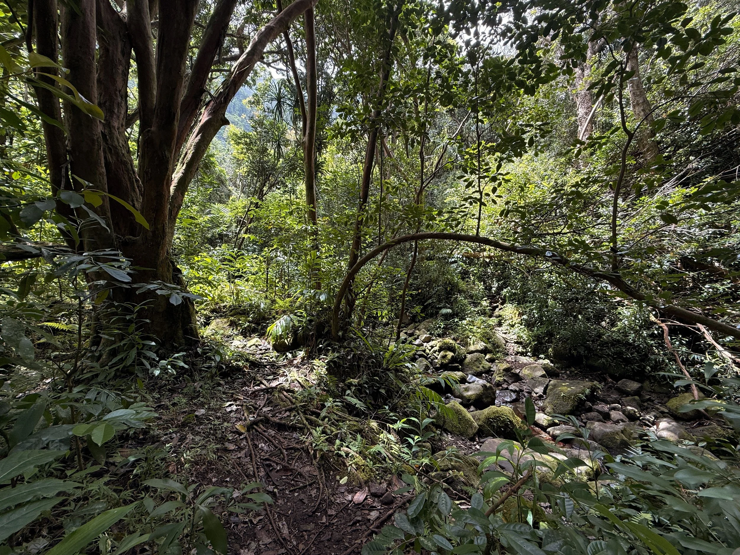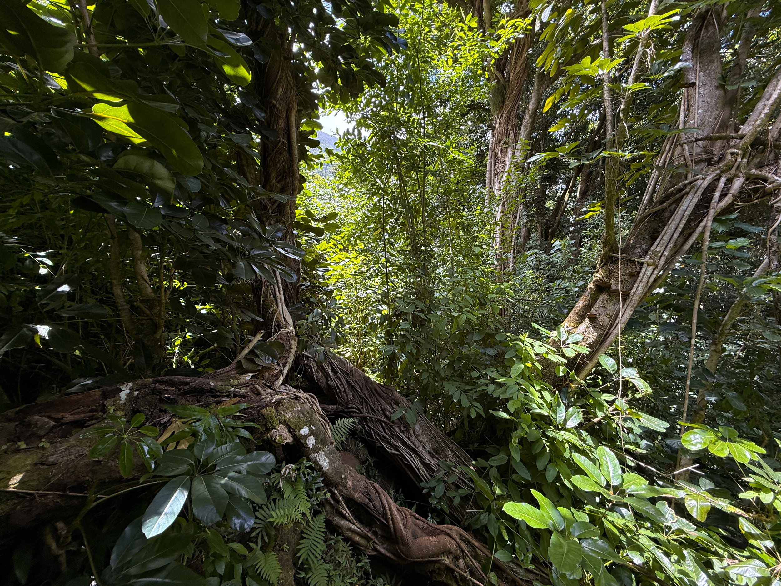 An entanglement of Hau trees, such as this, is seemingly a familiar experience on Hawaiʻi trails, as countless day hikes across the islands—like the Kulanaʻahane Trail in Moanalua Valley or the Waimano Ridge Trail—navigate through very similar sections.