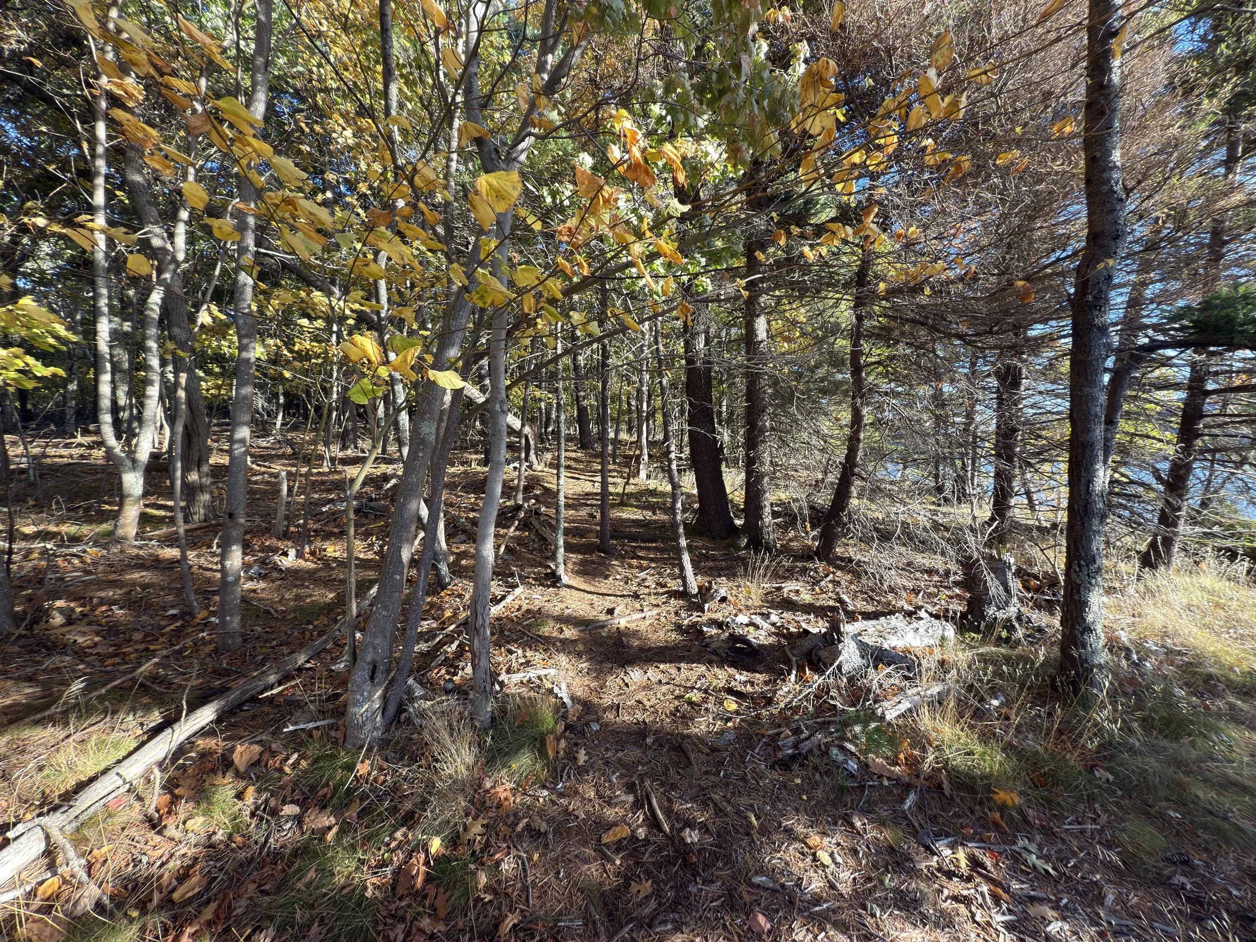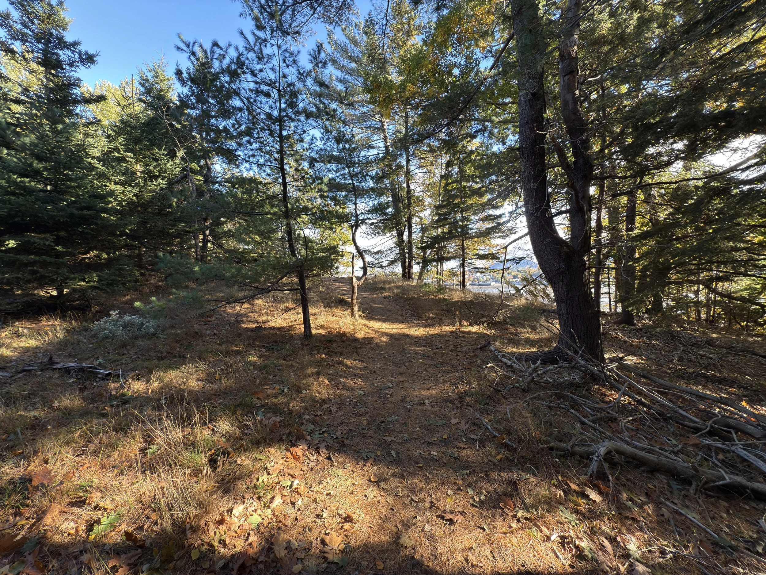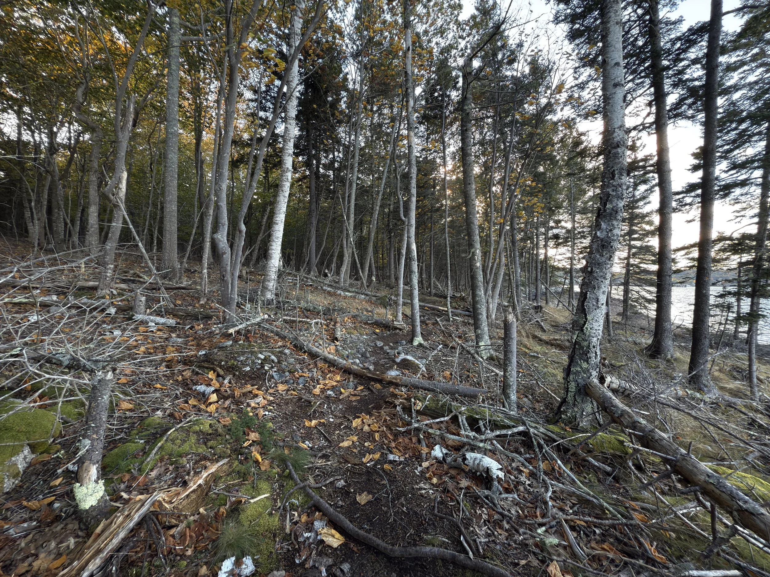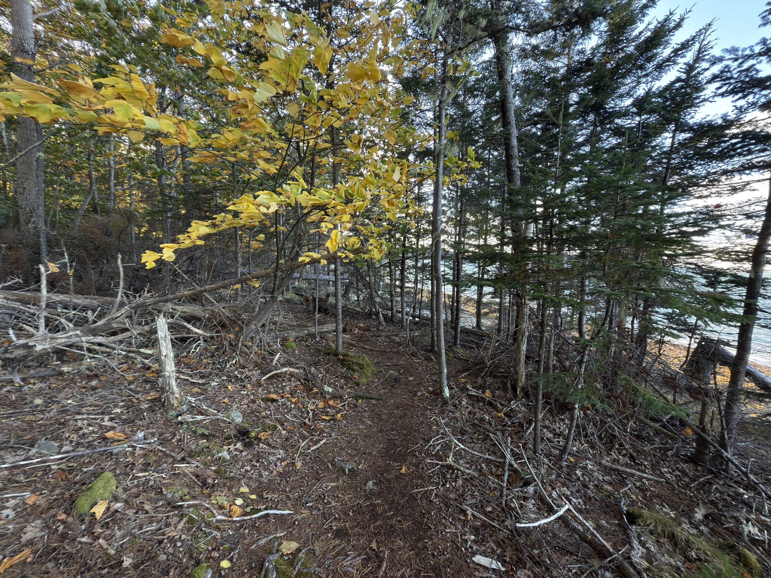 Past the trailhead shown above, the trail on Bar Island follows an easy, gradual path up to the summit, about 0.5 miles (0.8 km) away, with both junctions for the Bar Island Loop Trail located within the first 0.1 miles (0.2 km).