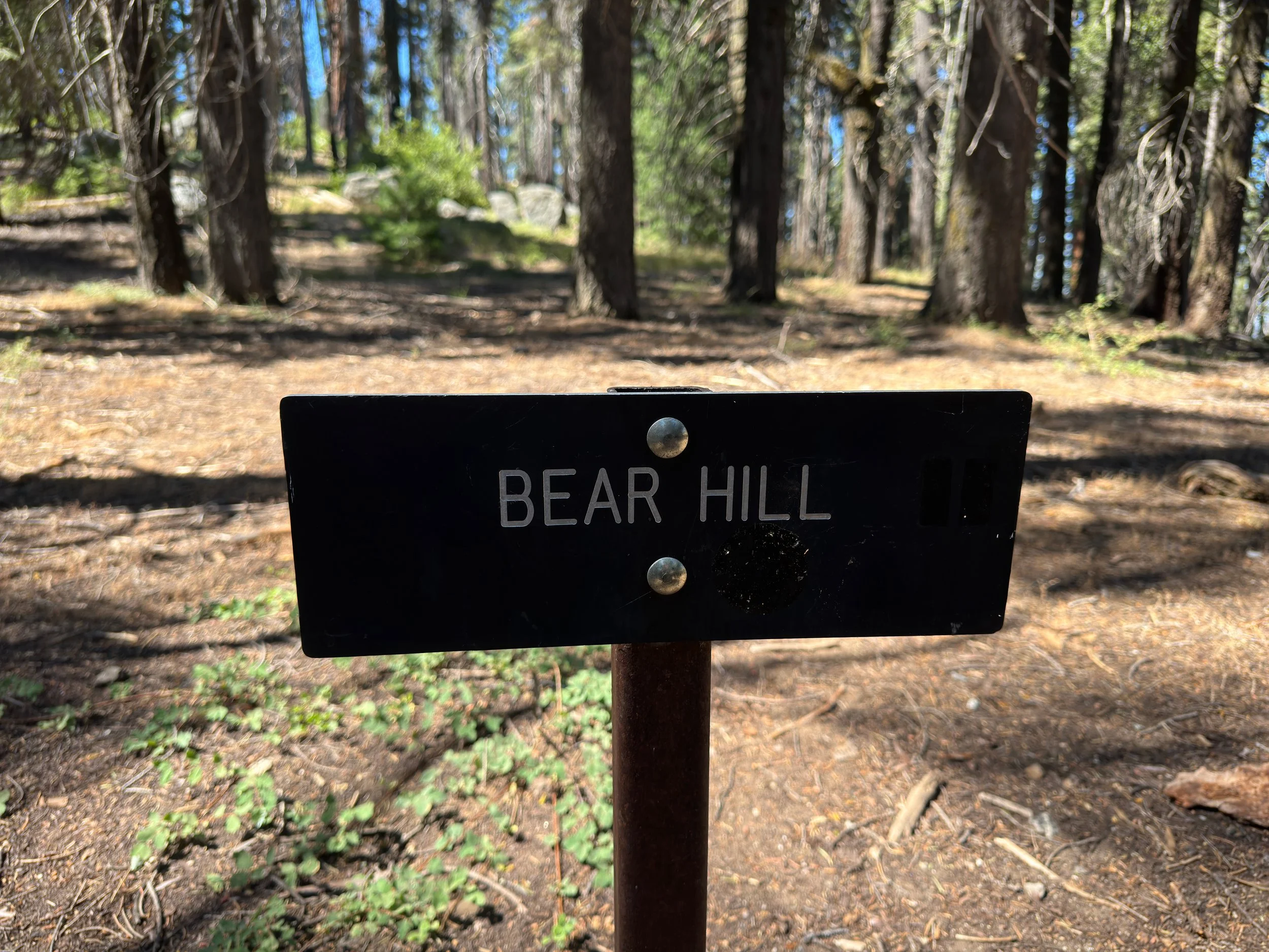The end of the Bear Hill Trail is where the trail crosses over Crescent Meadow Road to meet the Moro Rock, Hanging Rock, and Sugar Pine Trails, located just down Moro Rock Loop Road from this junction.