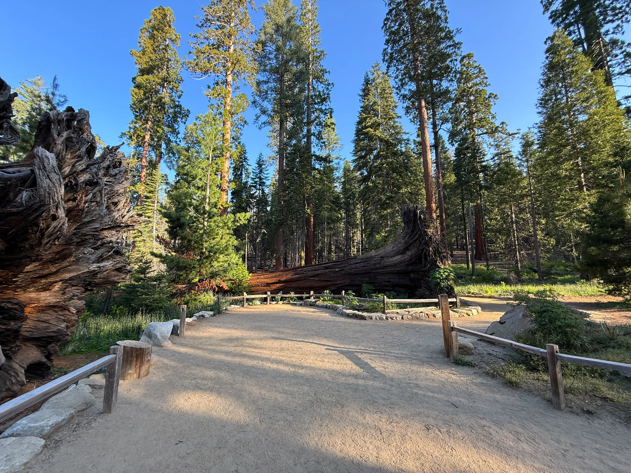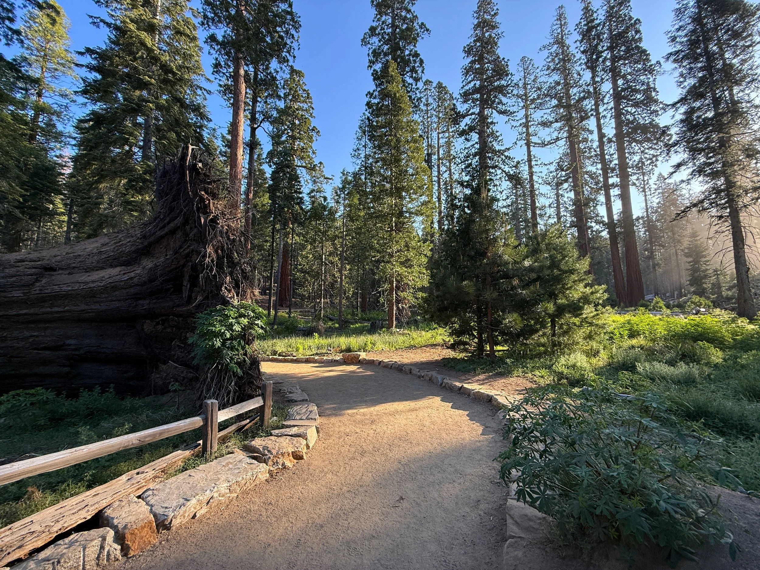 This Sequoia alongside the boardwalk is the Fallen Monarch—not the second tree to the left of the junction up ahead.