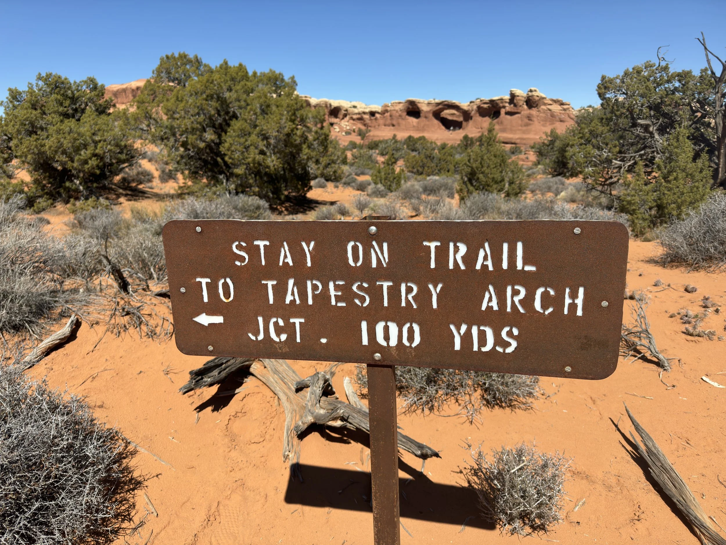The Tapestry Arch Trail is a 0.2 mile (0.3 km) one-way hike off the main Broken Arch Loop.