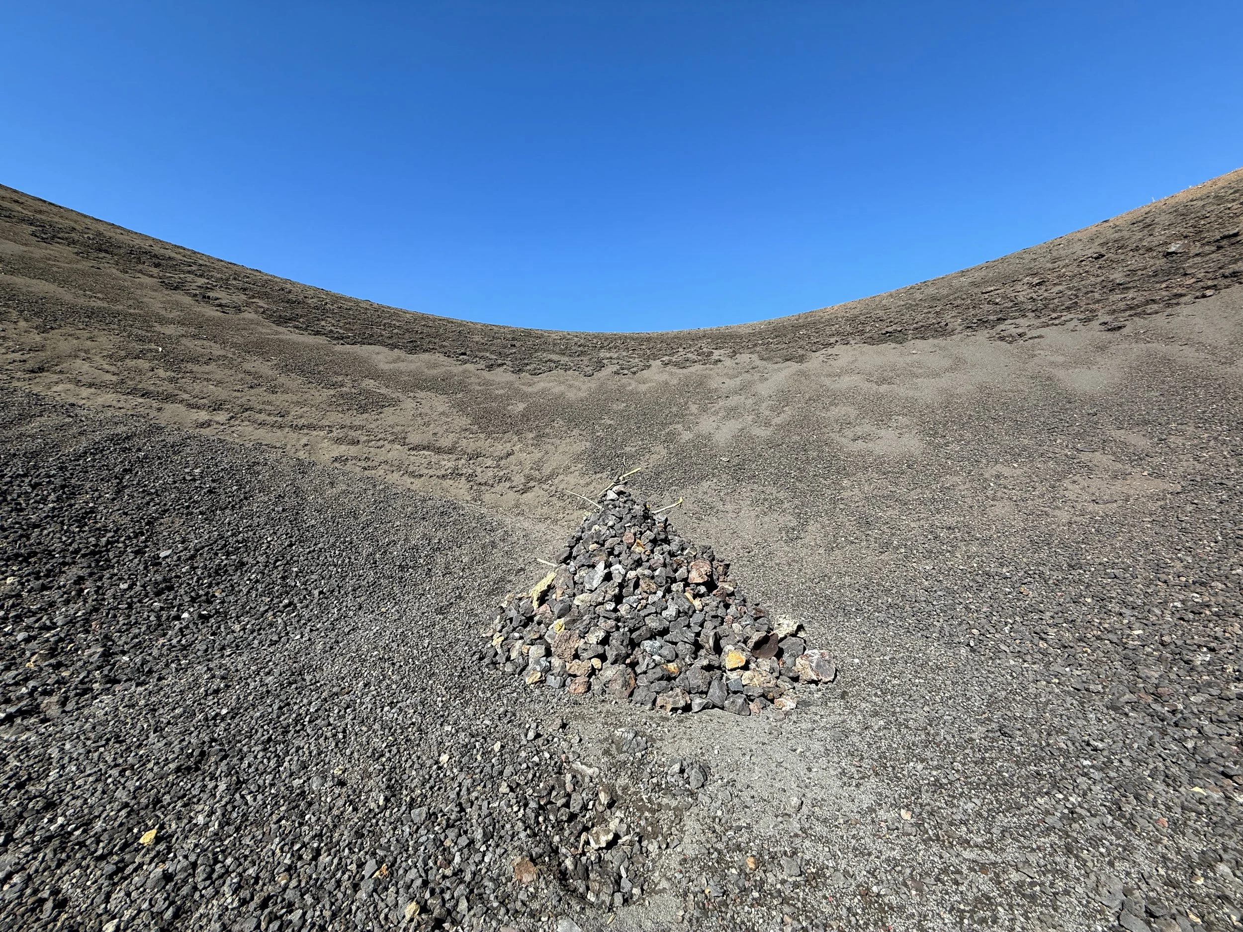 The bottom of the Cinder Cone sits roughly 150 ft. (46 m) below the East Cinder Cone junction at the top of the crater.