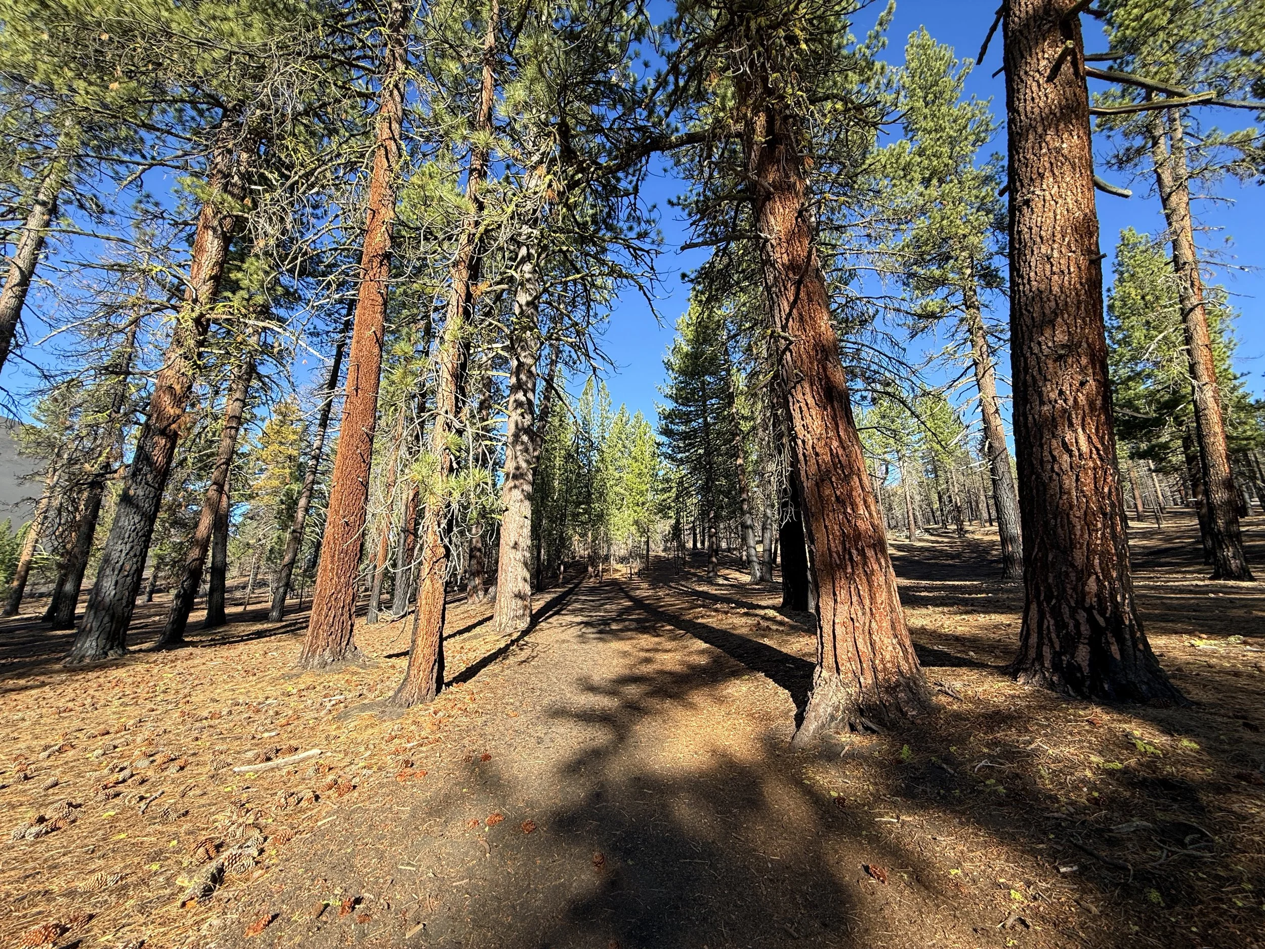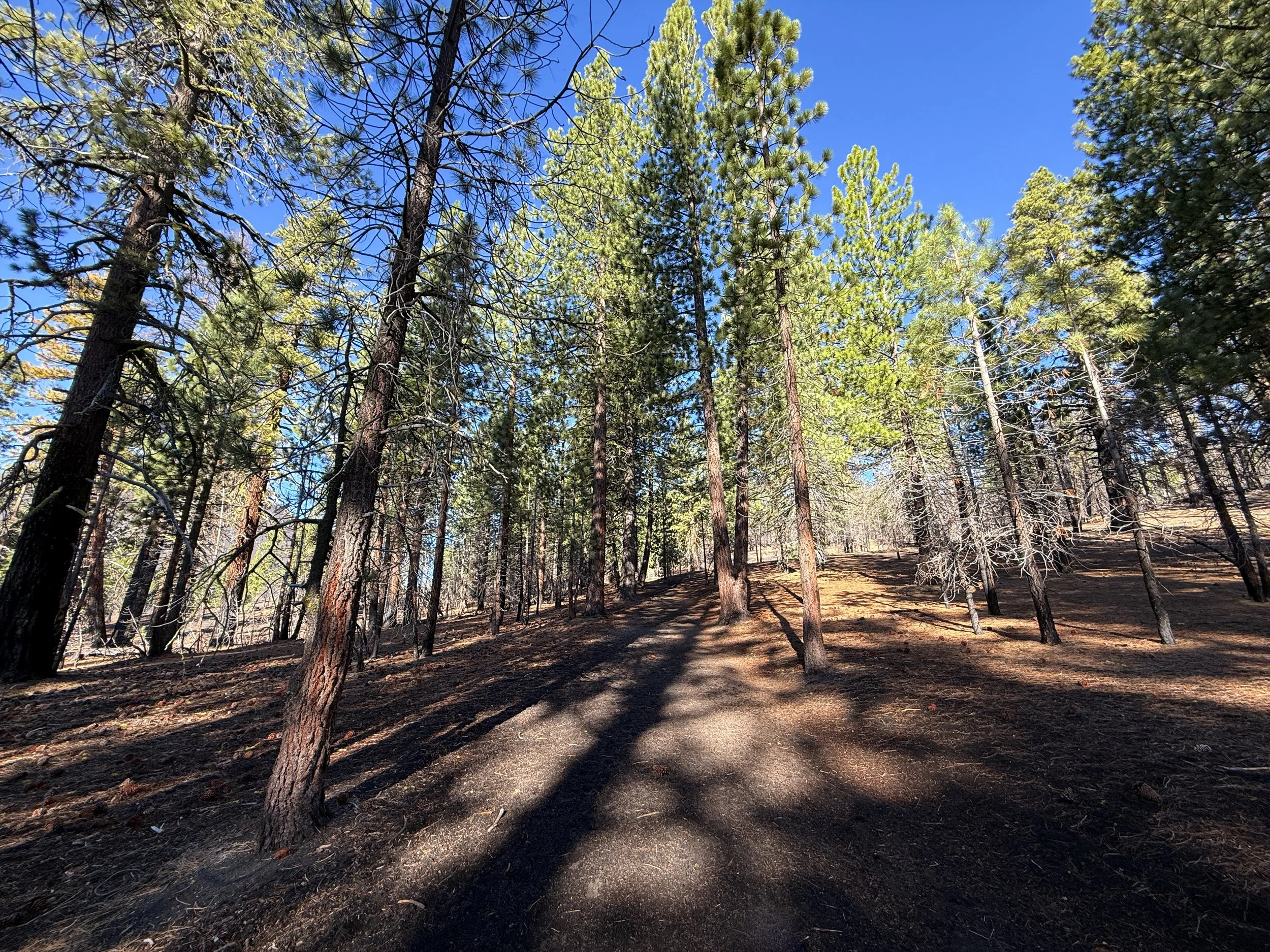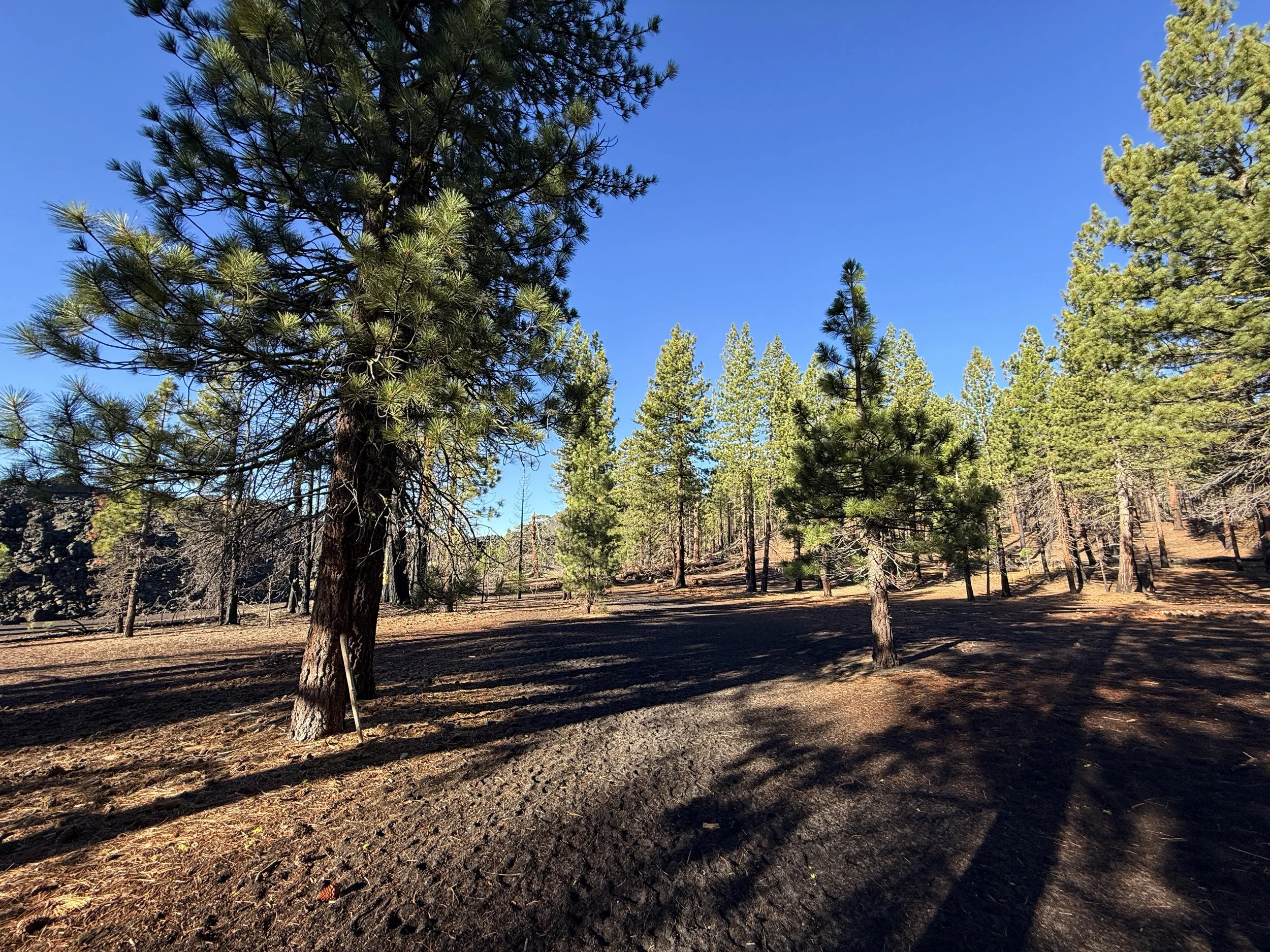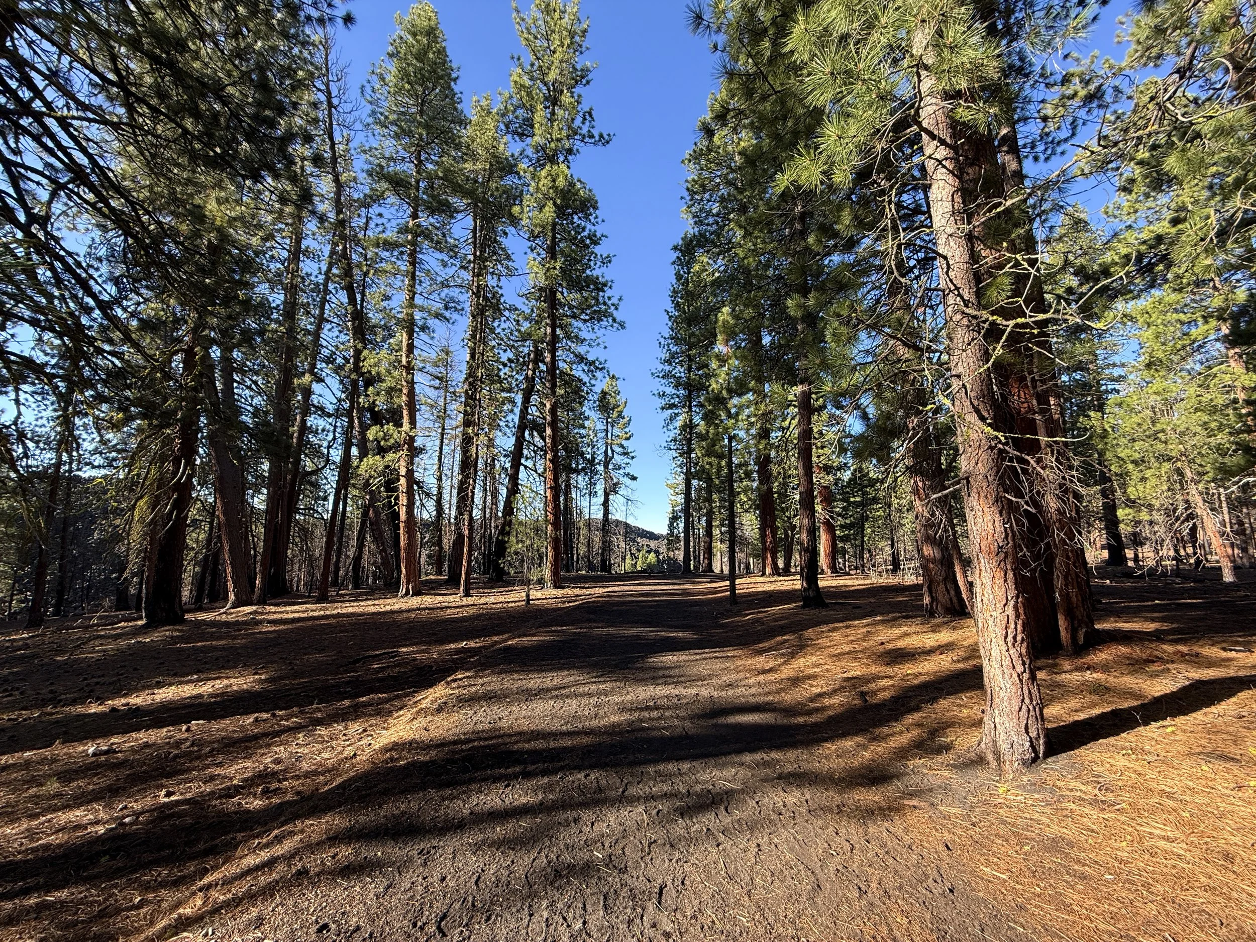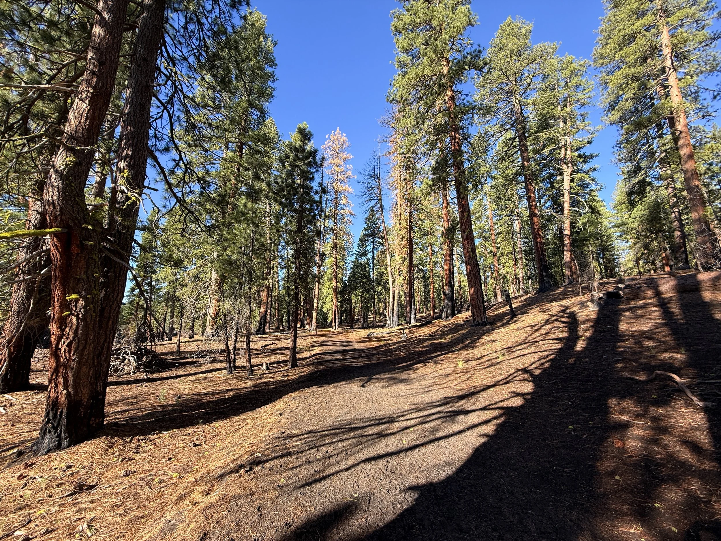 This is where the Cinder Cone starts to become visible for the first time through the Ponderosa trees!