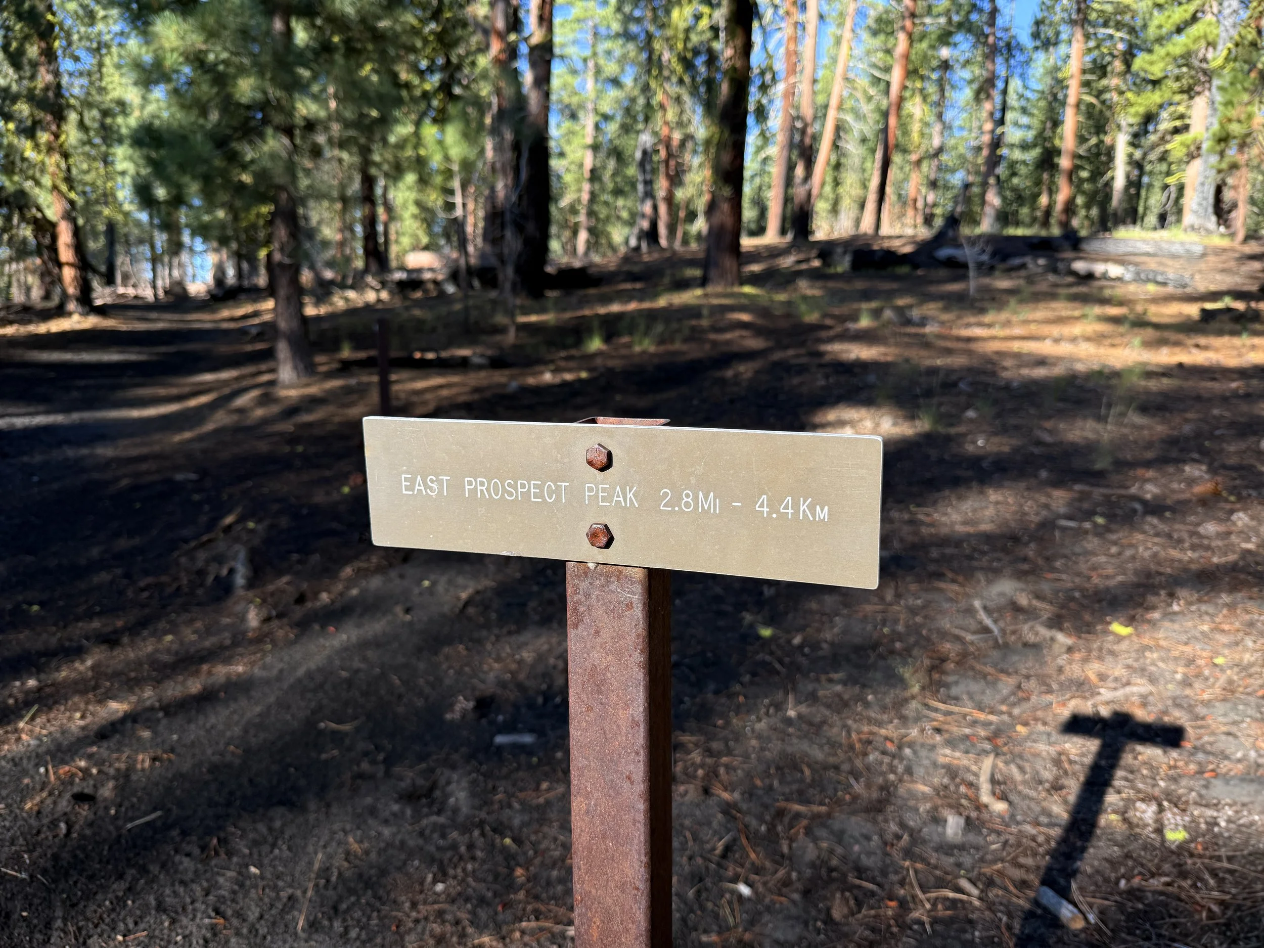 After 0.4 miles (0.6 km), the Cinder Cone Trail splits, with the trail that climbs west from this junction up to the summit of Prospect Peak.