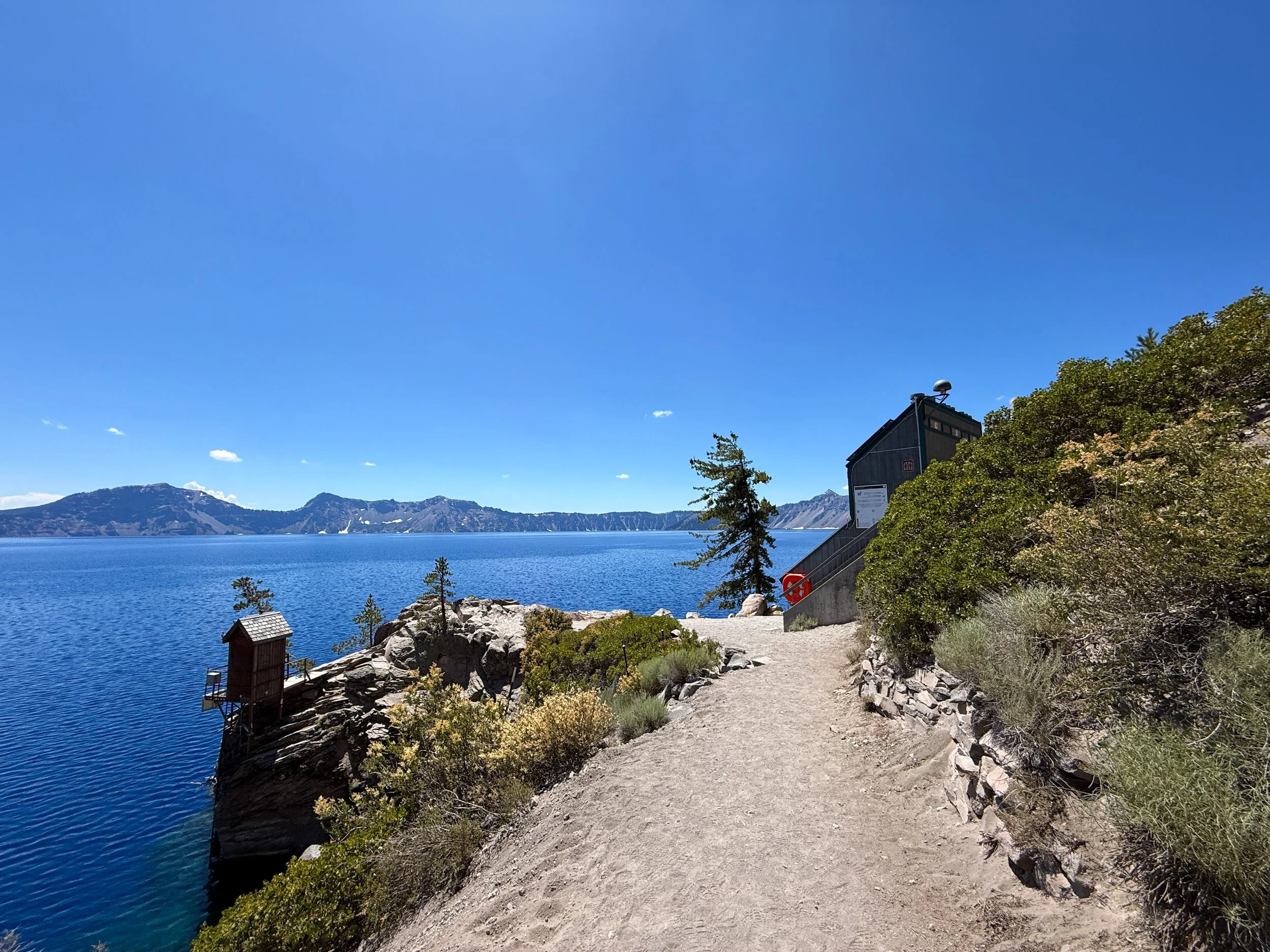 When the Cleetwood Cove Trail reaches Crater Lake, the trail passes directly by the boat dock for all the tours on Crater Lake, including the Wizard Island shuttle.