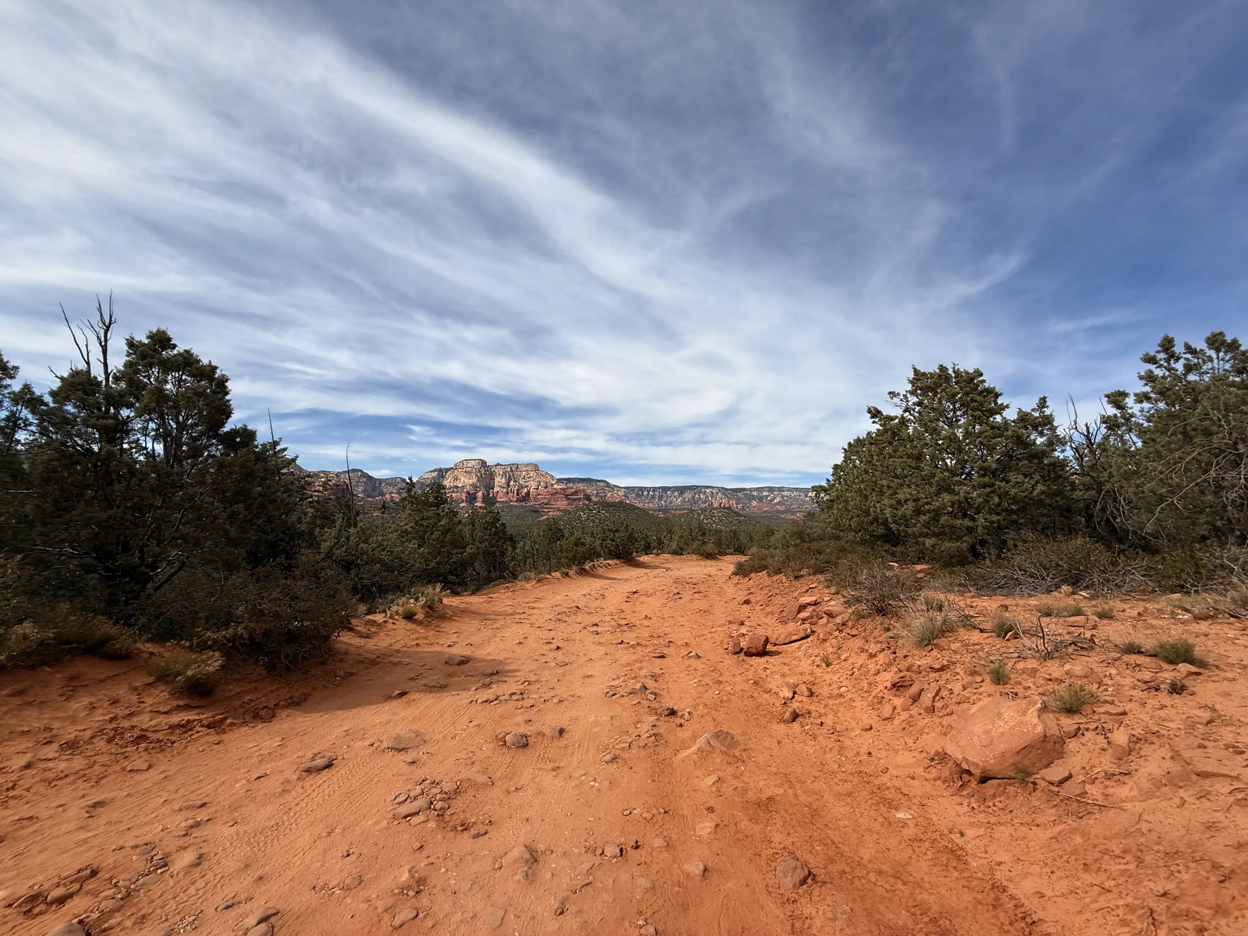 For the most part, Dry Creek Road is nothing more than a long, straight, and mostly exposed access road to the Devil’s Bridge Trailhead, which is why I continually recommend wearing a hooded sun shirt here—and for countless different day hikes across the Sedona area.