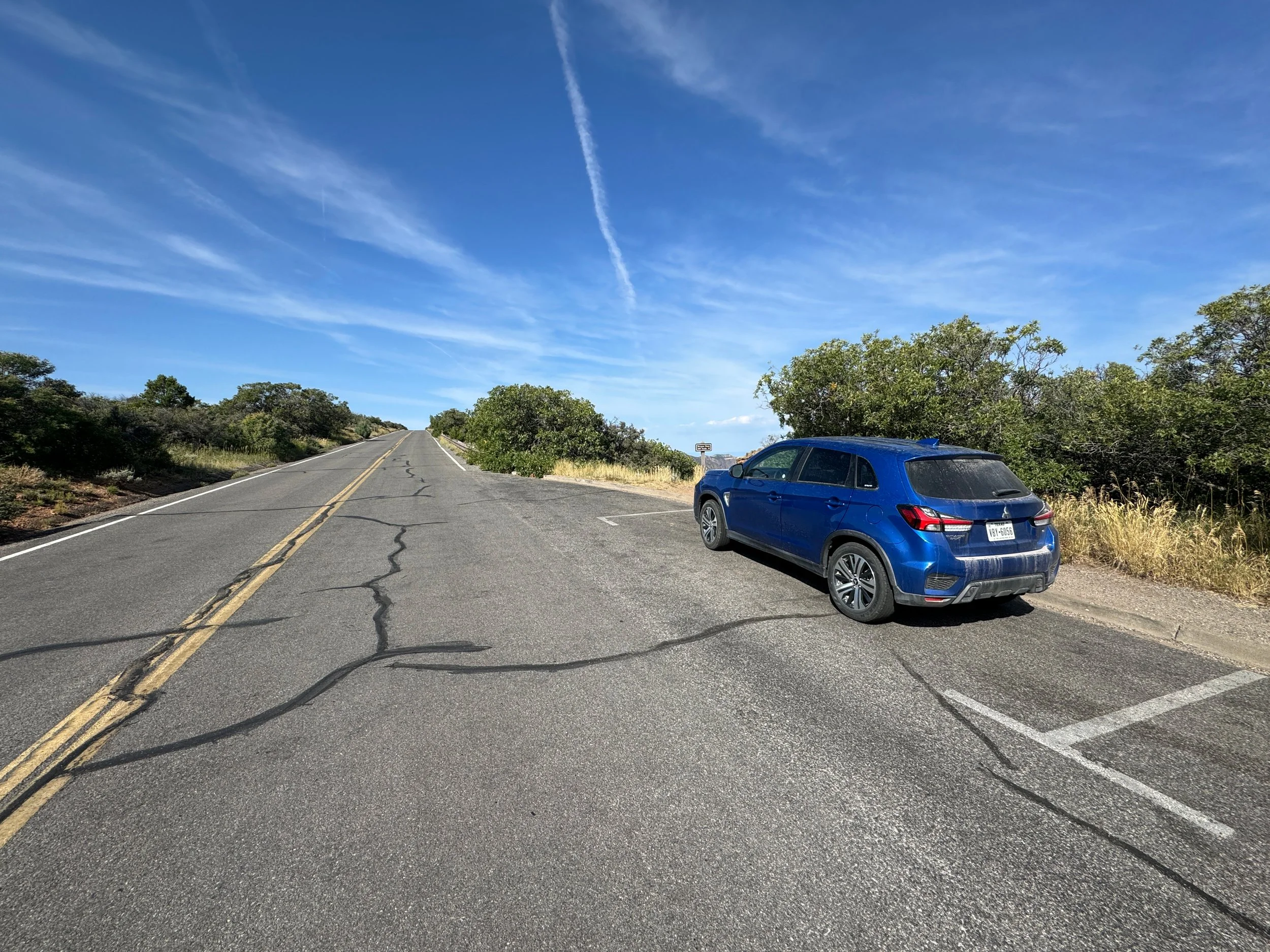 The Dragon Point Trailhead parking area is located directly alongside South Rim Road, about 4.4 miles (7.1 km) west of the South Rim Visitor Center and 1.5 miles (2.4 km) before High Point at the end of the road.