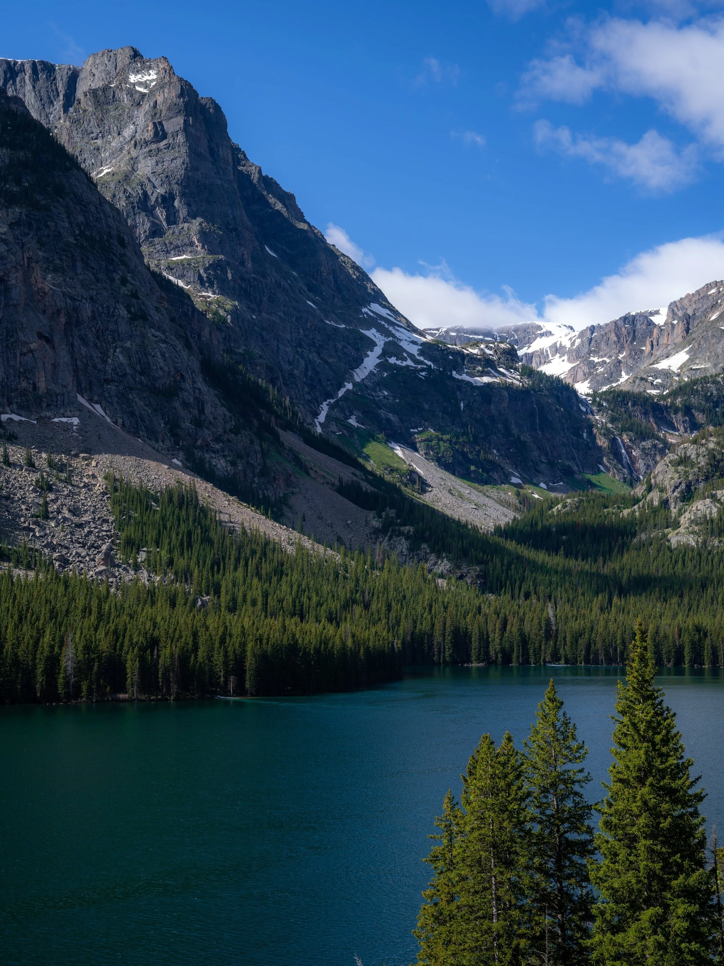 The East Rosebud Trail approaches Rimrock Lake on the left (east) side before descending and crossing over East Rosebud Creek at the mouth of the lake.