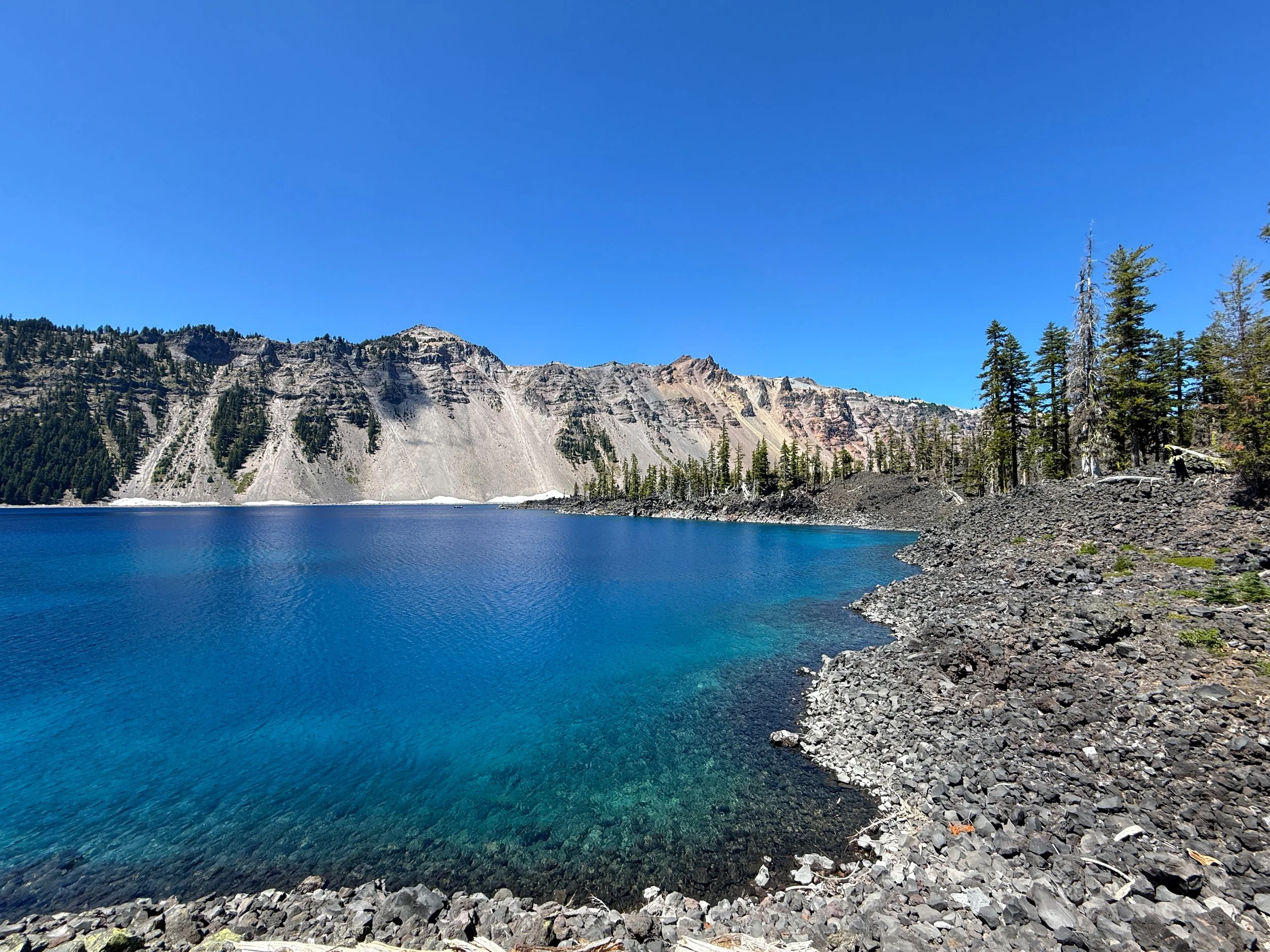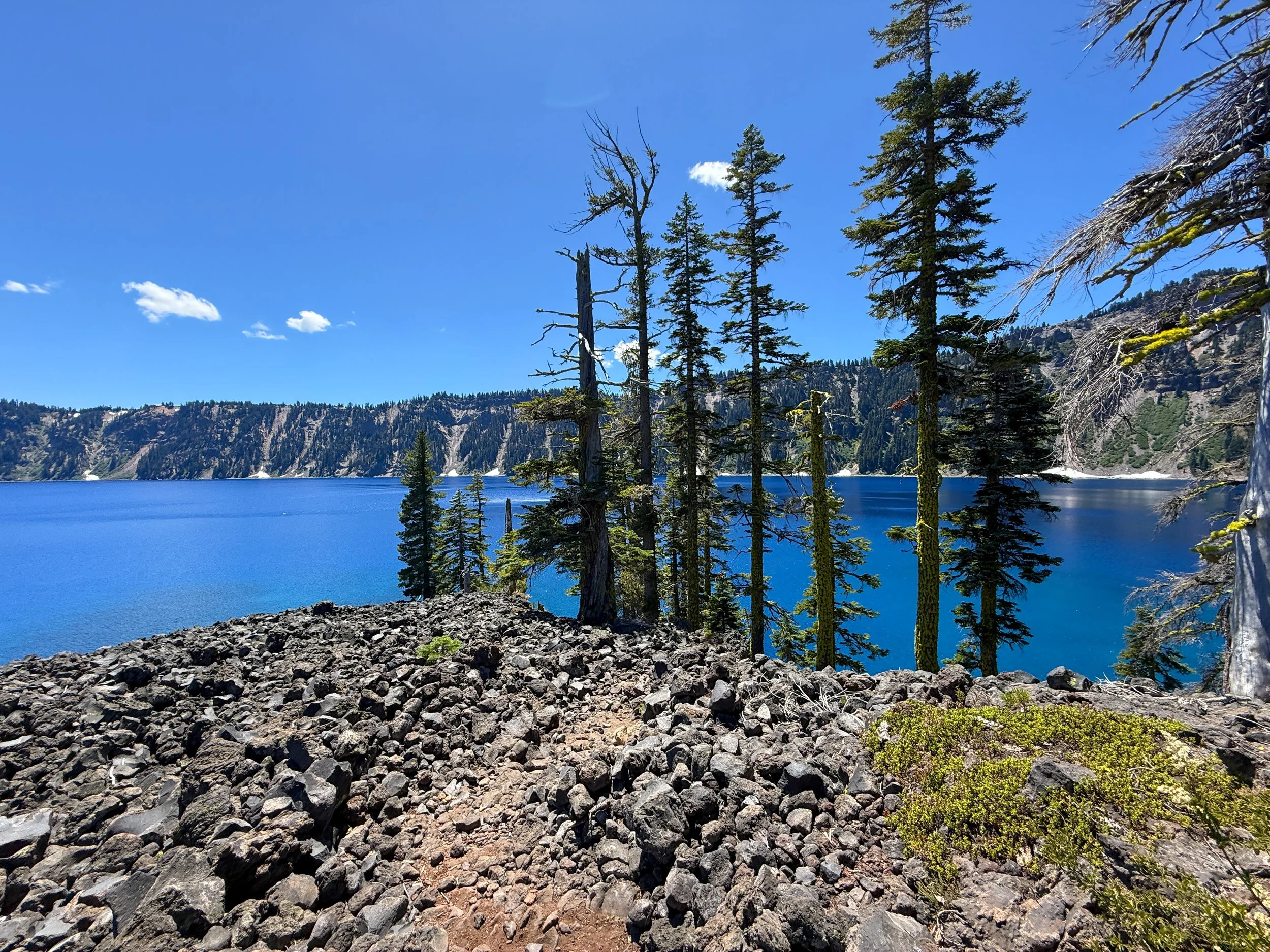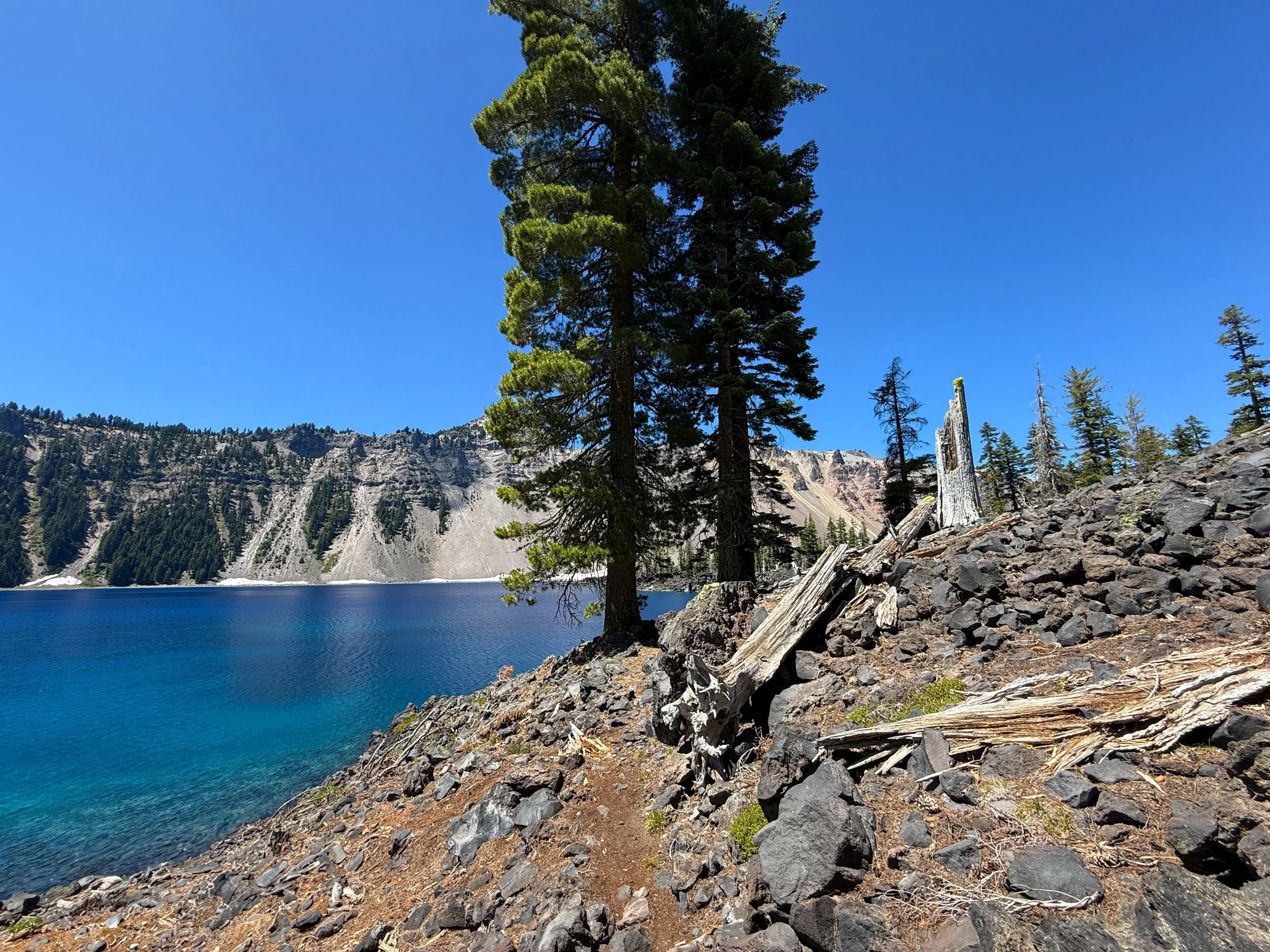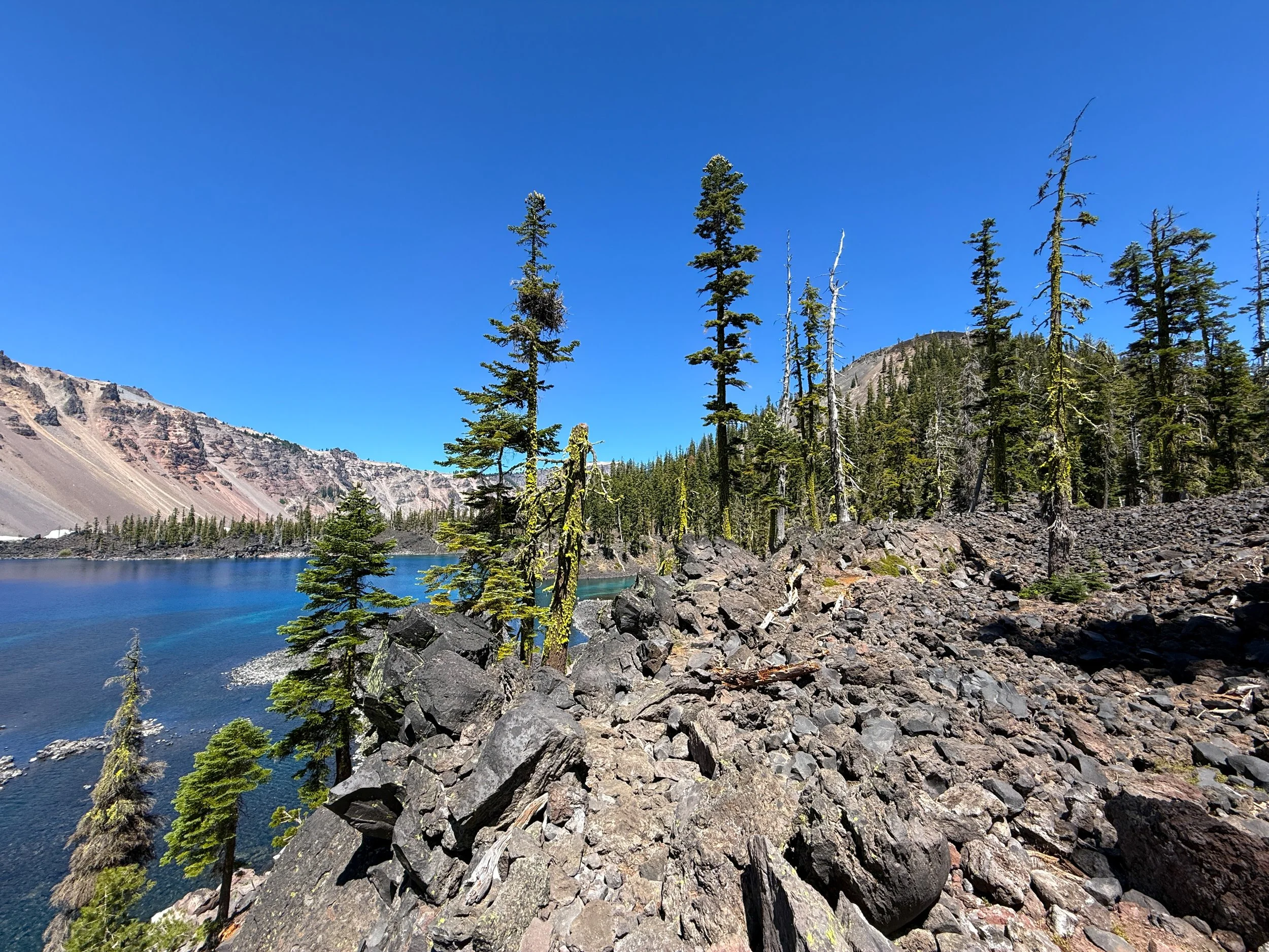 After all the best swimming spots, the Fumarole Bay Trail abruptly ends on the north side of the bay, where the topography transitions back into a rough, rocky, undeveloped volcanic landscape that encompasses most of Wizard Island.