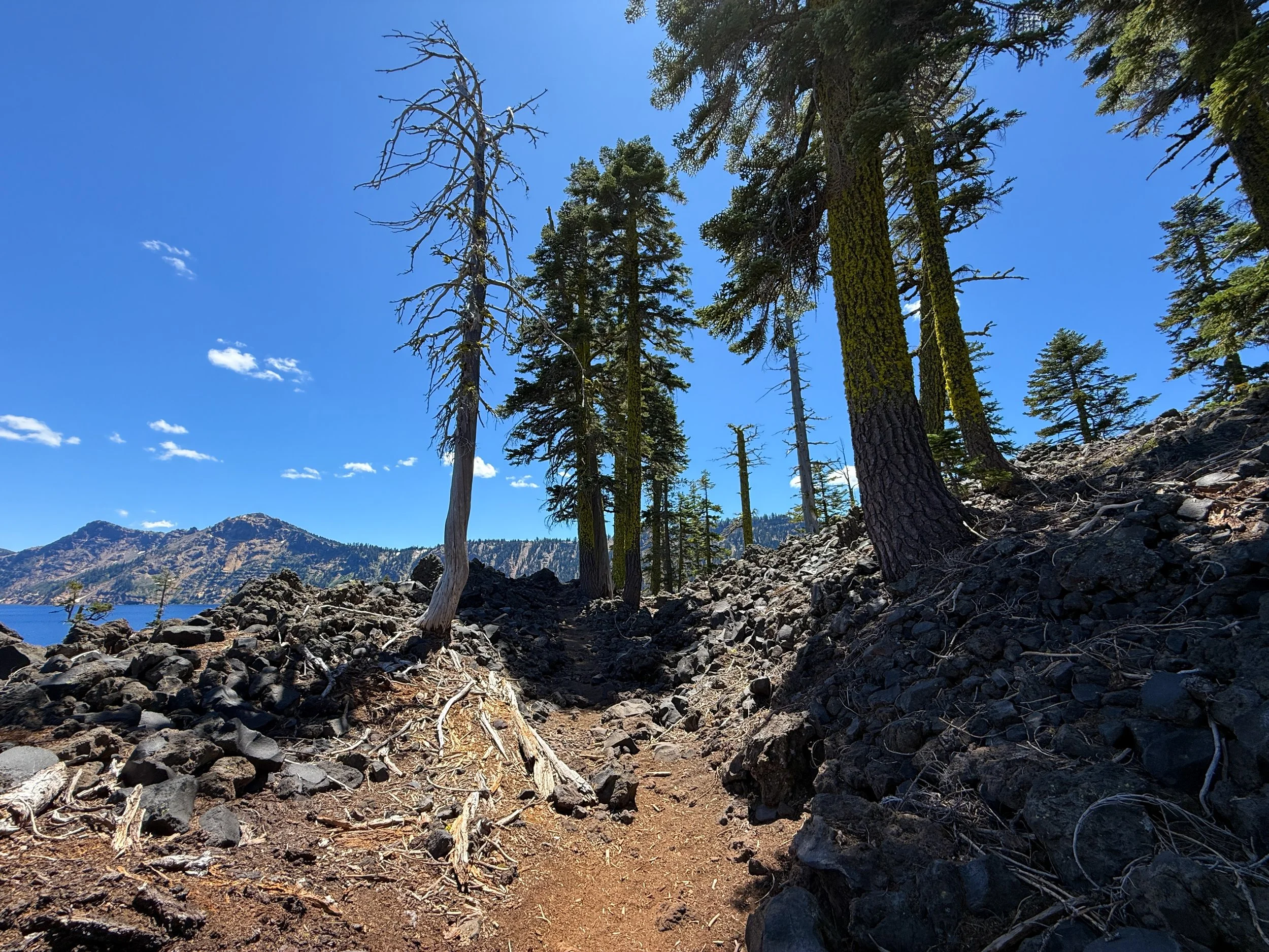 After the Wizard Island Summit junction, the Fumarole Bay Trail continues to traverse the rocky, rugged landscape that makes up the vast majority of Wizard Island.