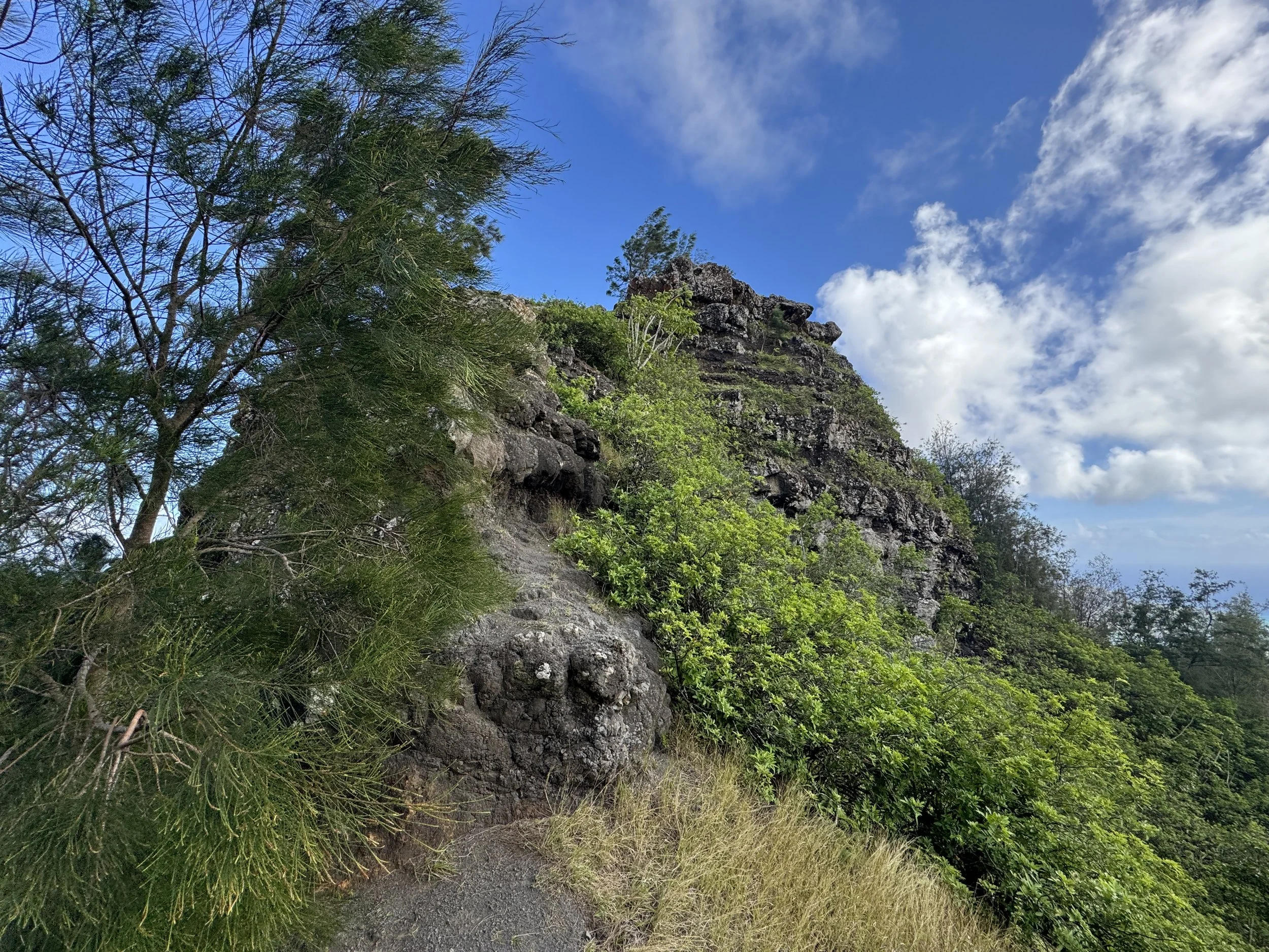 From the summit of Pyramid Rock, the trail down to Hahaʻione Valley descends a very steep trail, dropping roughly 1,200 ft. (366 m) in just over 0.6 miles (1.0 km).