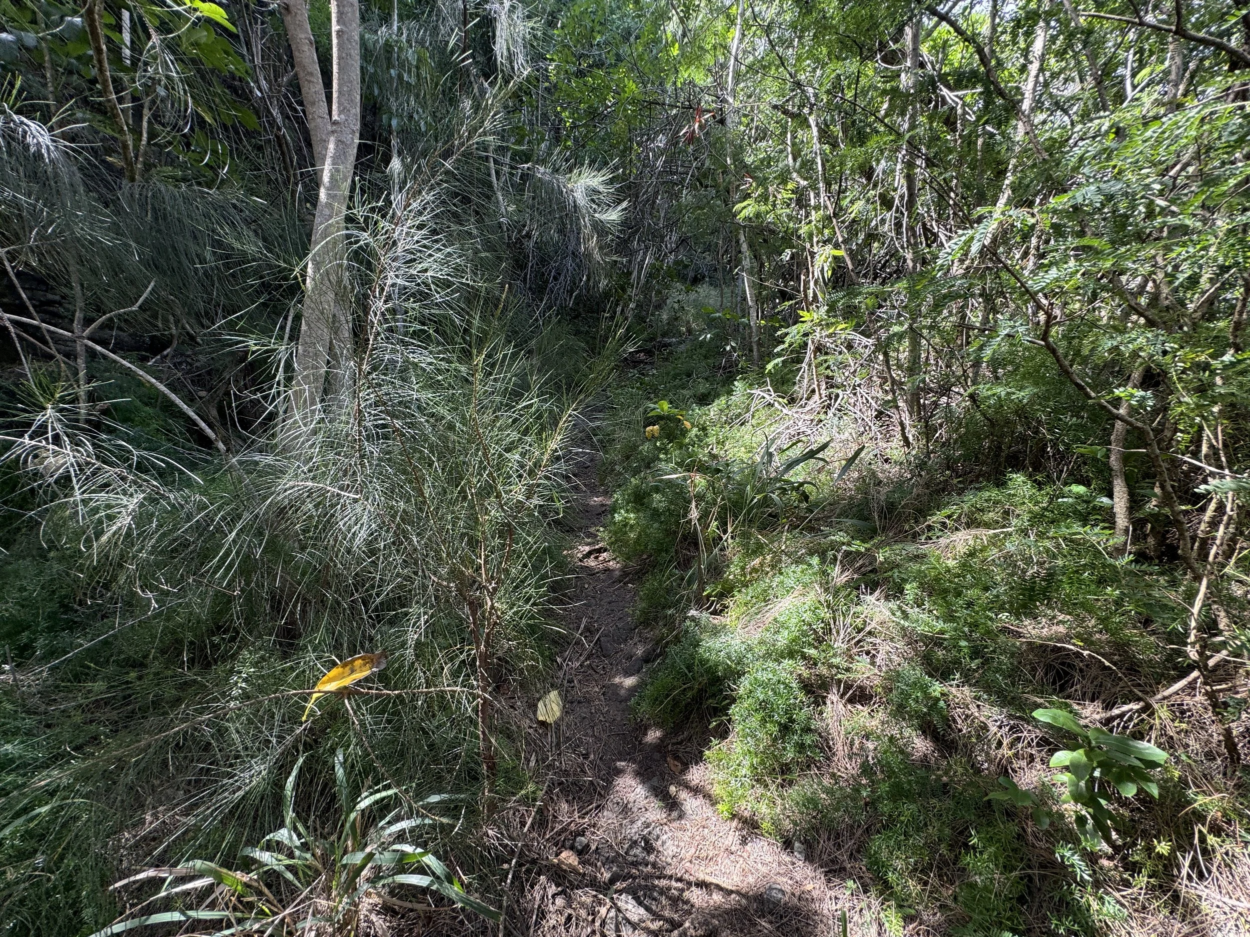 Through the lower forest in Hahaʻione Valley, the trail to the base of the ridge may seem a little confusing, but there is one central path to follow.