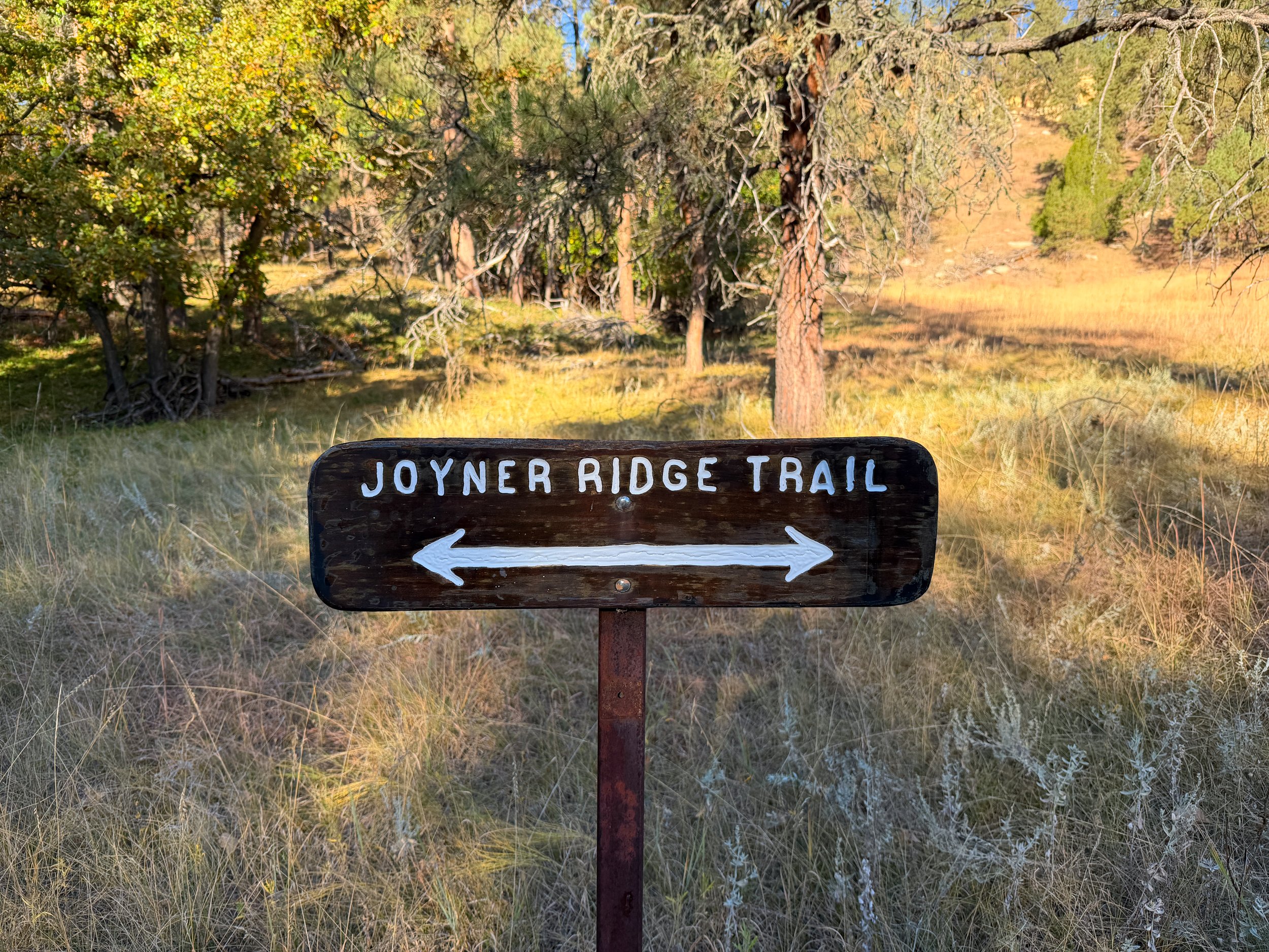 Parking for the Joyner Ridge Trail is located in a small dirt parking area just off the main park road, about 0.8 miles (1.3 km) down the hill from the visitor center and the popular Tower Trailhead.