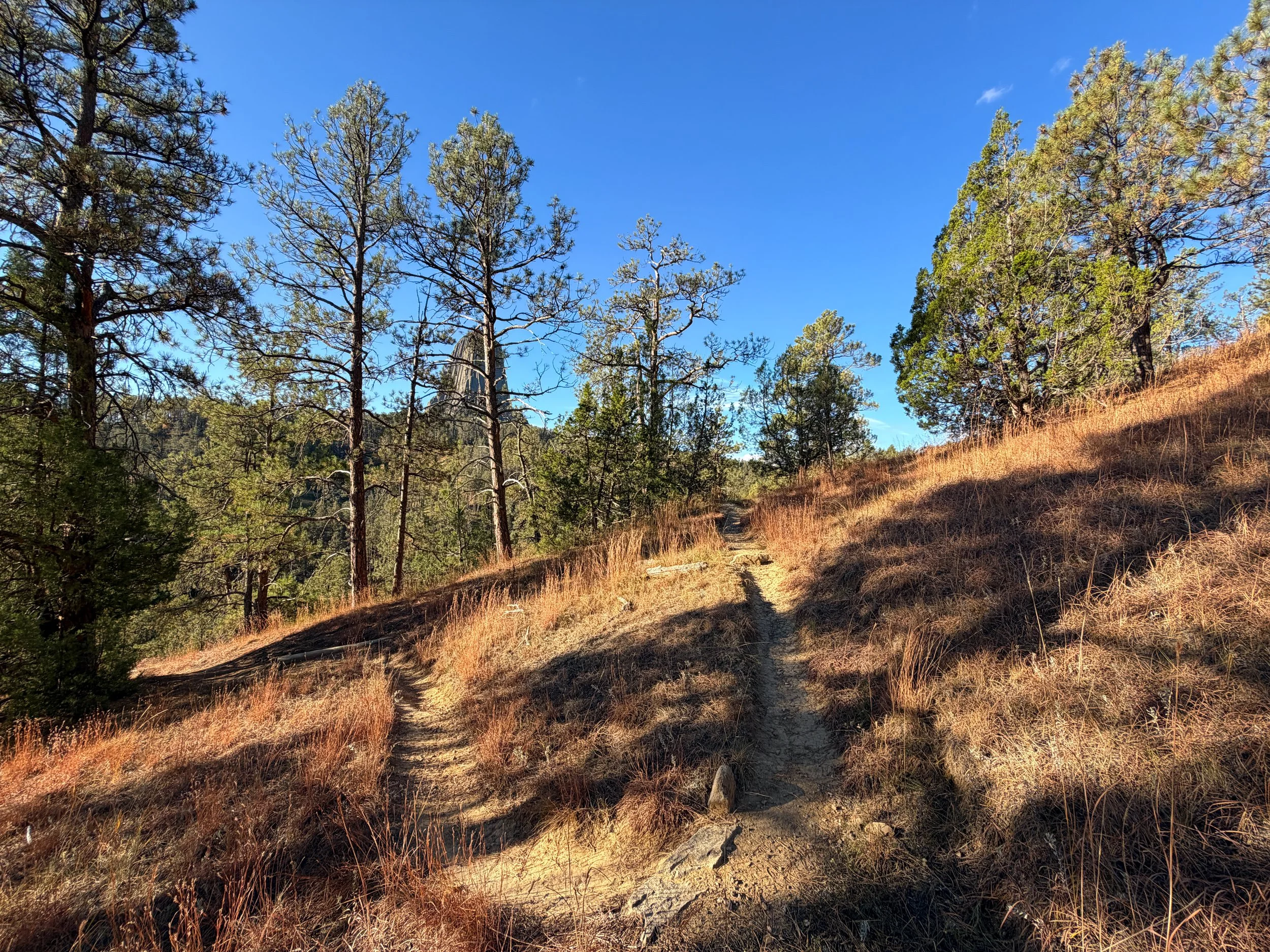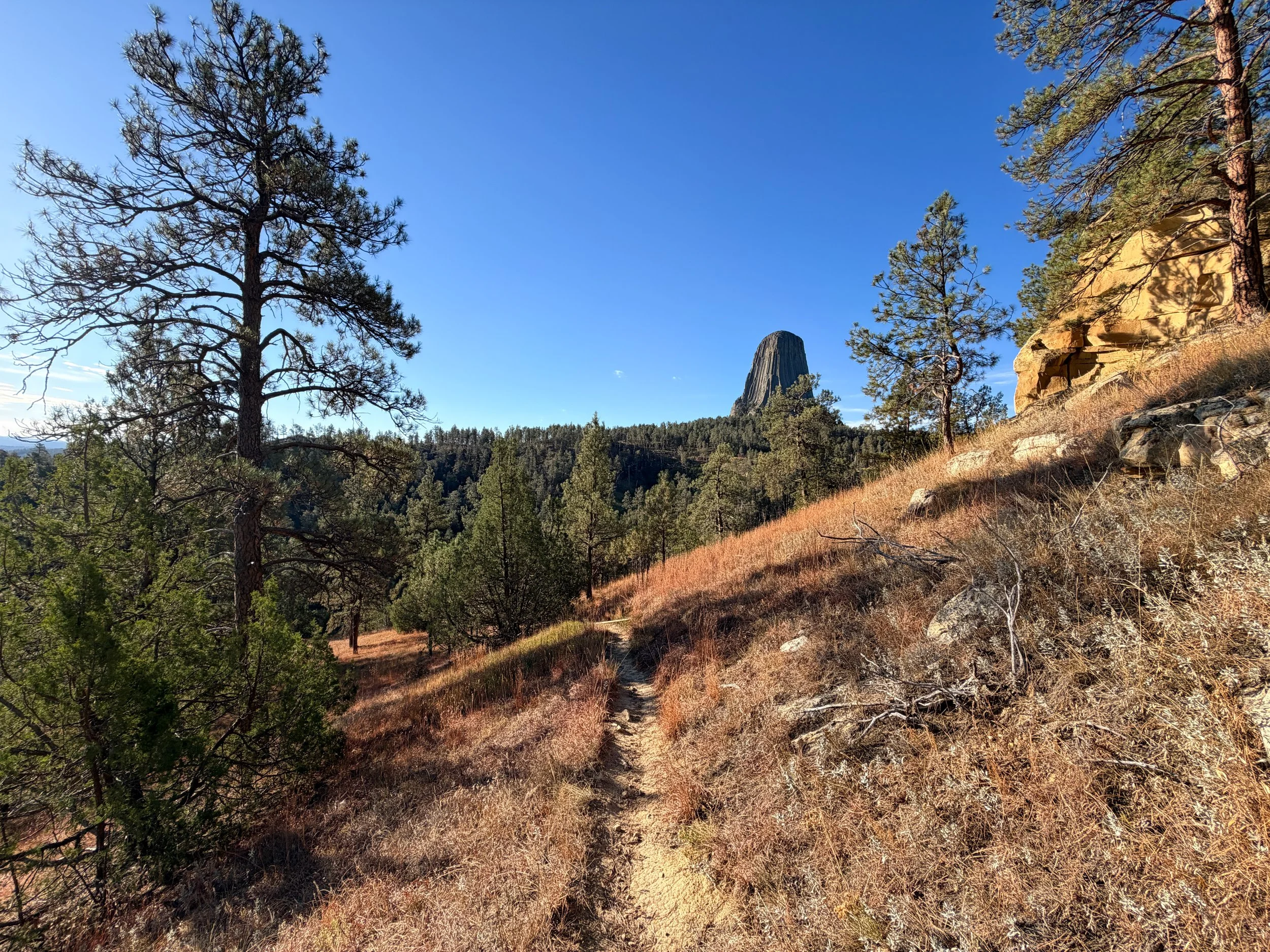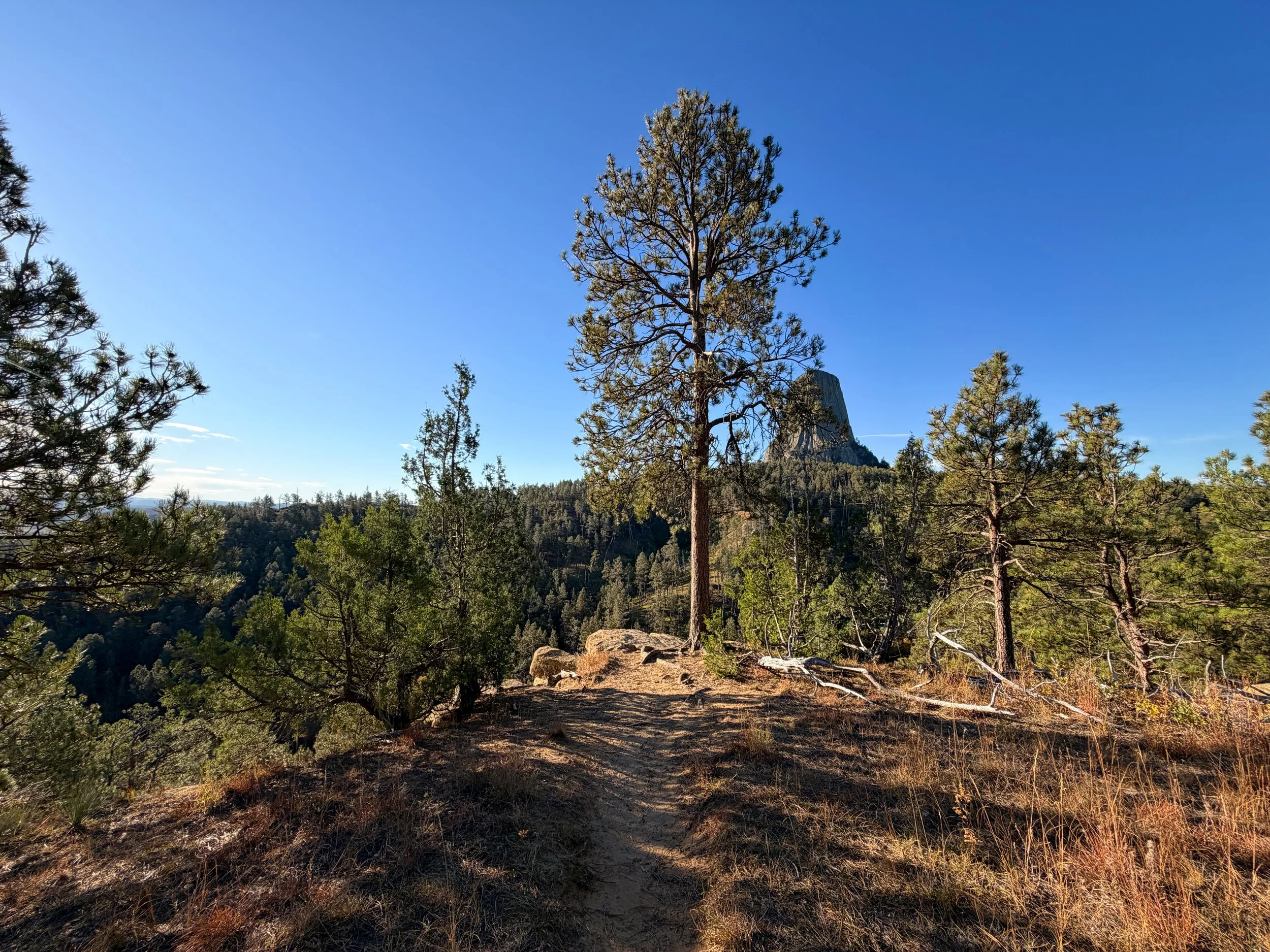 Just before the loop begins the switchbacks that descend off Joyner Ridge, the trail reaches a split that leads out to the best overlook of Devils Tower on the entire hike.