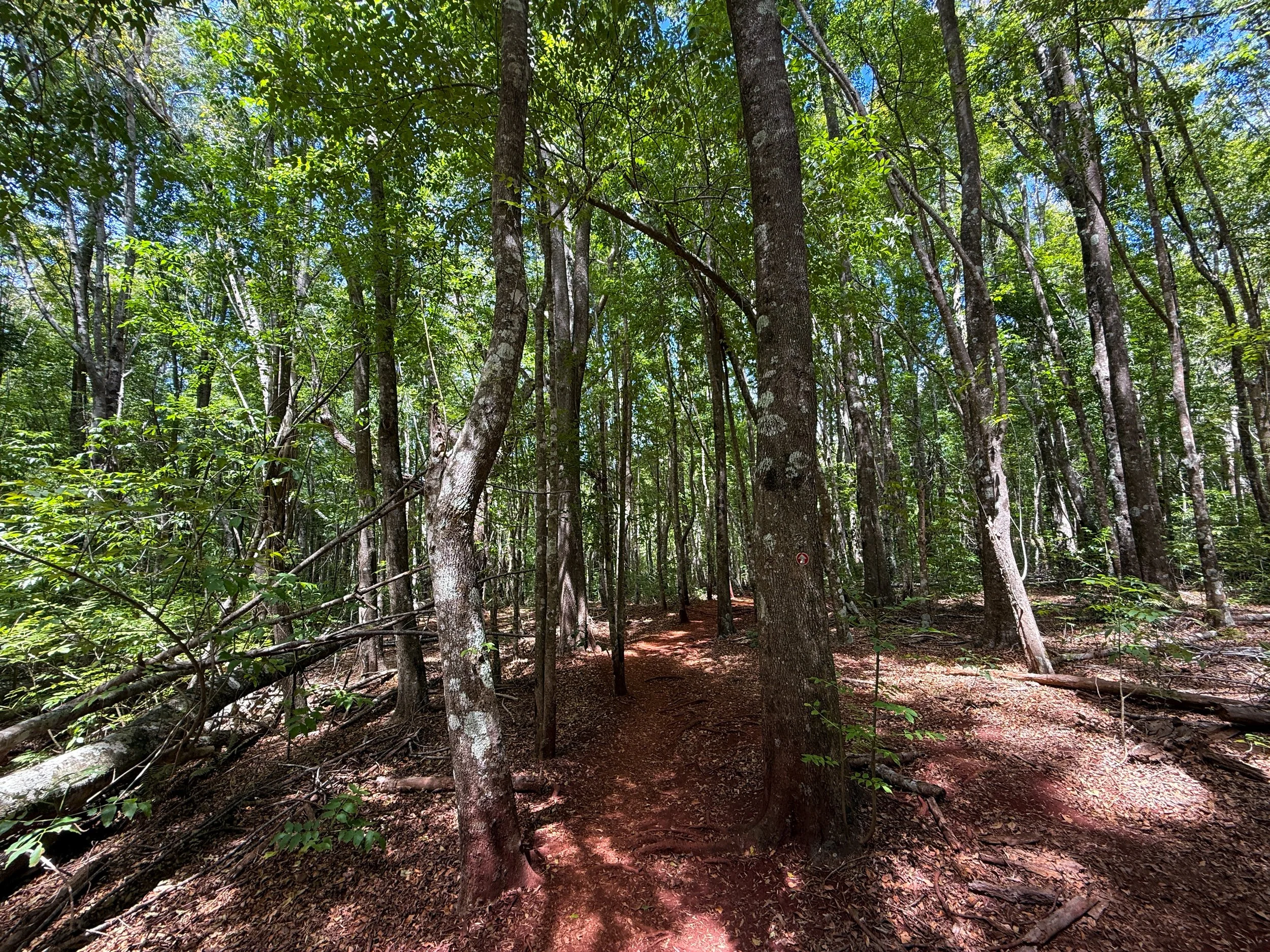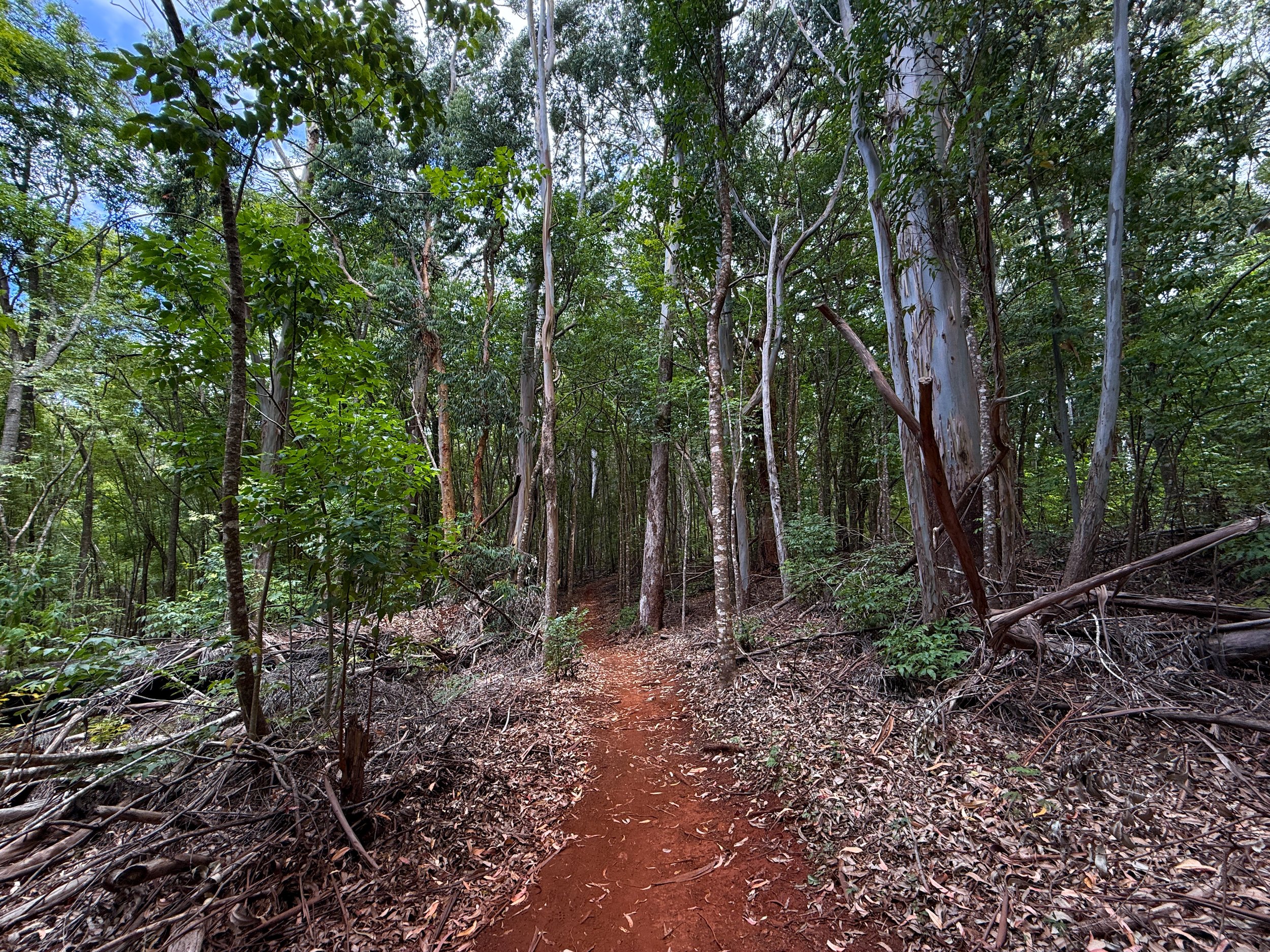 That said, go straight across Paʻahao Road and look for the same red trail markers on the trees indicating the correct route.