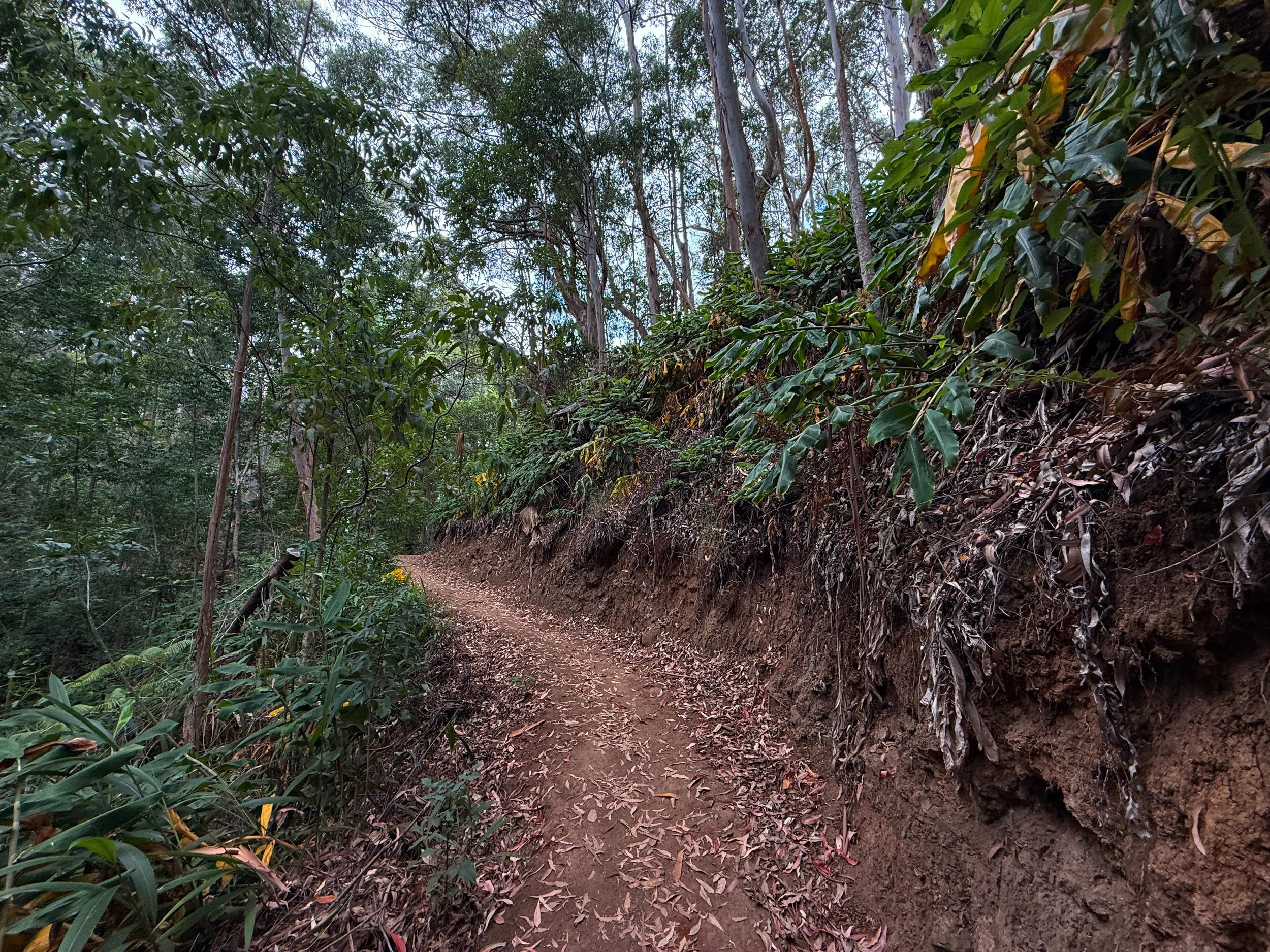 Shortly after the picnic table, the Kahakapao Loop passes the exit for the Ravine Trail, a short, downhill, mountain-bike-only trail that connects Paʻahao Road up the hill to this point.