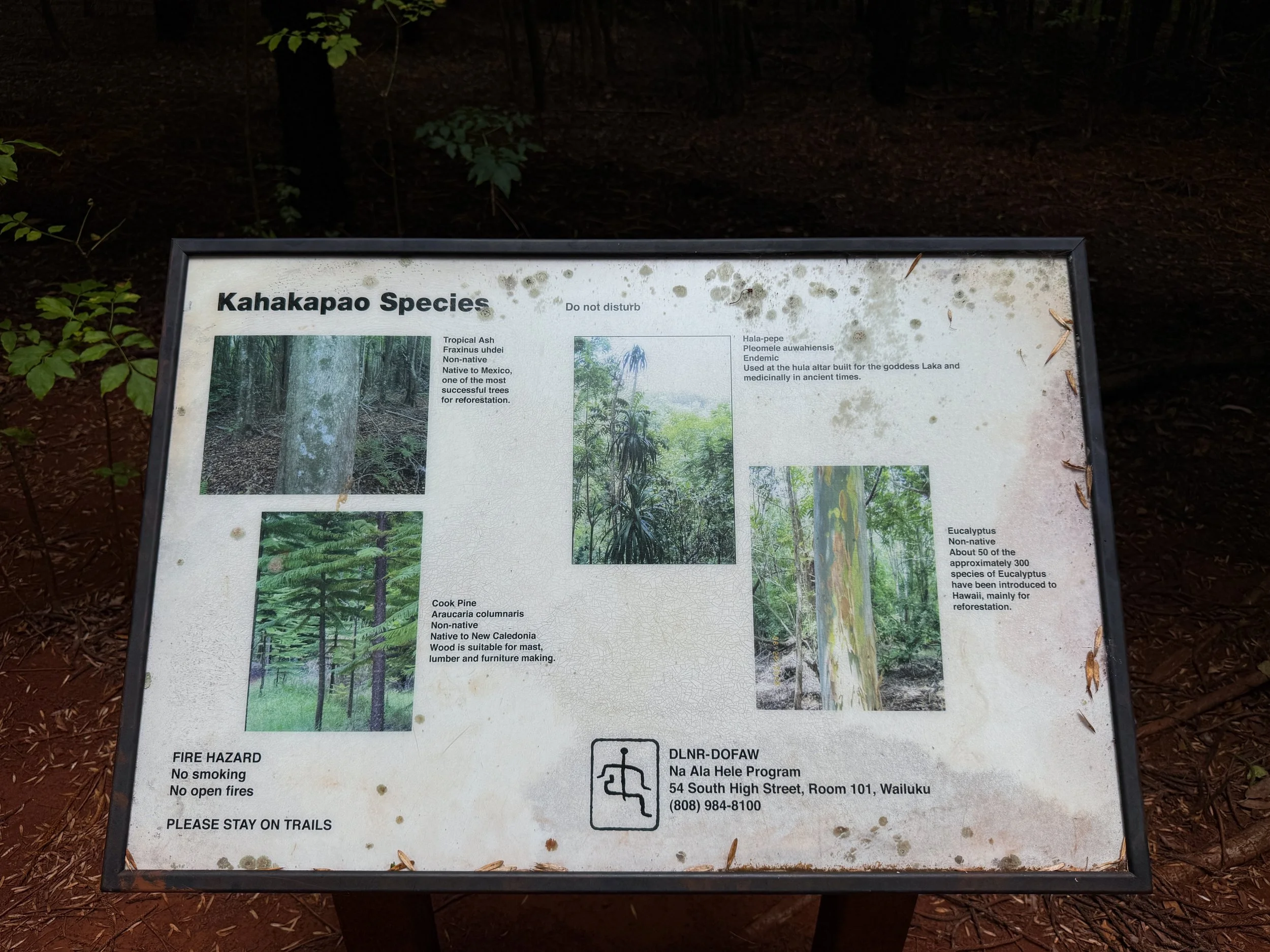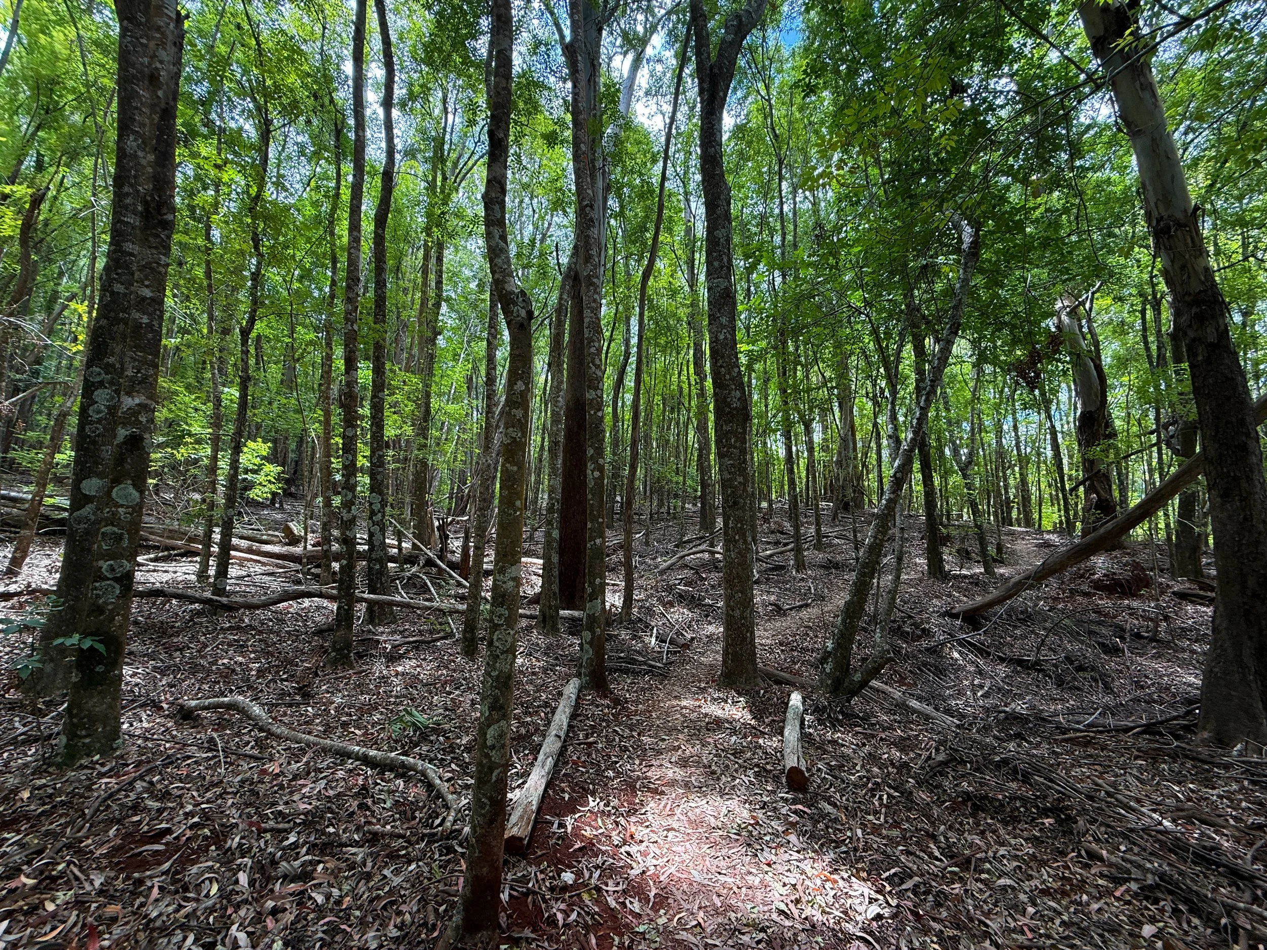On account of the area’s deforestation history, followed by the reforestation of non-native species, the Makawao Forest Reserve consists of mostly non-native, invasive species such as Eucalyptus, Cook Pine, and many Tropical Ash trees.