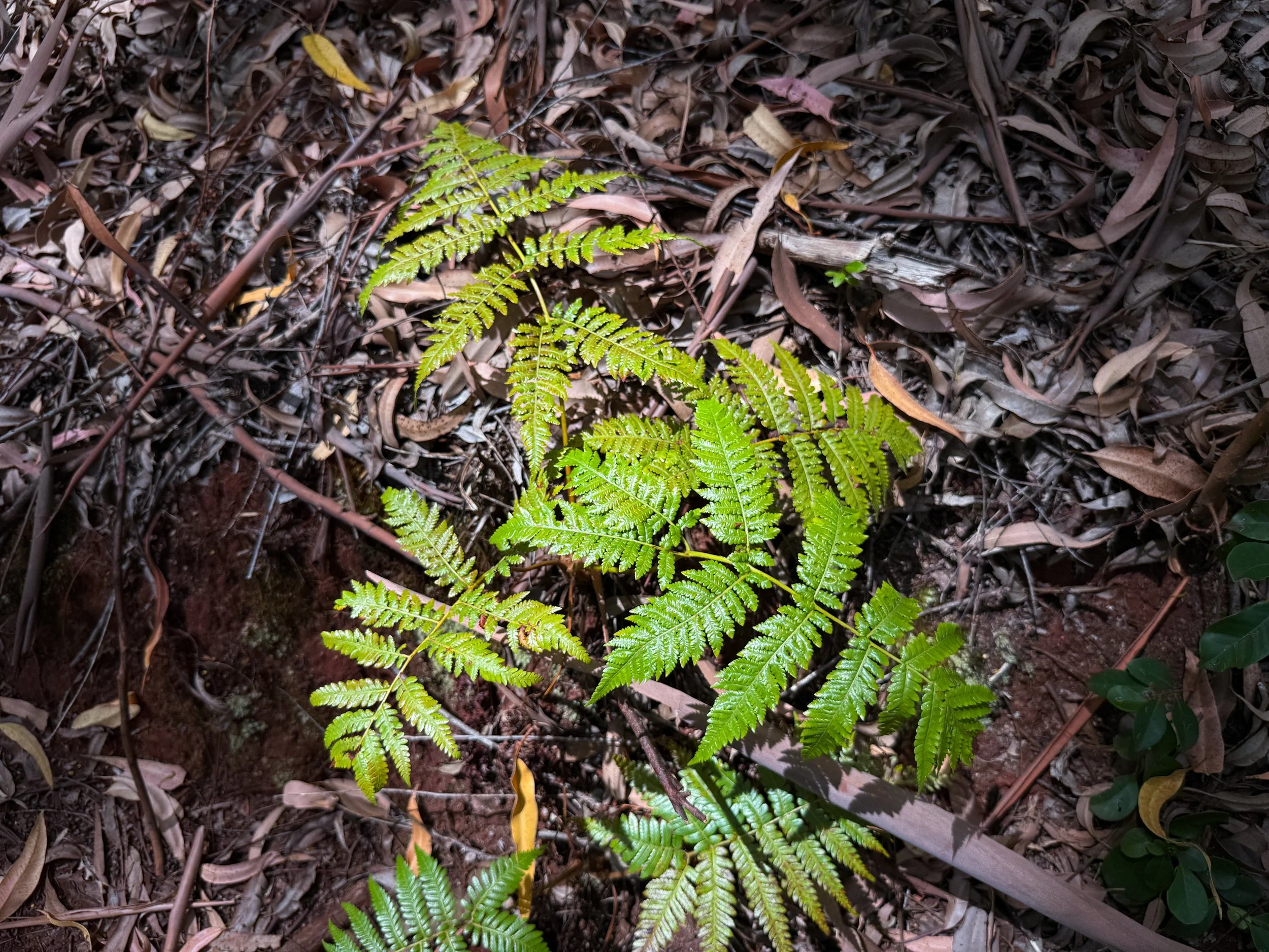 On the east side of the Kahakapao Loop, hikers can find more native Hawaiian plants, like this Palapalai Fern growing in the understory of the Tropical Ash trees, with the beautiful Kupukupu Fern section a short distance ahead!