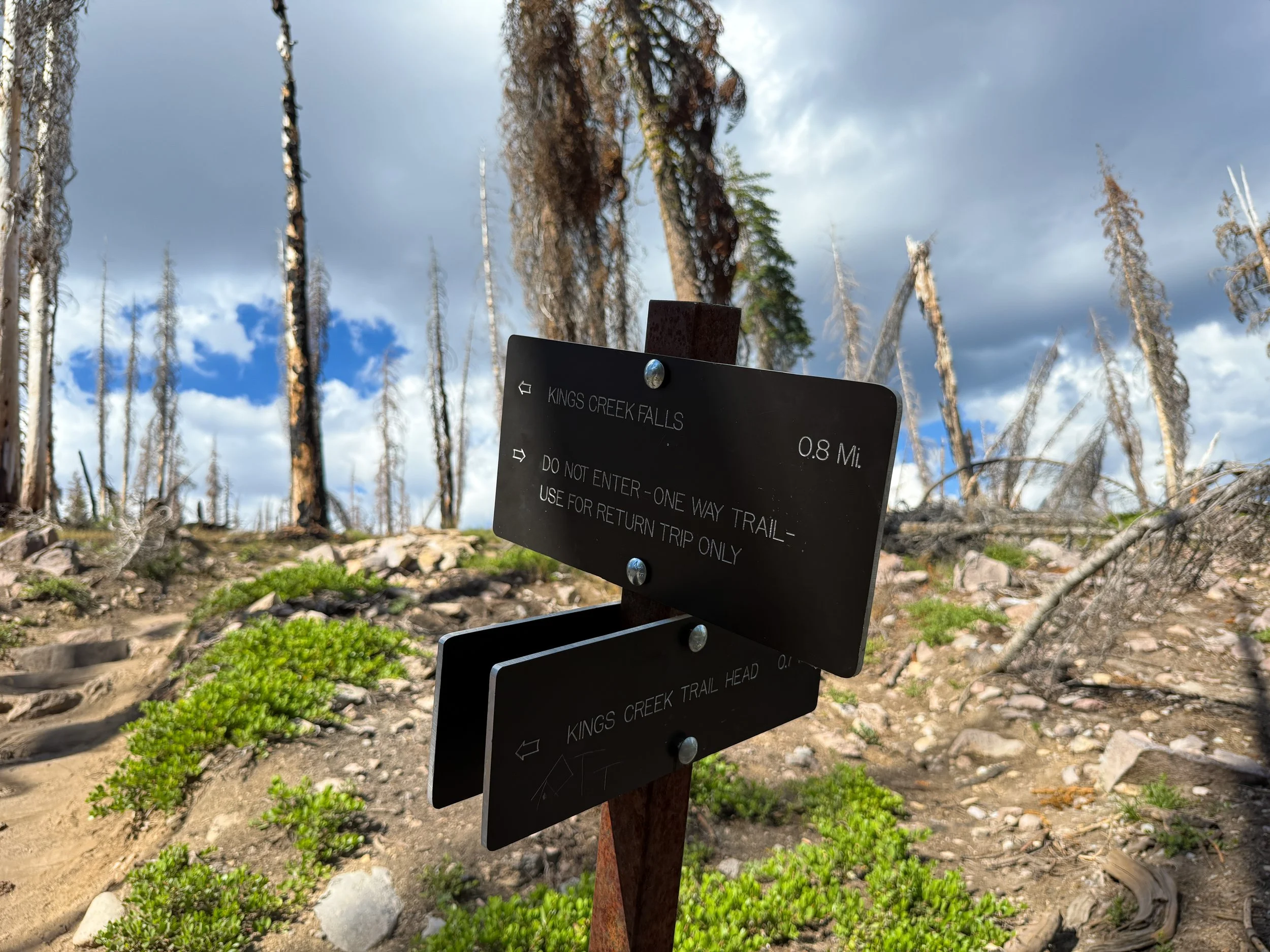 Just a short distance past the meadow, the Kings Creek Falls Trail splits for the first of four times before the waterfall.