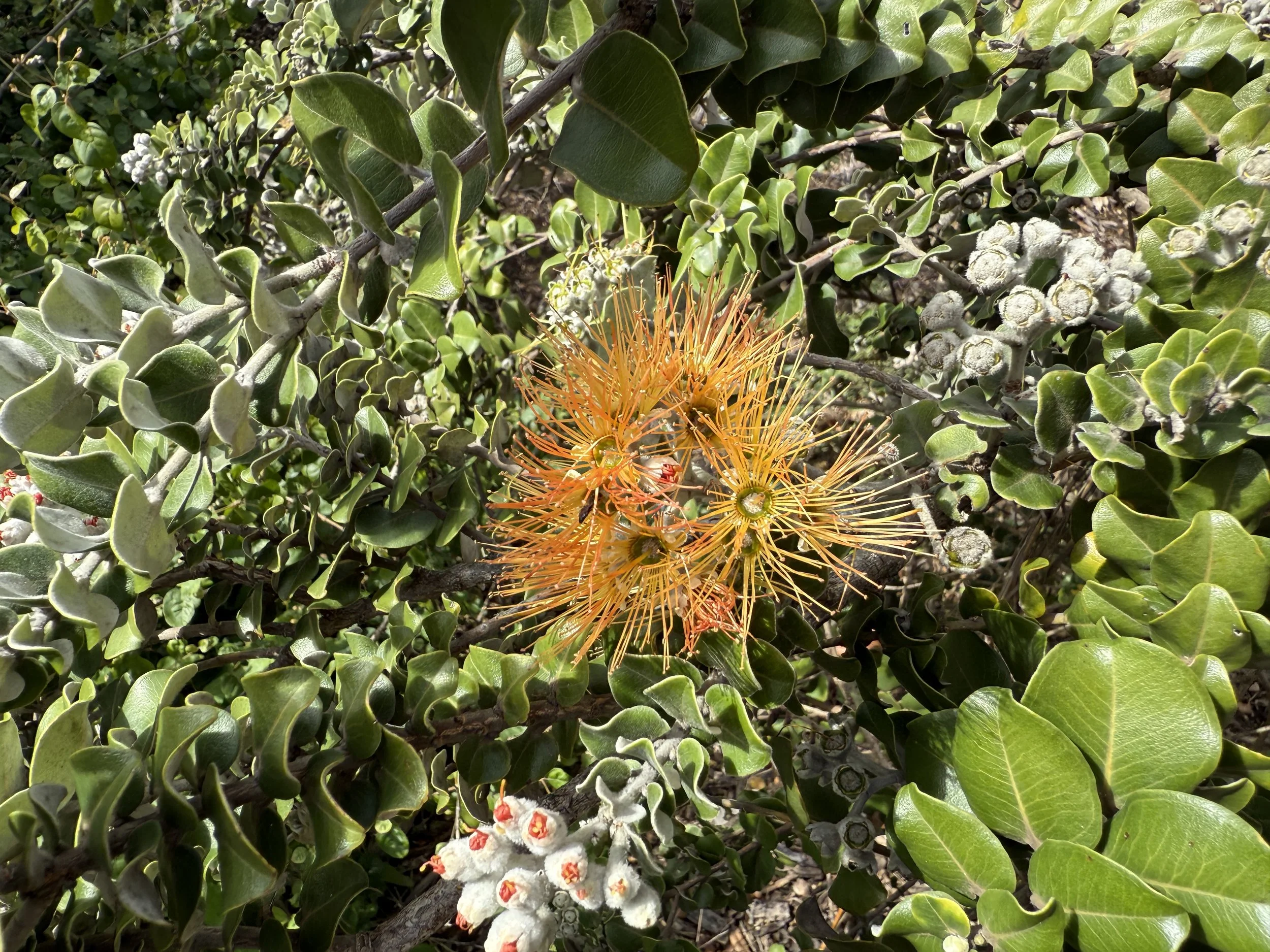 Some of these include Naʻu, ʻAkoko, Maua, Lama, Kokiʻo, Kokiʻo Keʻokeʻo, Kokiʻo ʻUla, Lonomea, Wiliwili, Loulu, Maʻo, and Pua Kala—to truly name just a few of the common and not-so-common native plants along the trail.