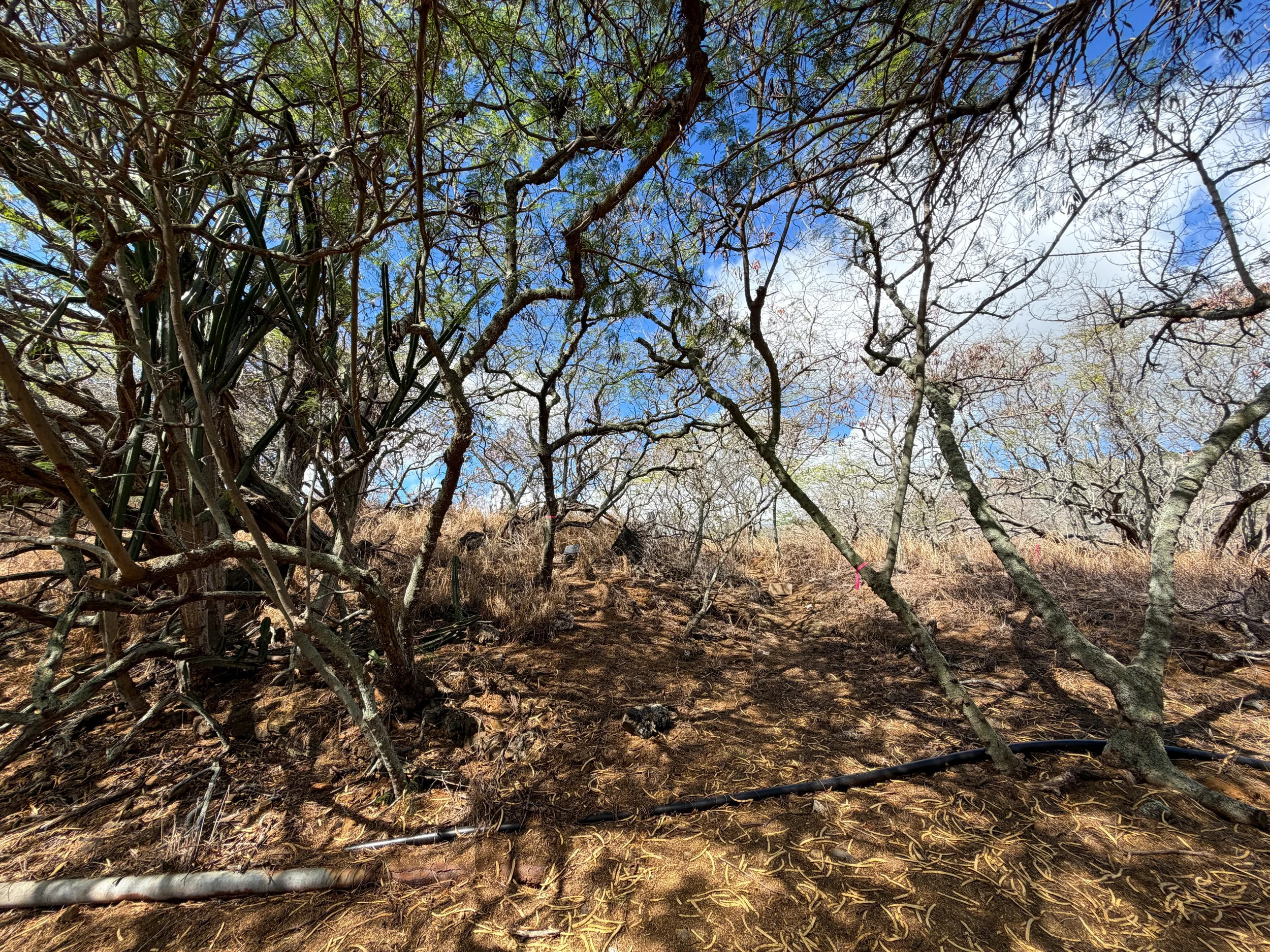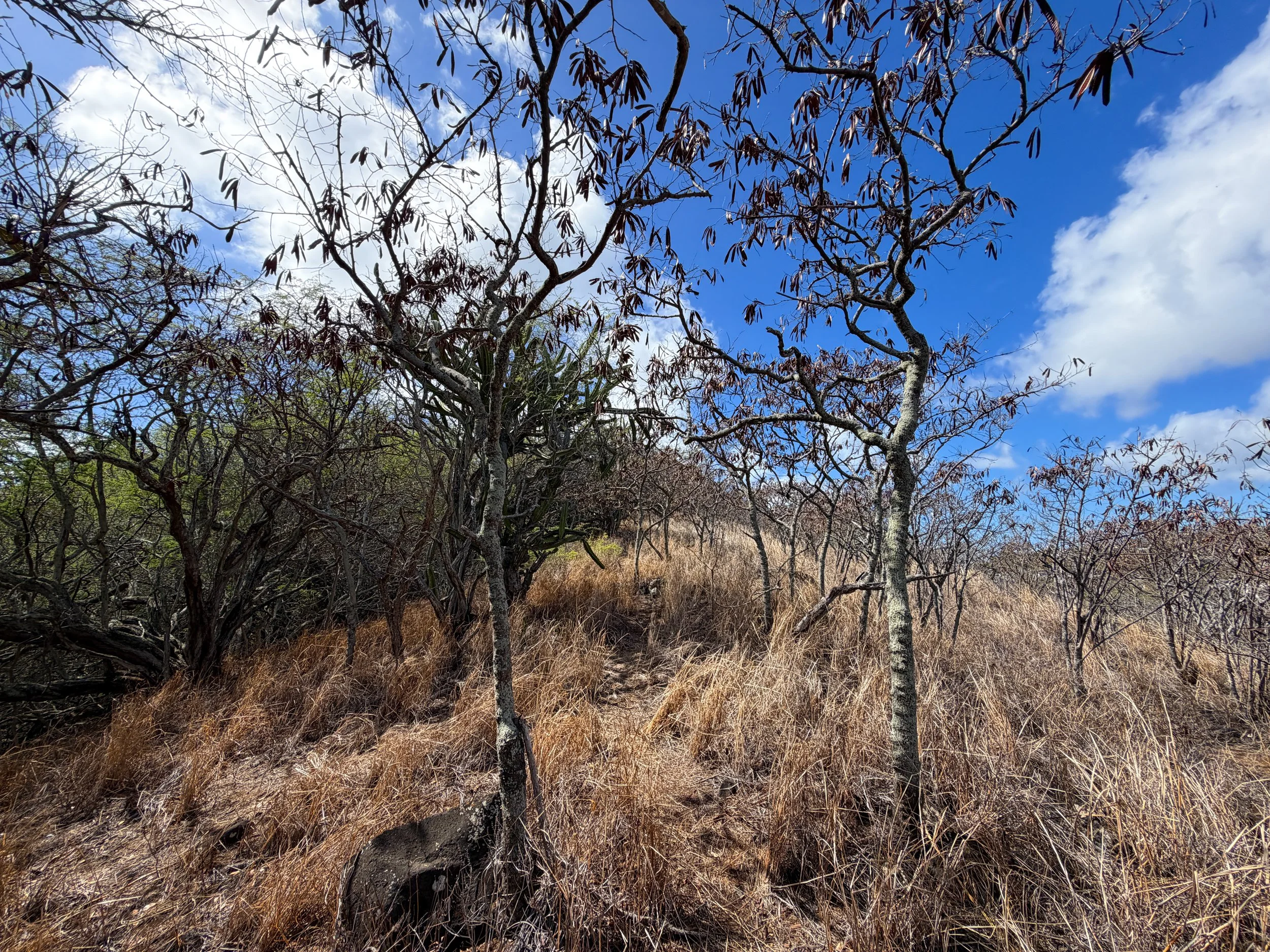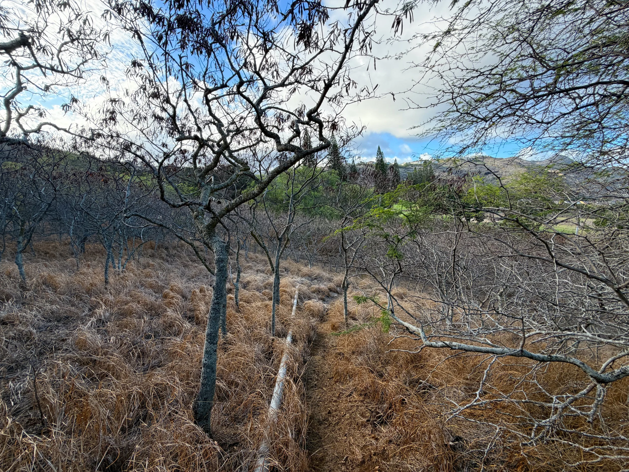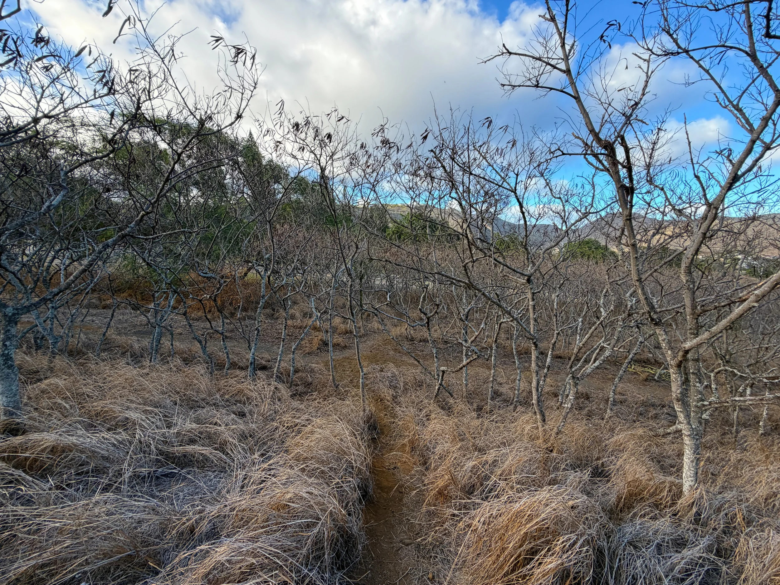 Outside the Koko Crater Botanical Garden Loop on the inside of Koko Crater, the vast majority of the landscape is dominated by invasive grasses and Koa Haole trees.