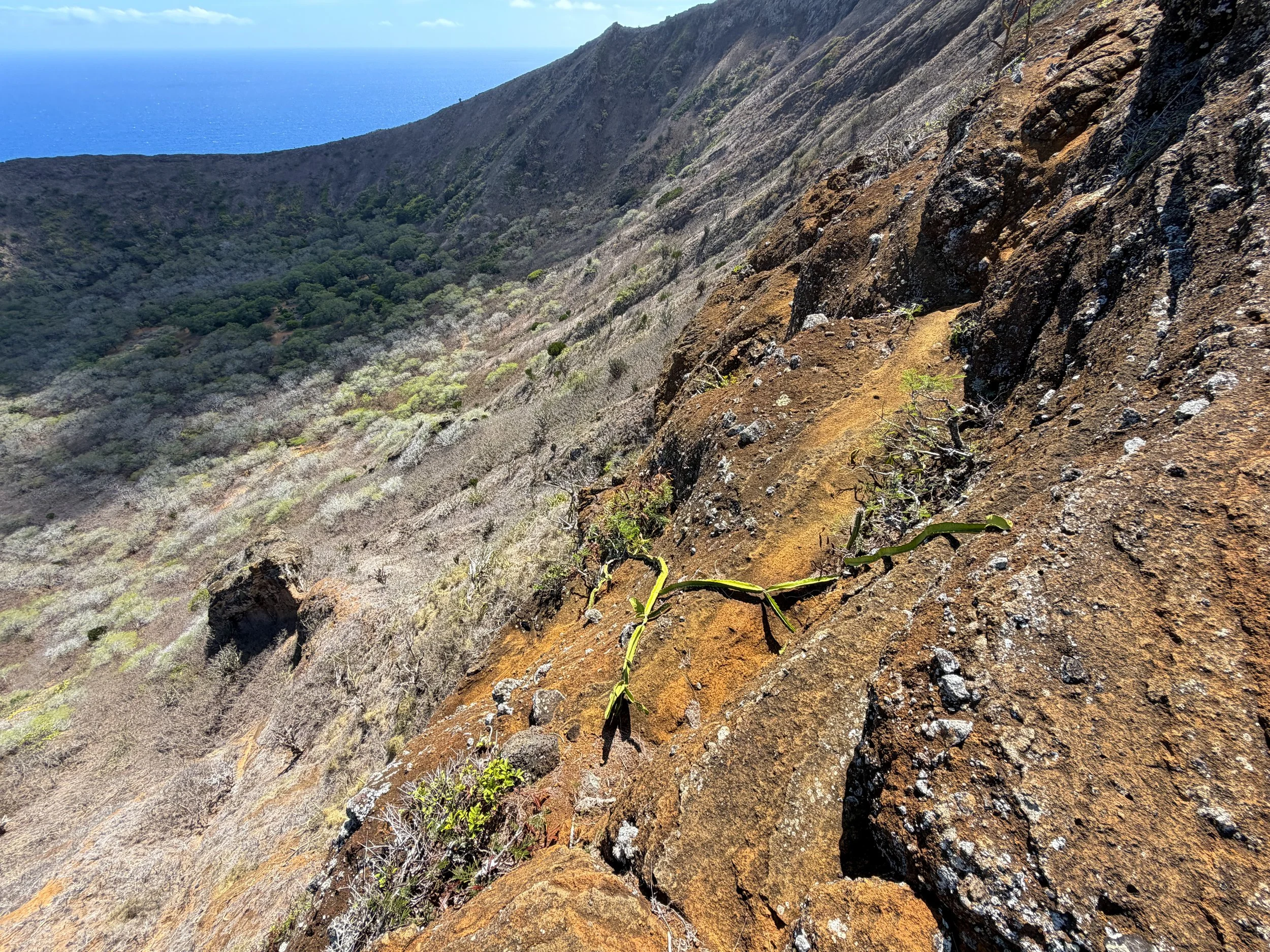 It is there that the Koko Crater Rim Trail begins a final, steep descent to return to the Koko Crater Botanical Garden, which is notably steeper than the beginning of the loop on the north side.