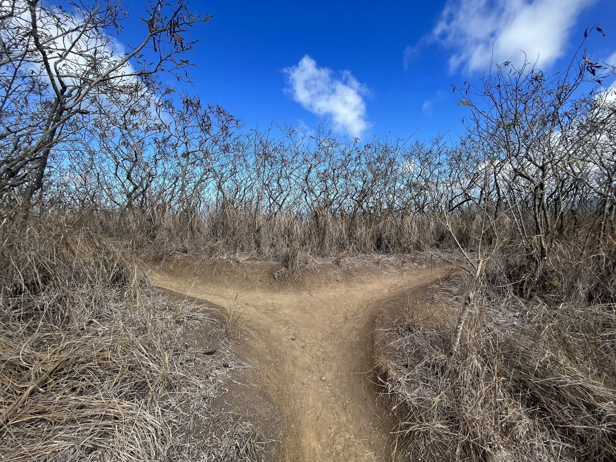 That said, both routes lead to the same place just up the hill, but the trail to the left leads toward the fourth and least trafficked route on Kaʻiwa Ridge, which I will explain in more detail at the end.