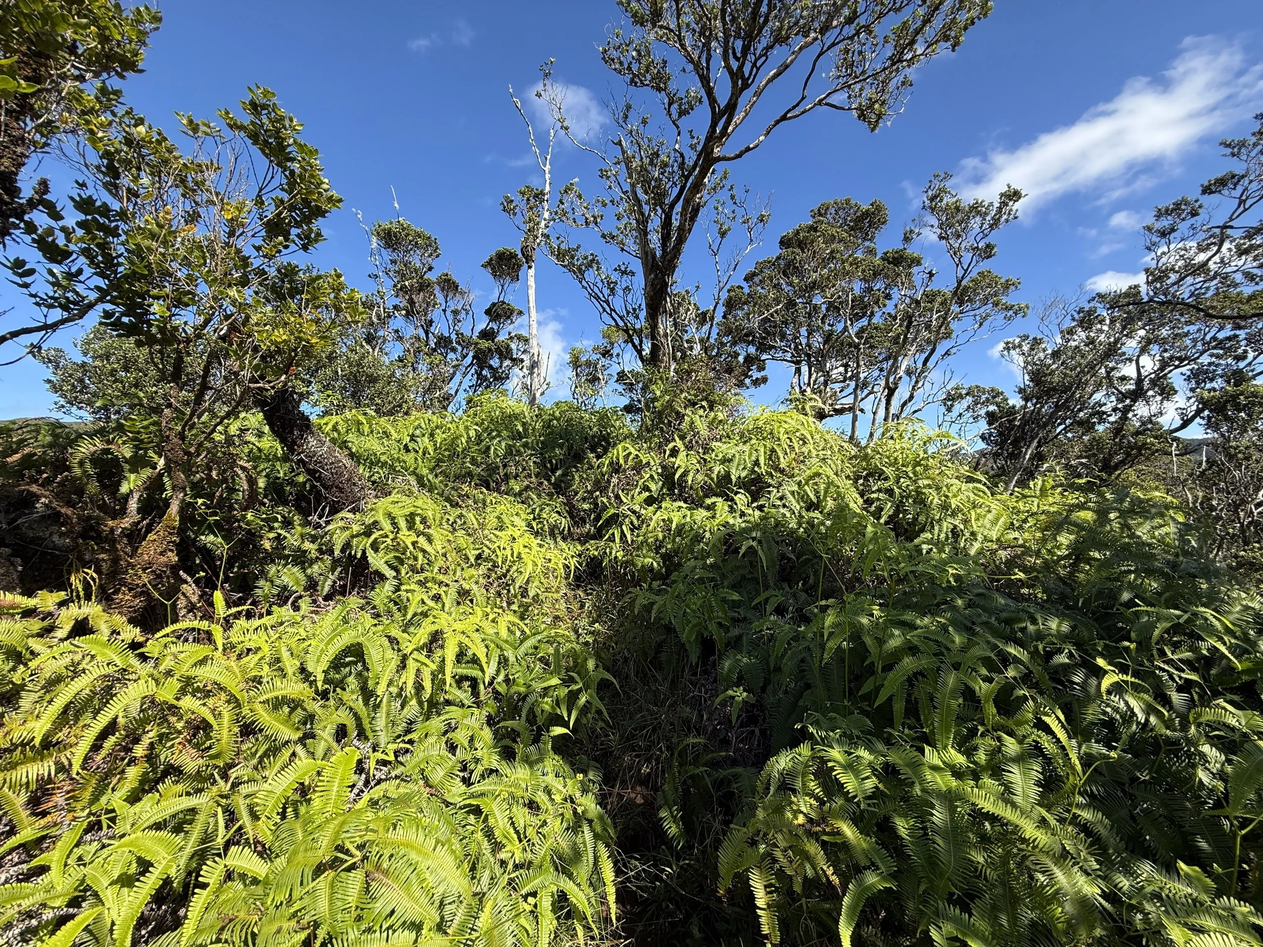 This is the top of the hill, where the Mānana Ridge Trail continues the long, slow trek through the Uluhe to the Koʻolau Summit.