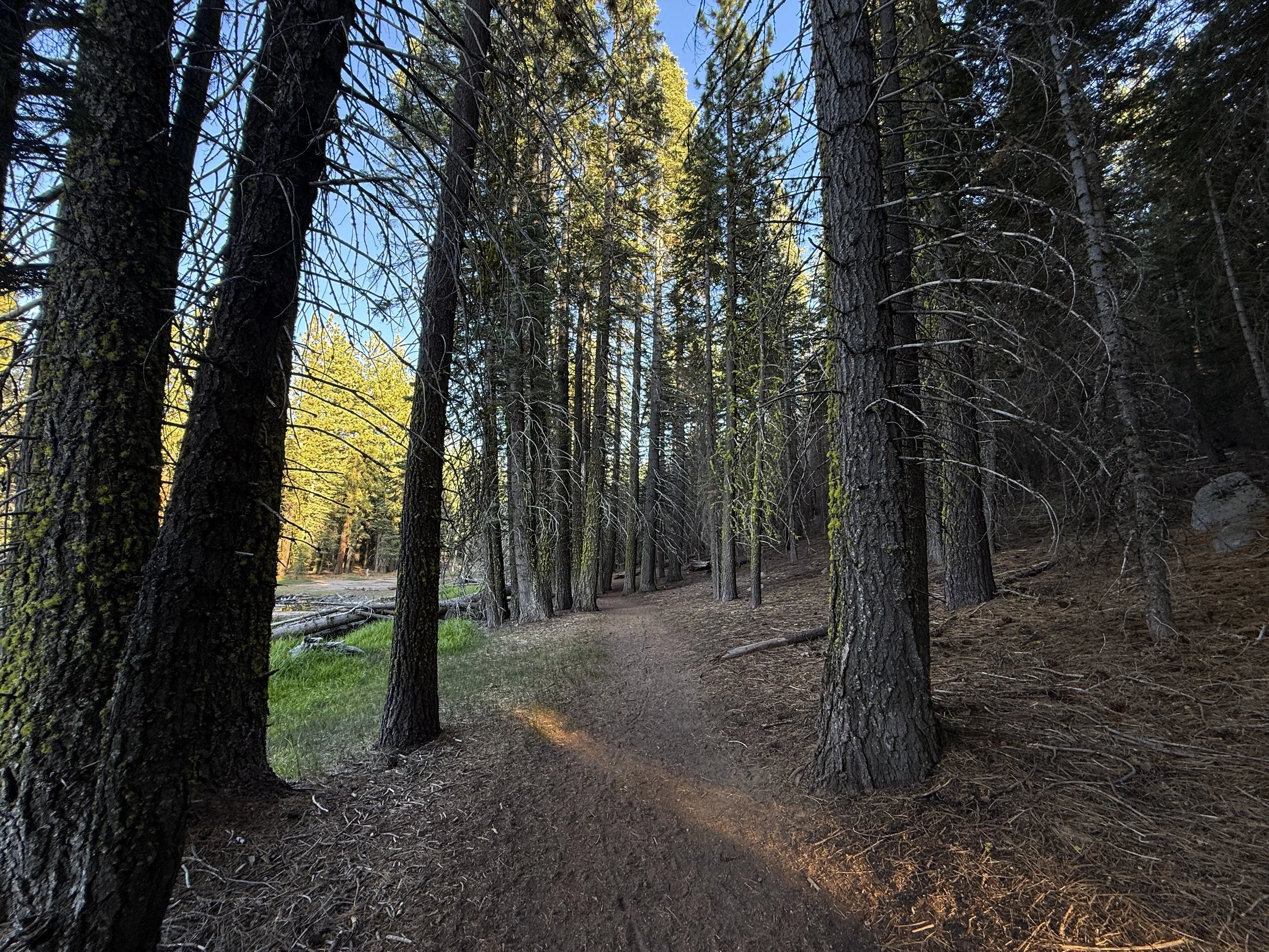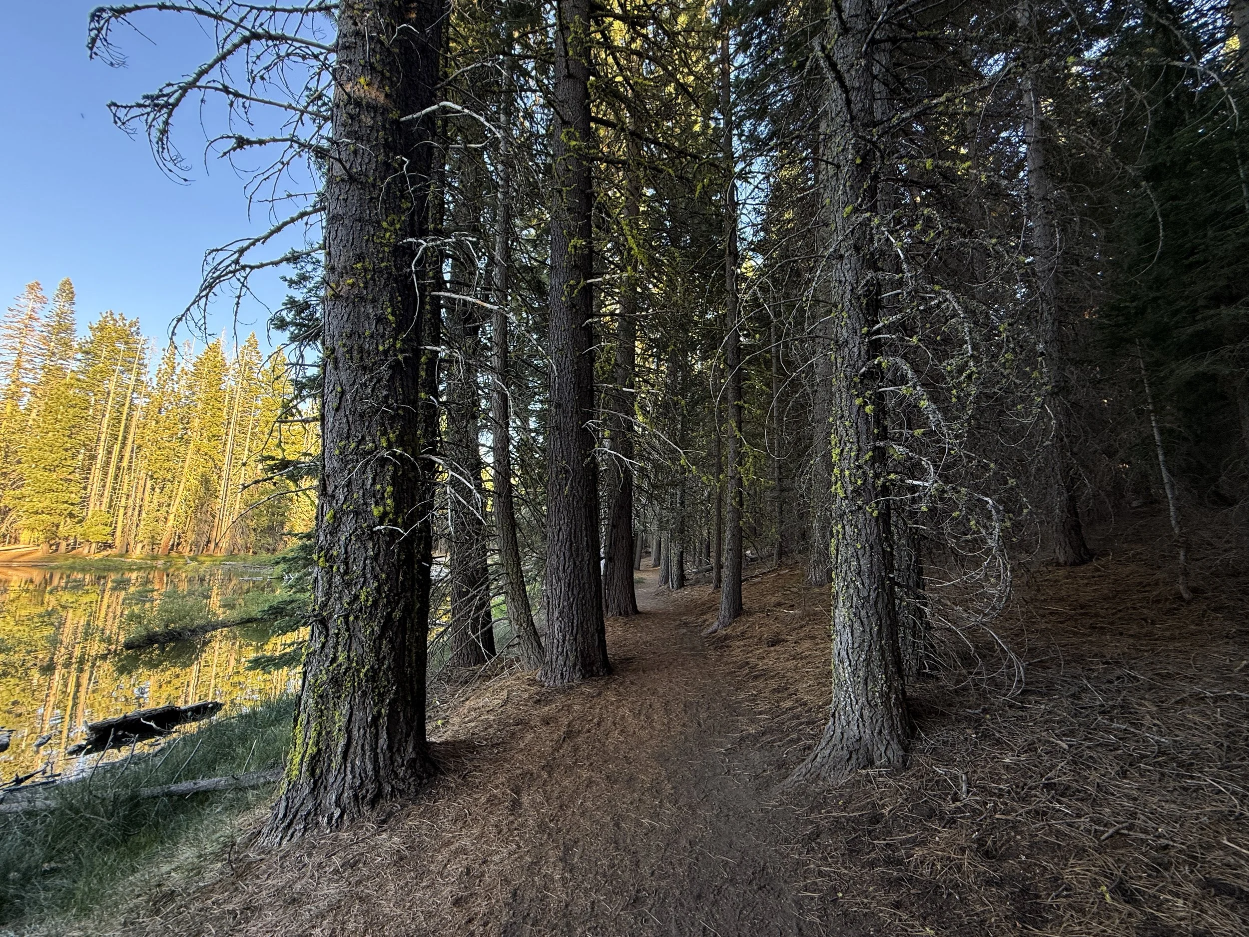 Just before the Manzanita Lake Trail reaches the junction for the Manzanita Lake Campground, the trail splits twice, back to back.