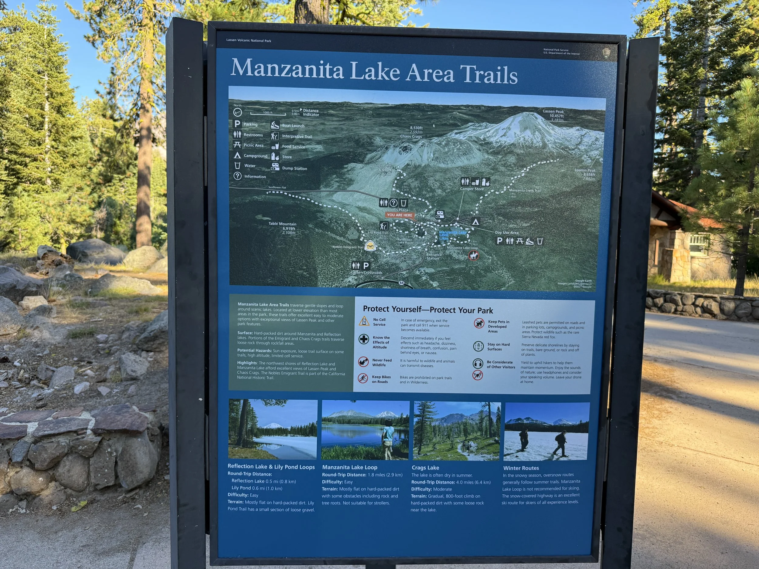While the Manzanita Lake Trail can begin from any number of points along the loop, this article is written from the Manzanita Lake Trailhead at the Loomis Ranger Station.