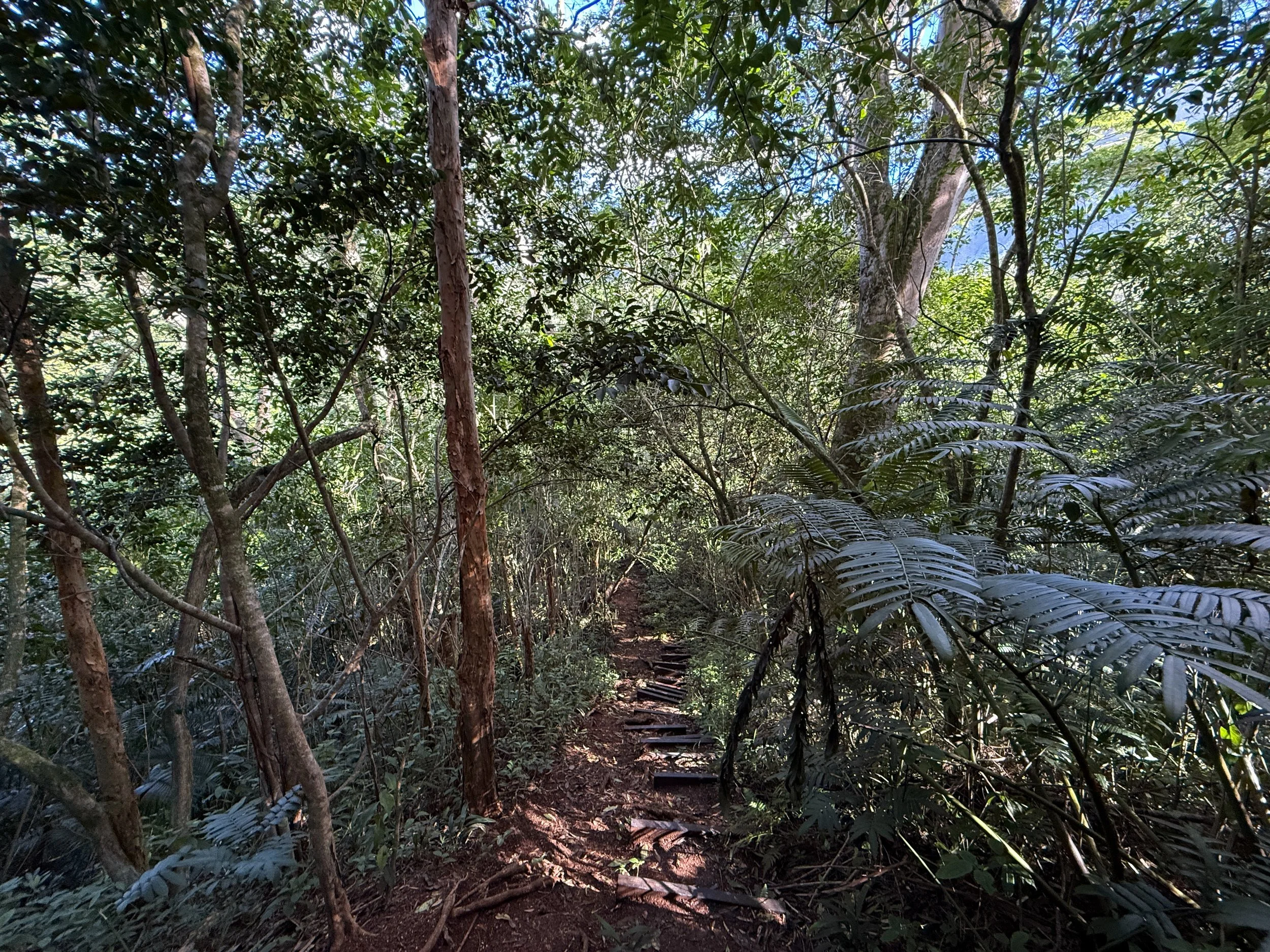 After descending about 0.5 miles (0.8 km), the Maunawili Falls Trail will level out significantly—a nice sign that the ridge is nearing the bench where the stairs lead down to the Maunawili Stream.