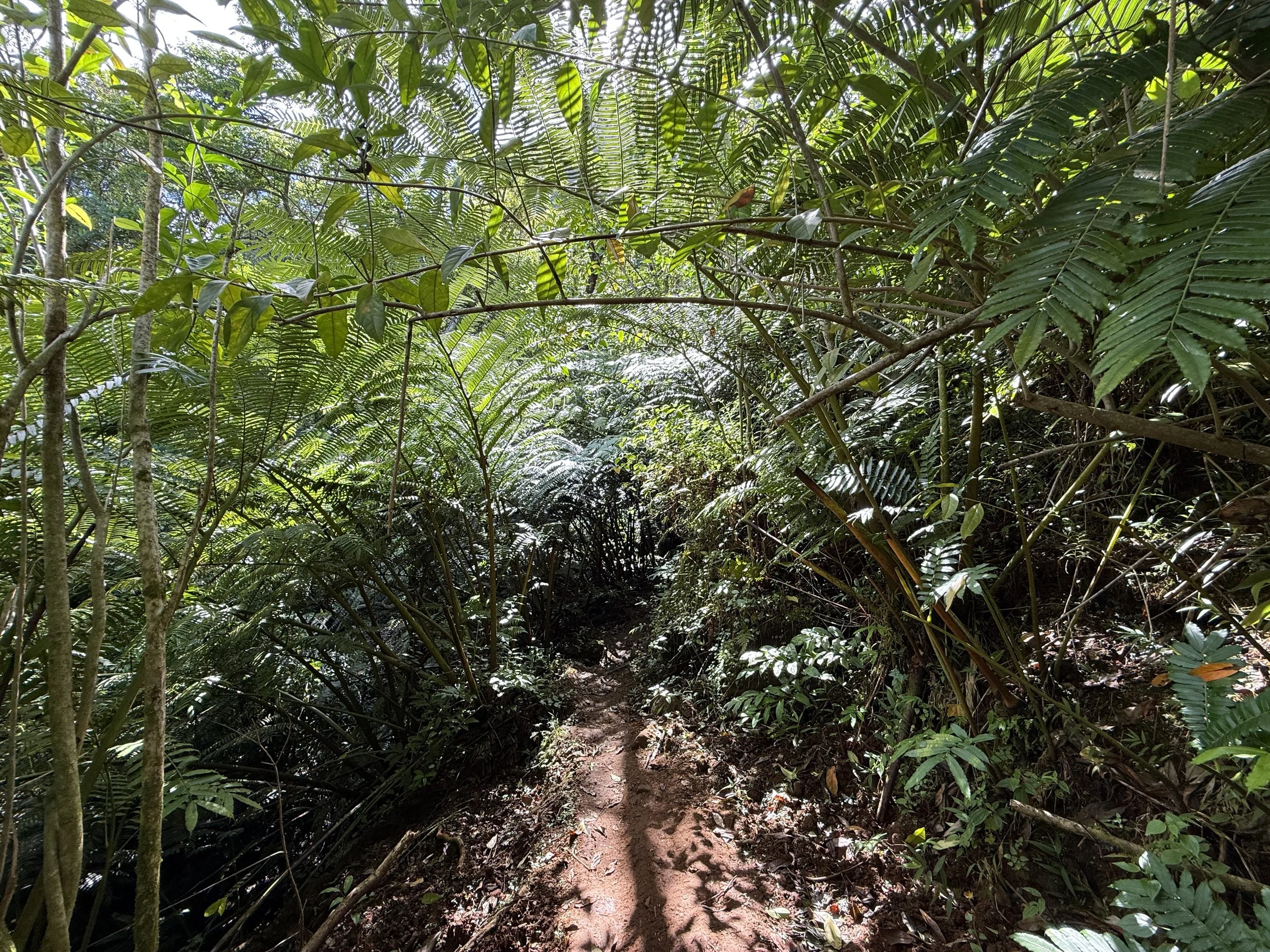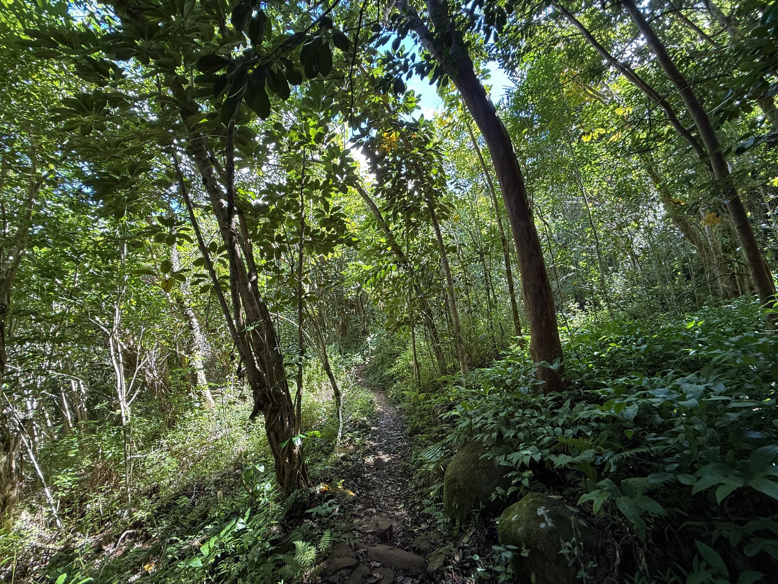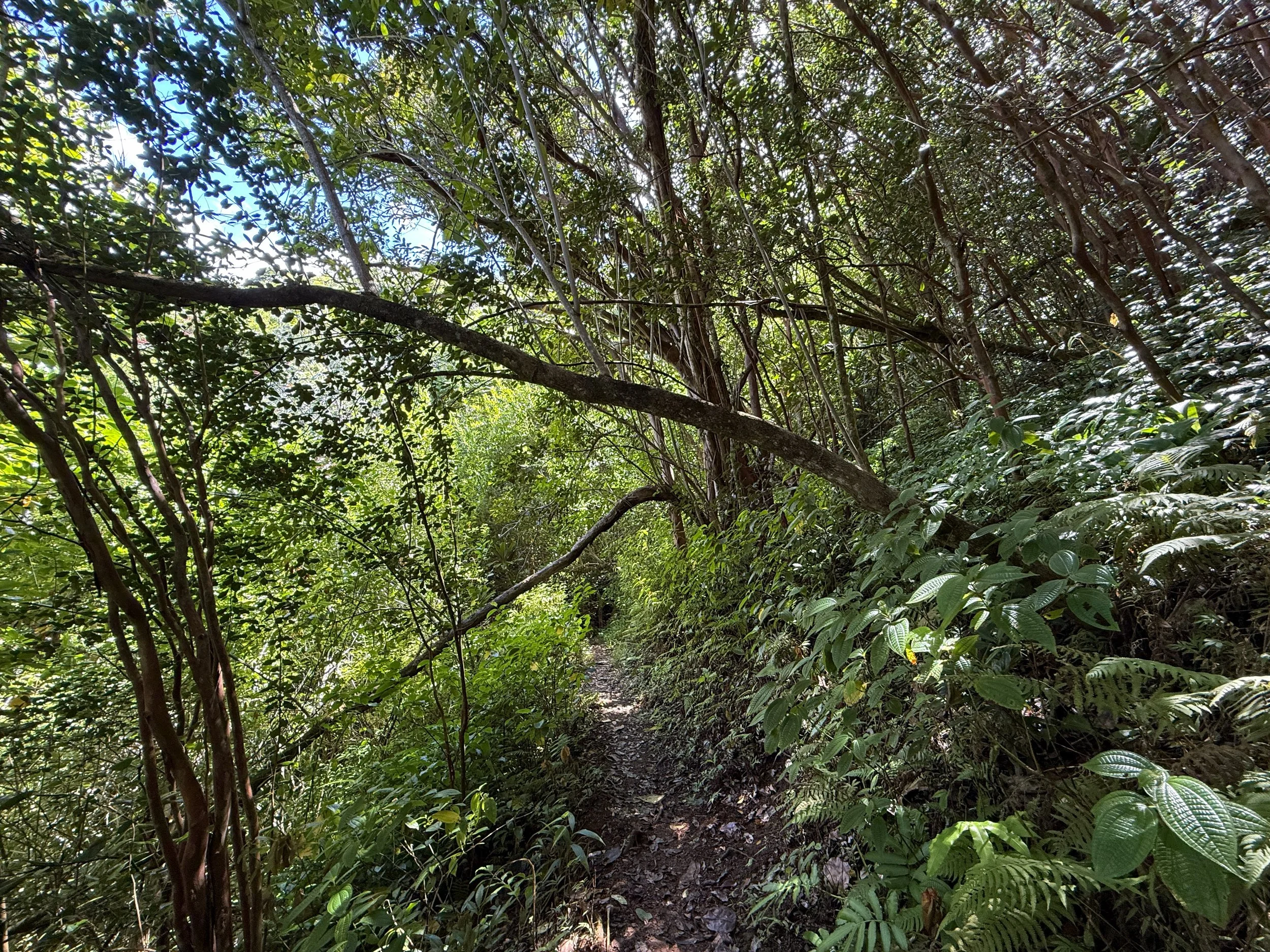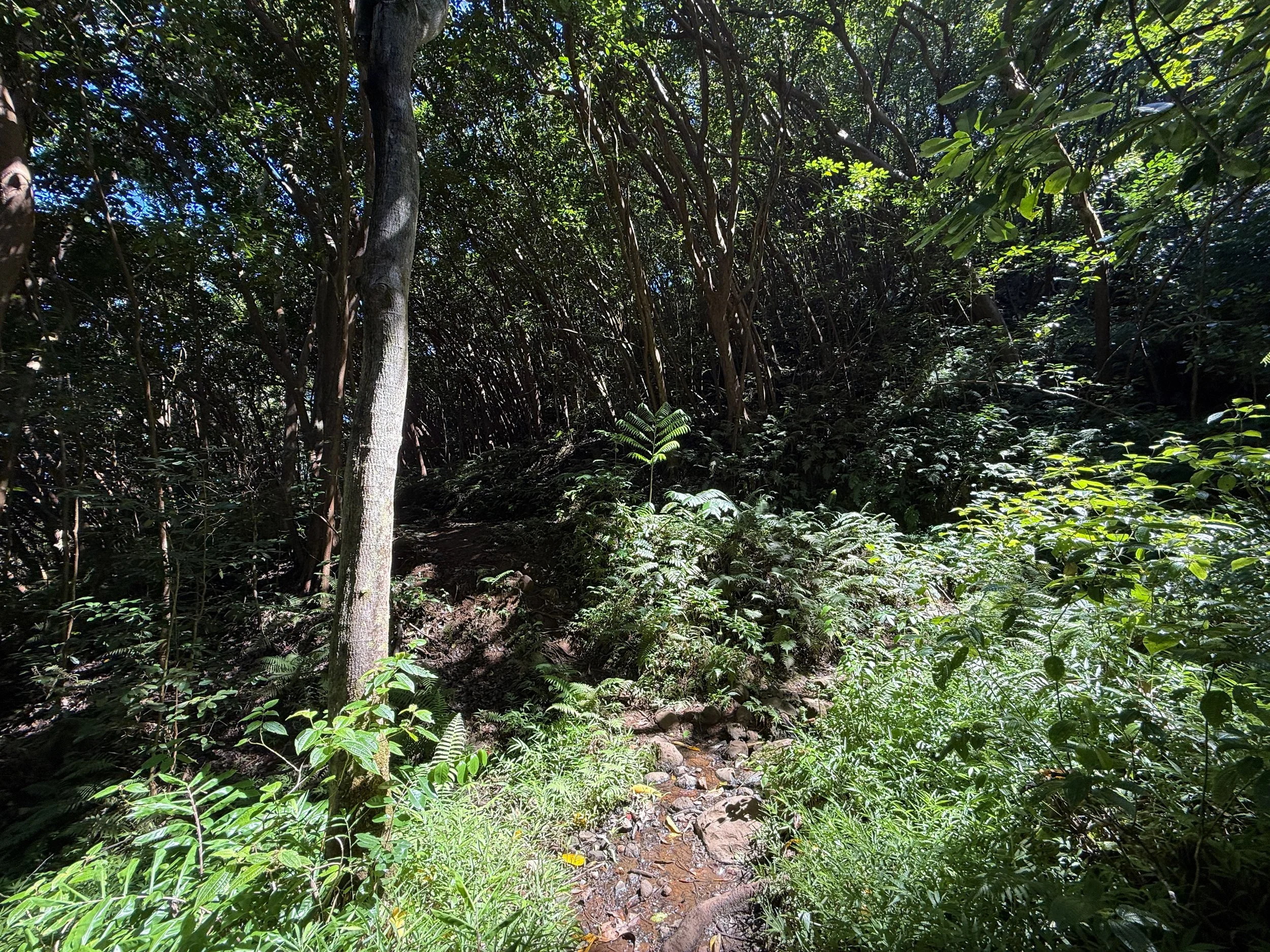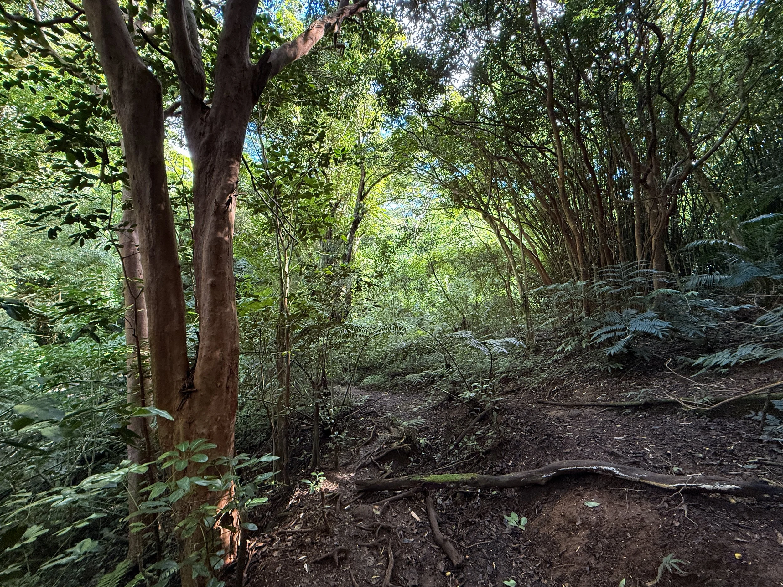 This short stretch along the base of Kōnānuanui is a perfect example of how the sun, moving over the ridge in the afternoon, makes the Maunawili Demonstration Trail much darker than it would be otherwise.
