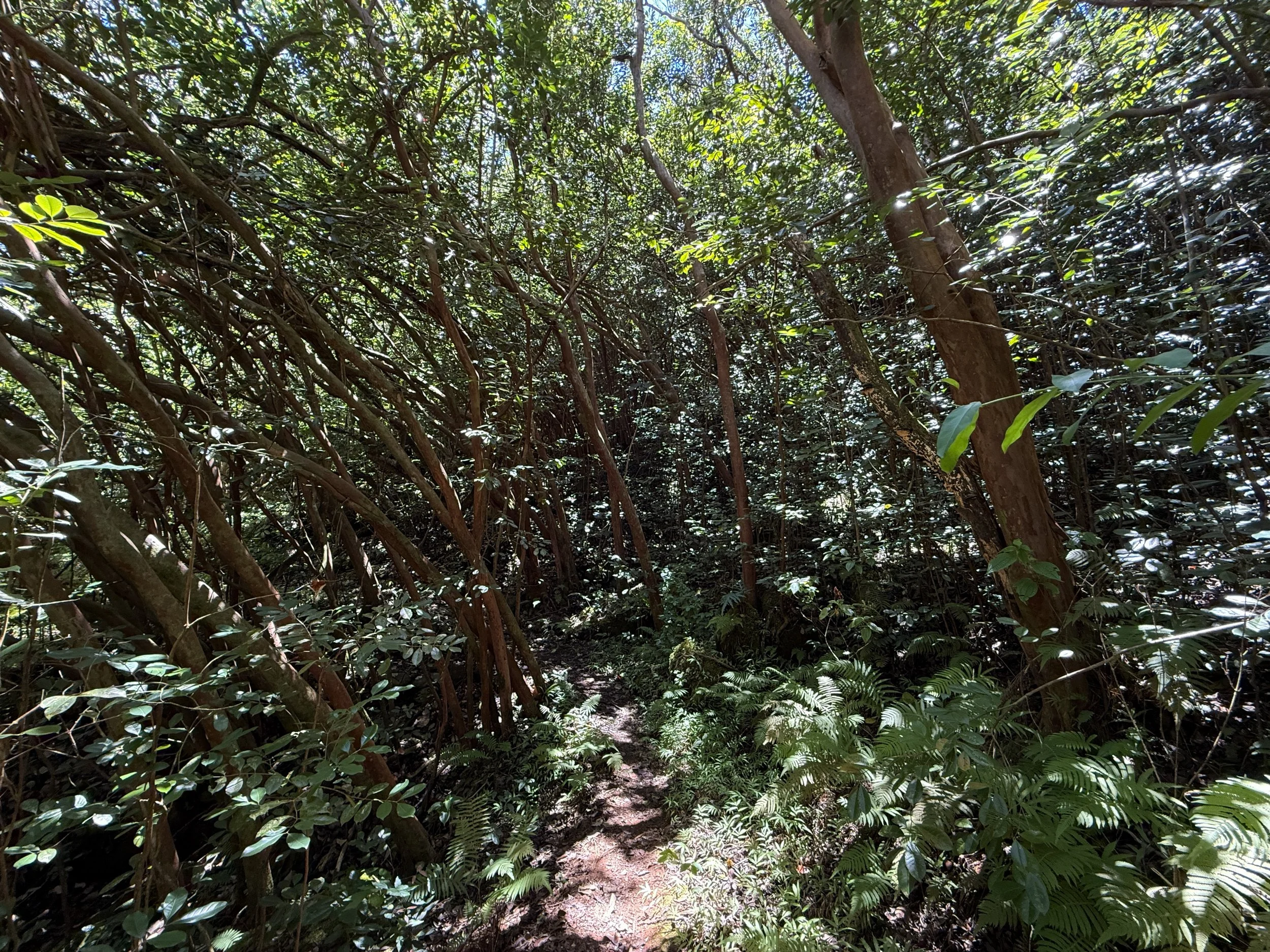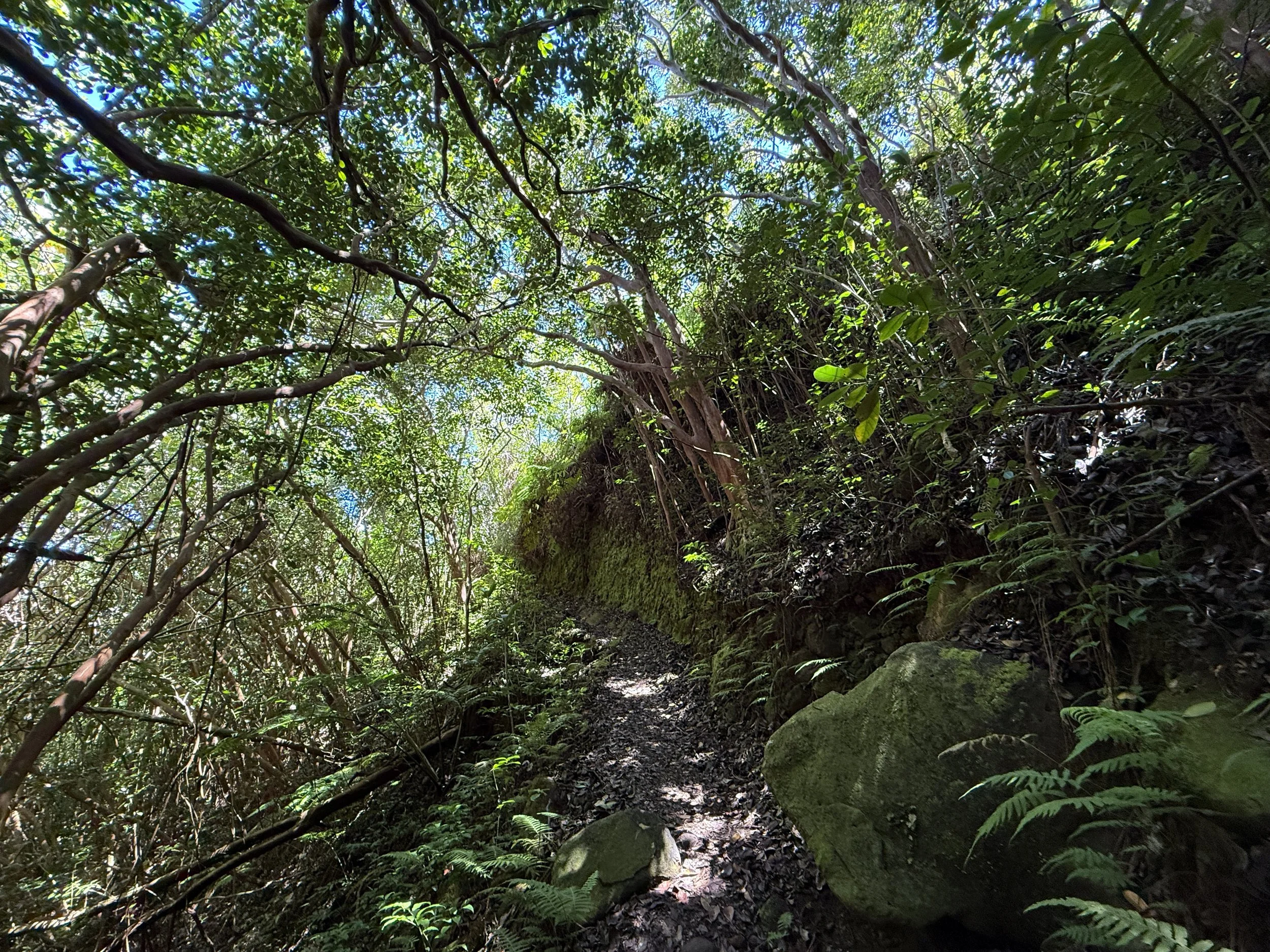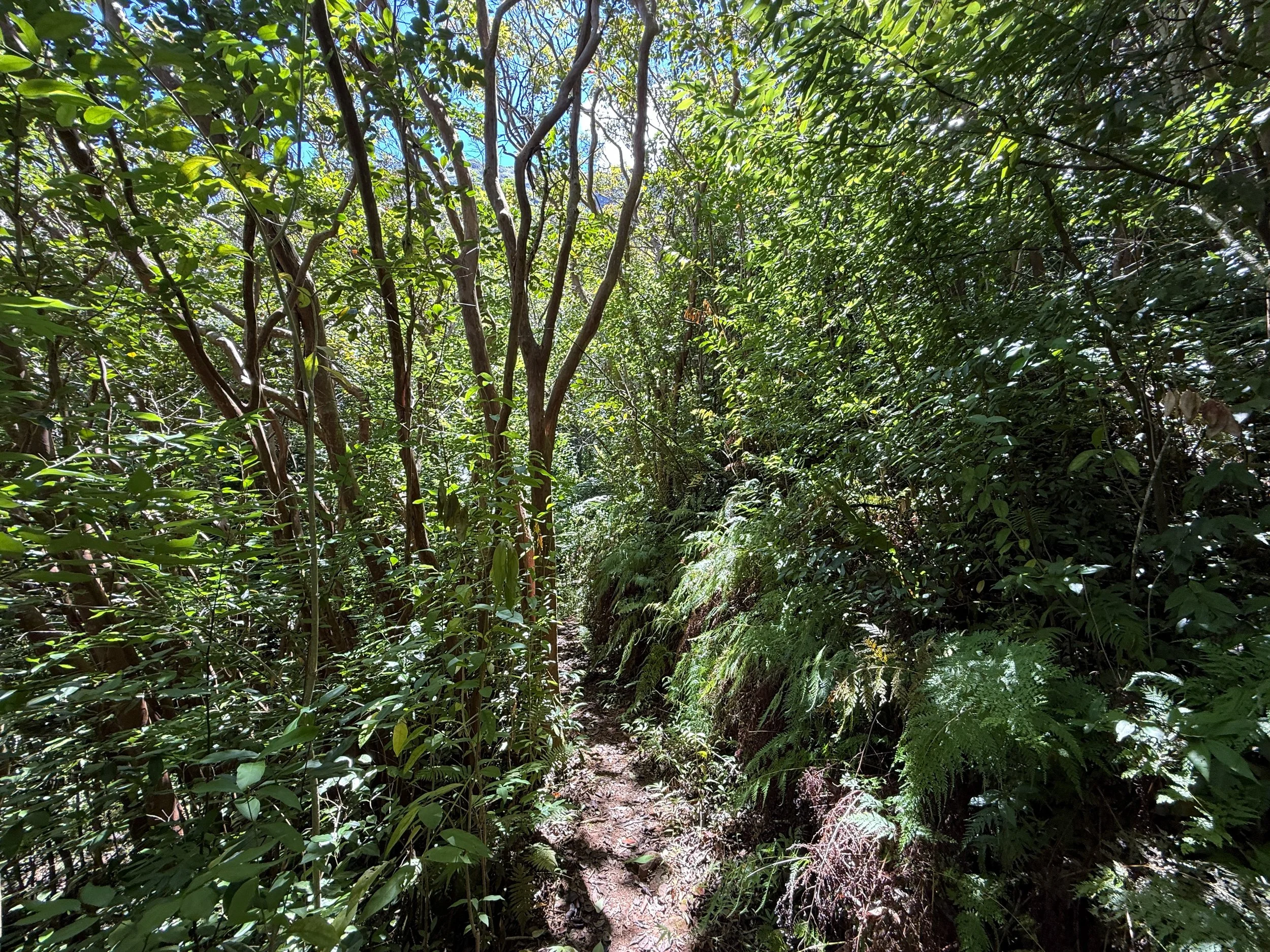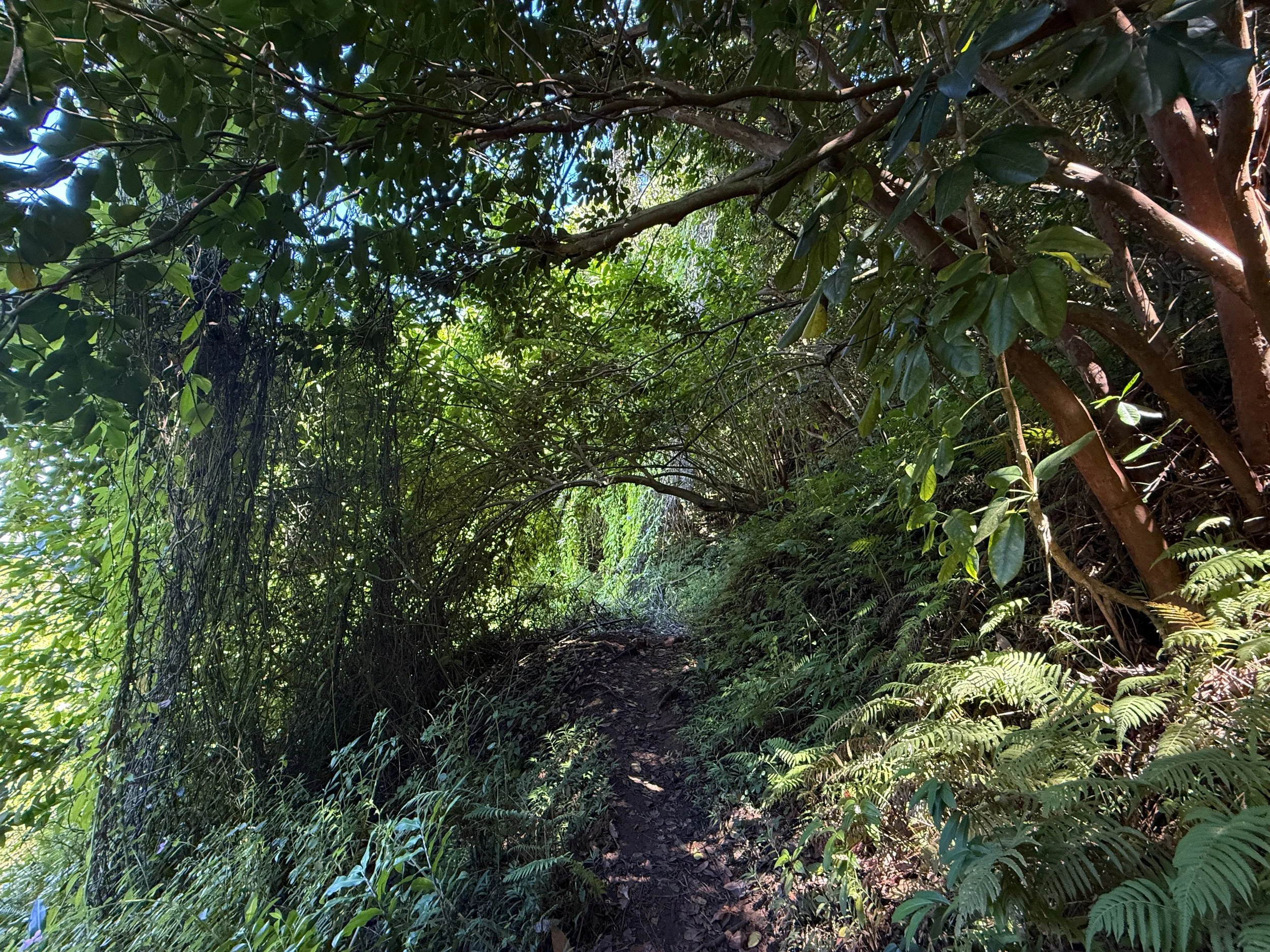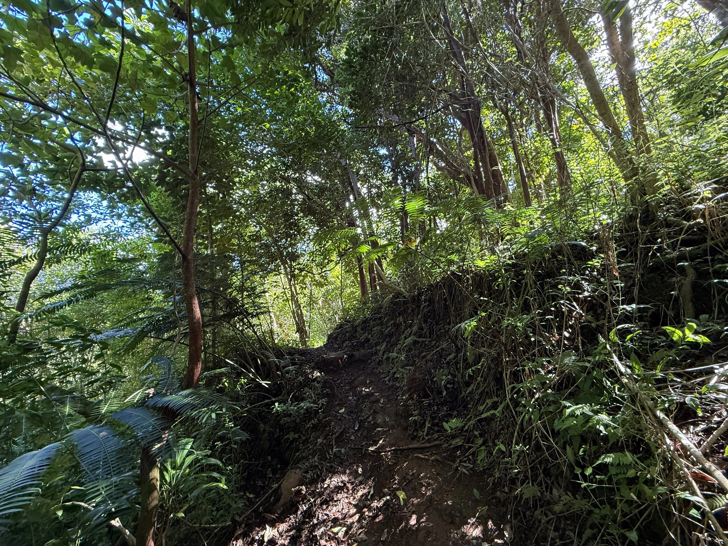 This short stretch along the base of Kōnānuanui is a perfect example of how the sun, moving over the ridge in the afternoon, makes the Maunawili Demonstration Trail much darker than it would be otherwise.
