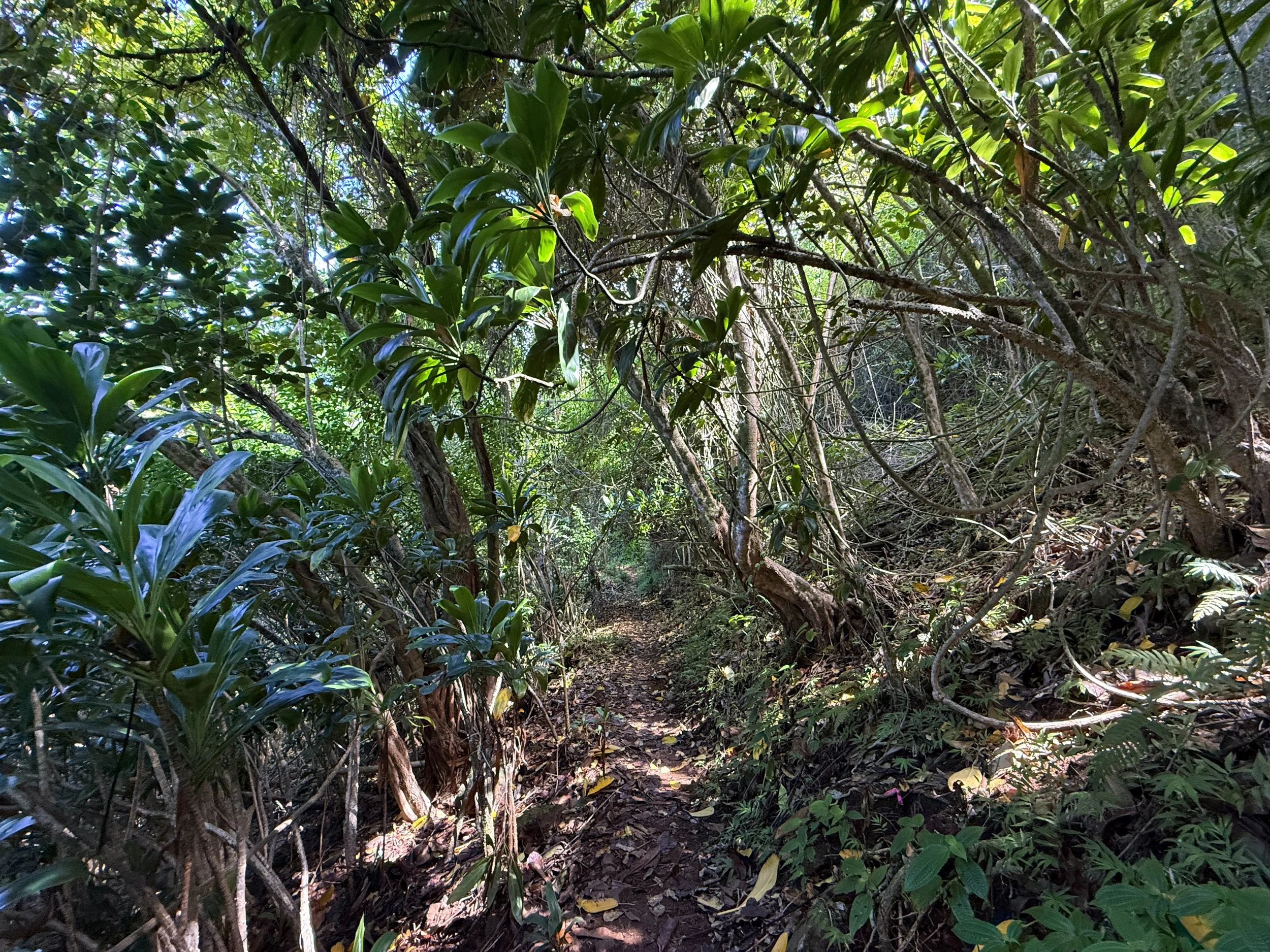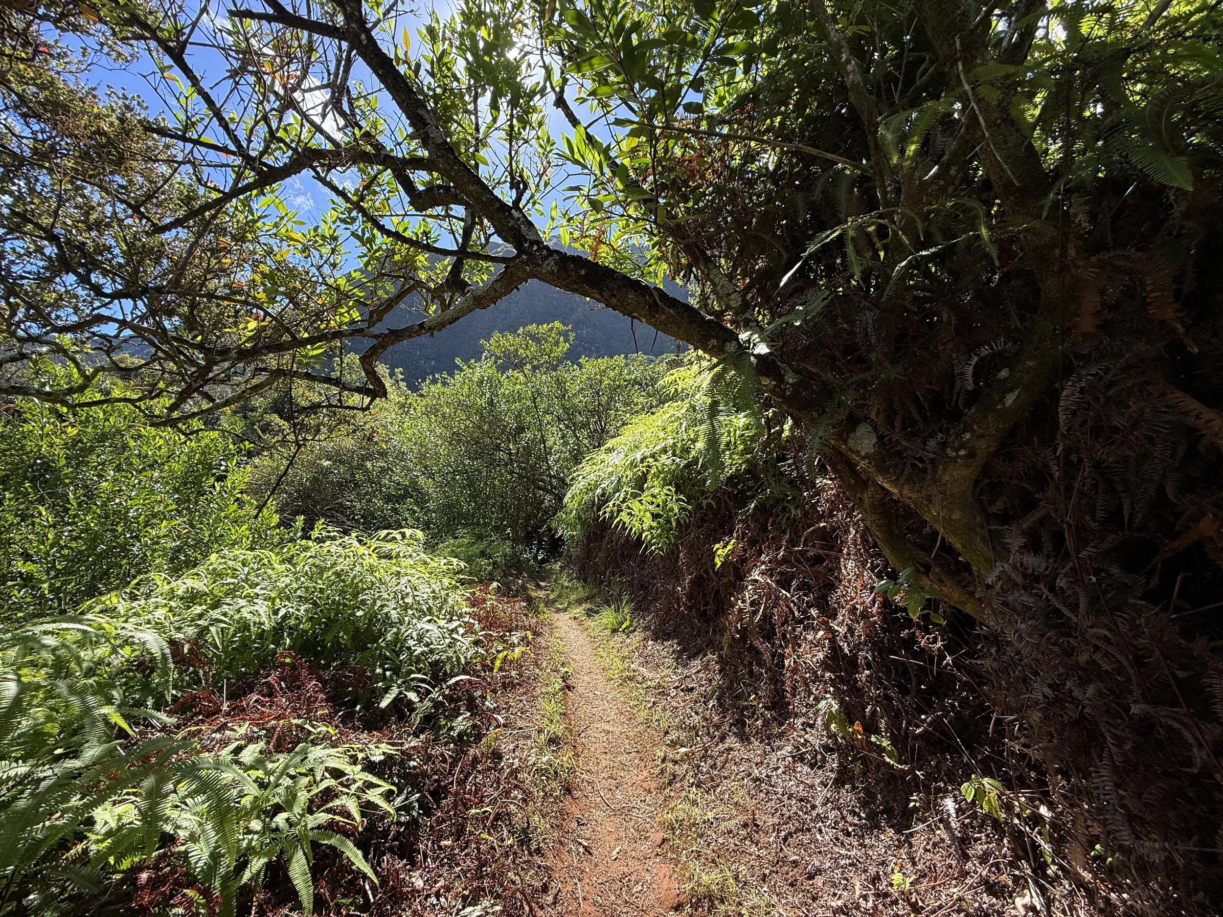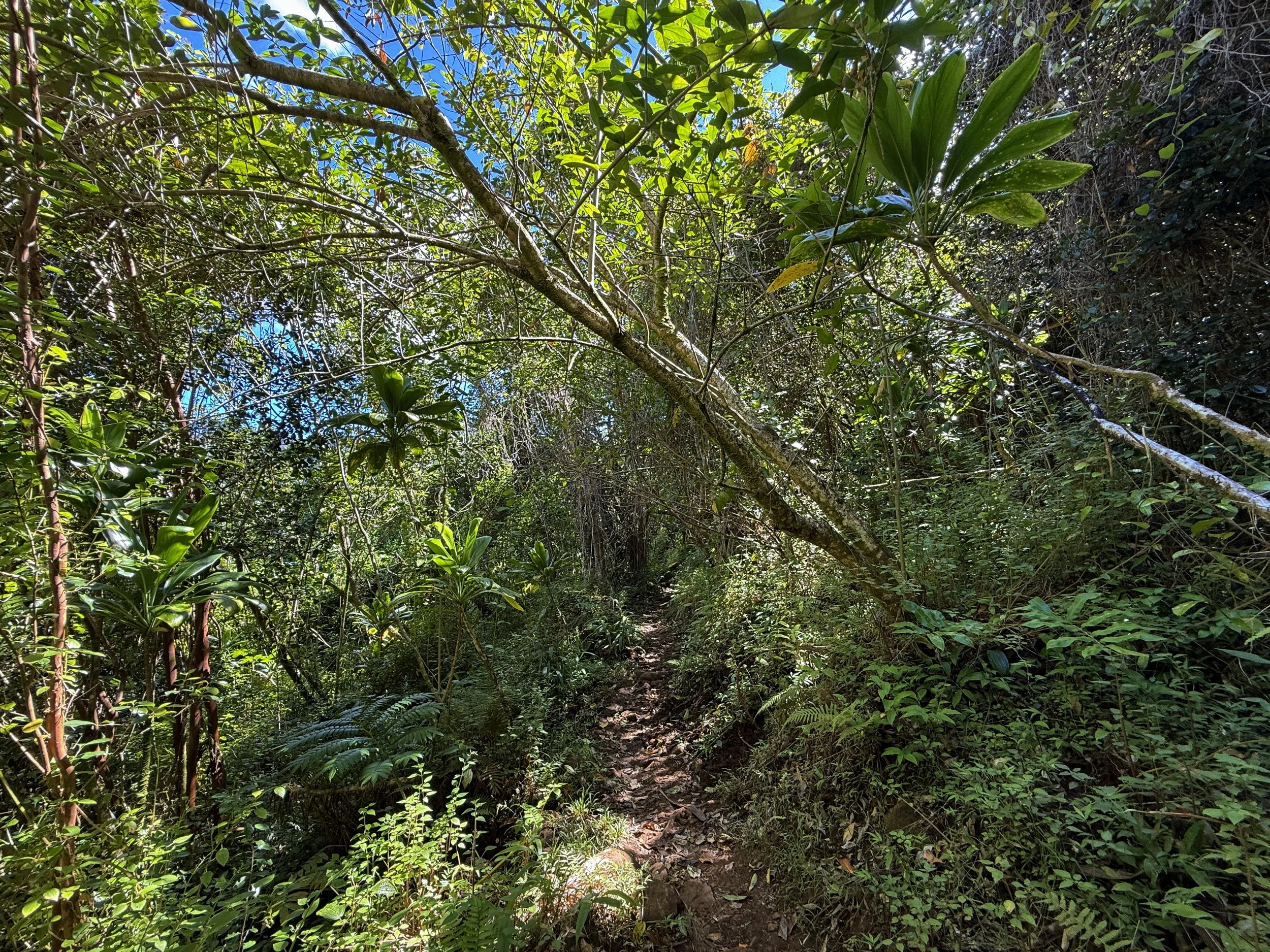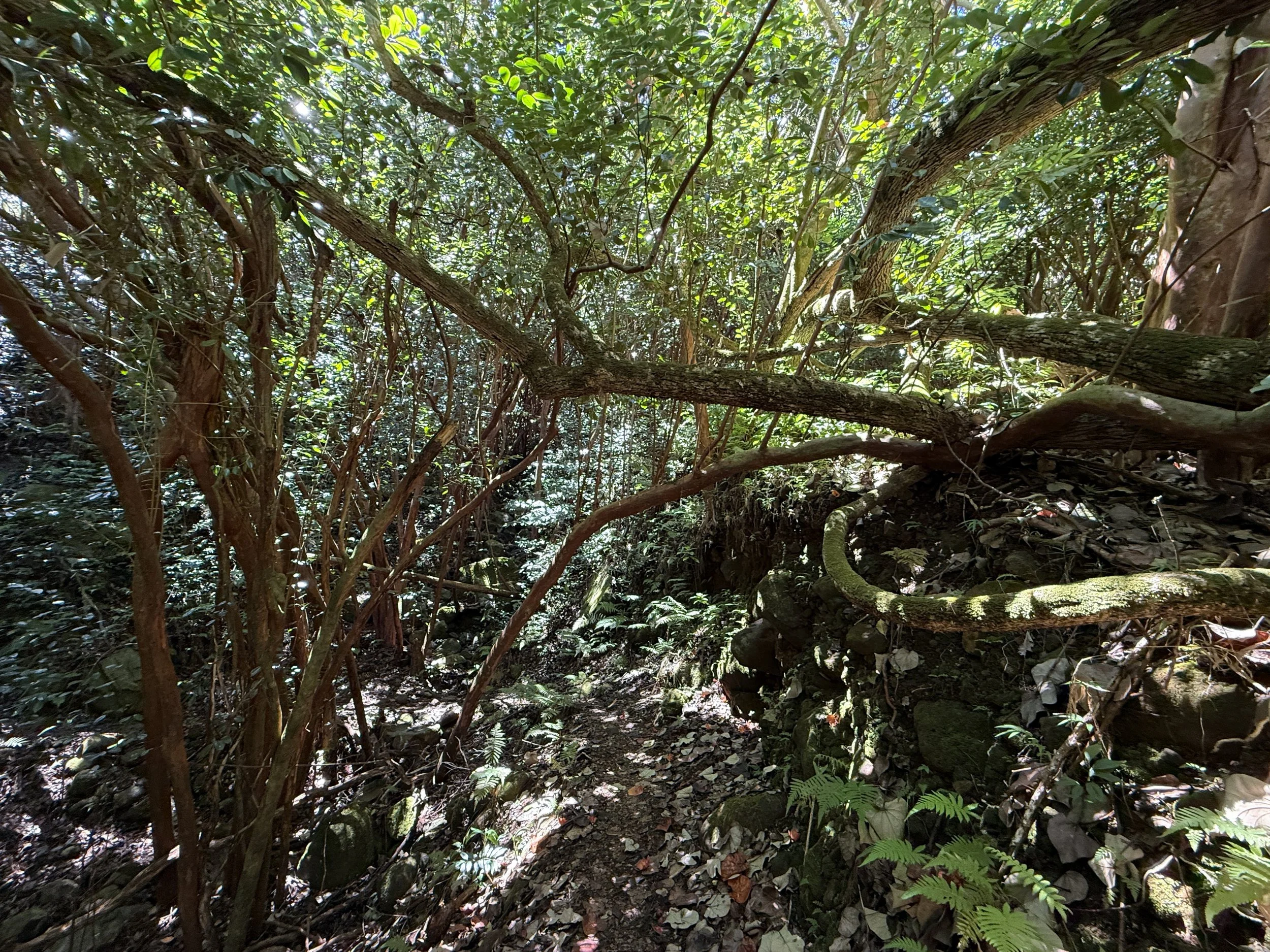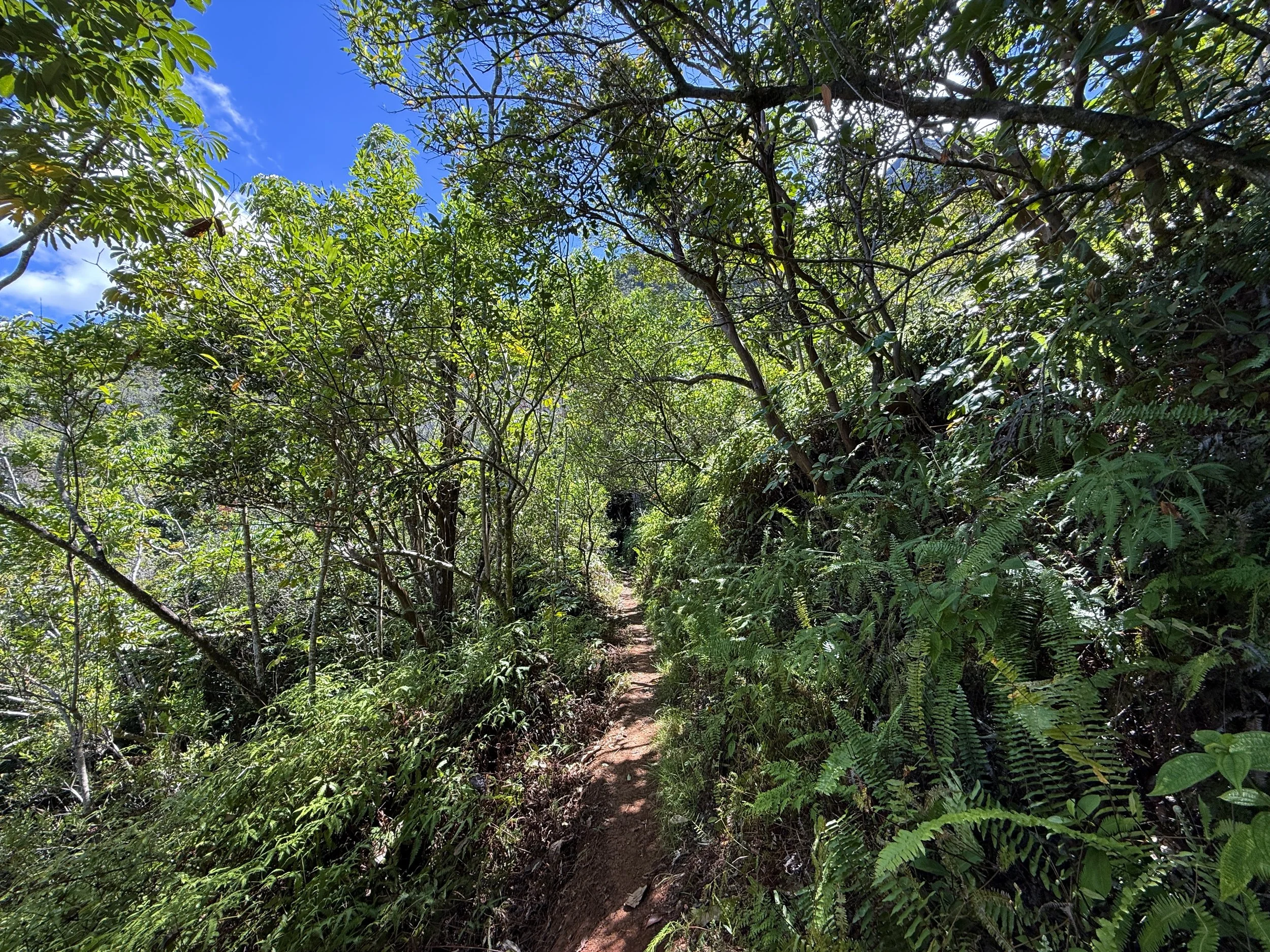 This short stretch along the base of Kōnānuanui is a perfect example of how the sun, moving over the ridge in the afternoon, makes the Maunawili Demonstration Trail much darker than it would be otherwise.