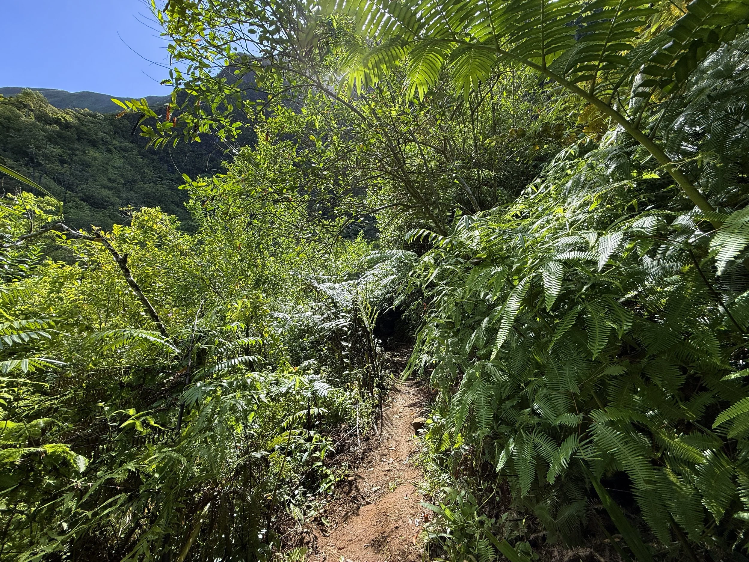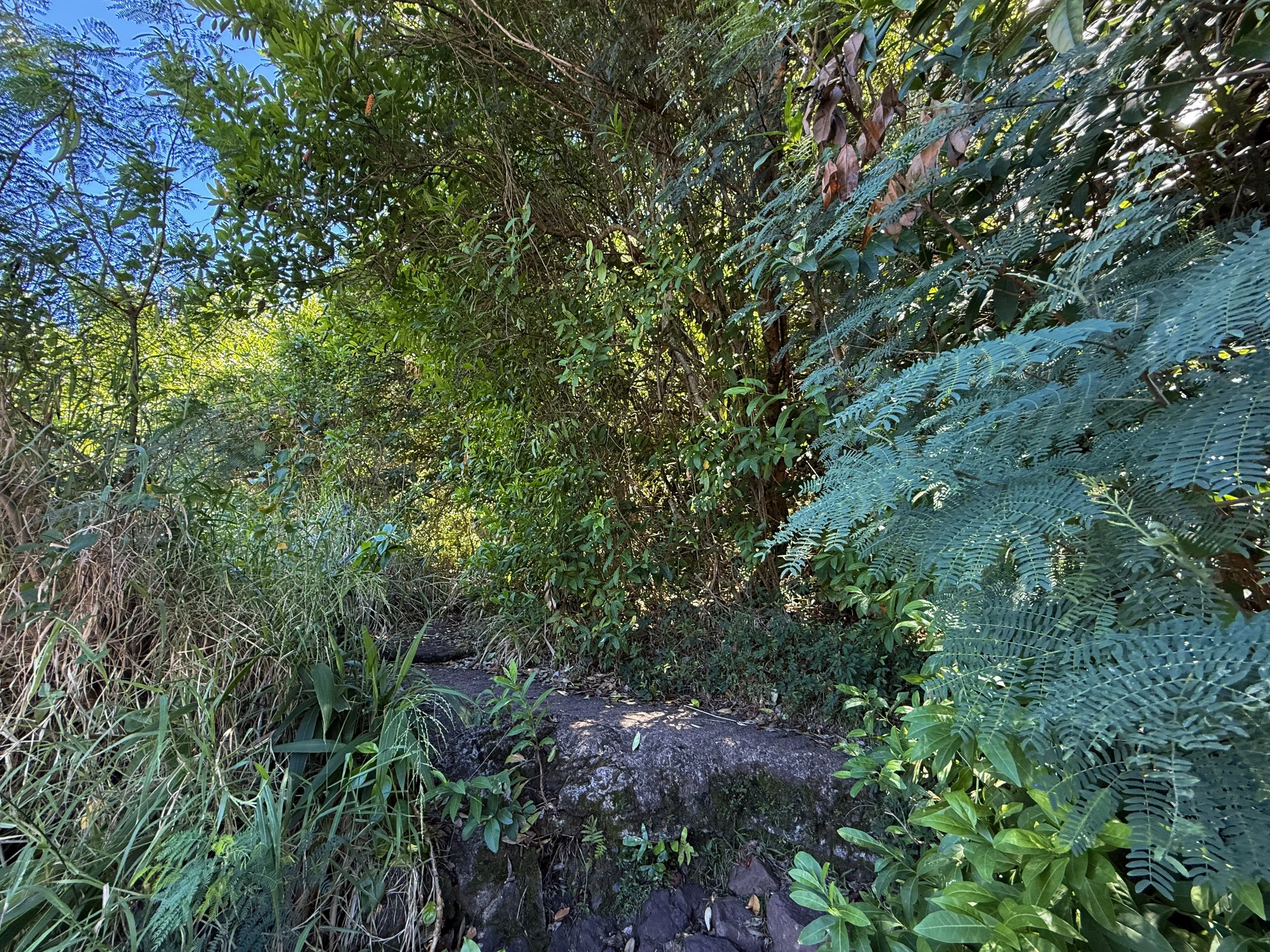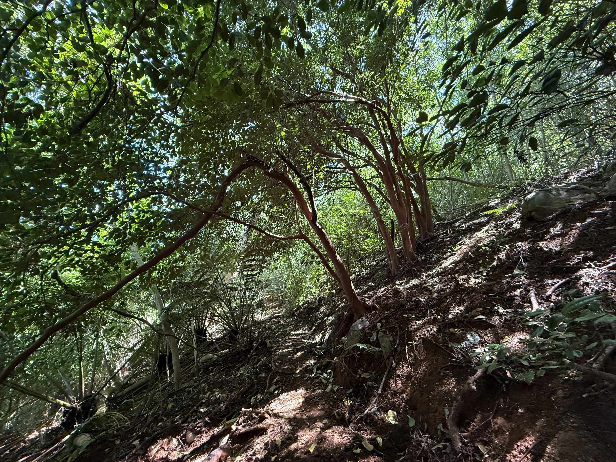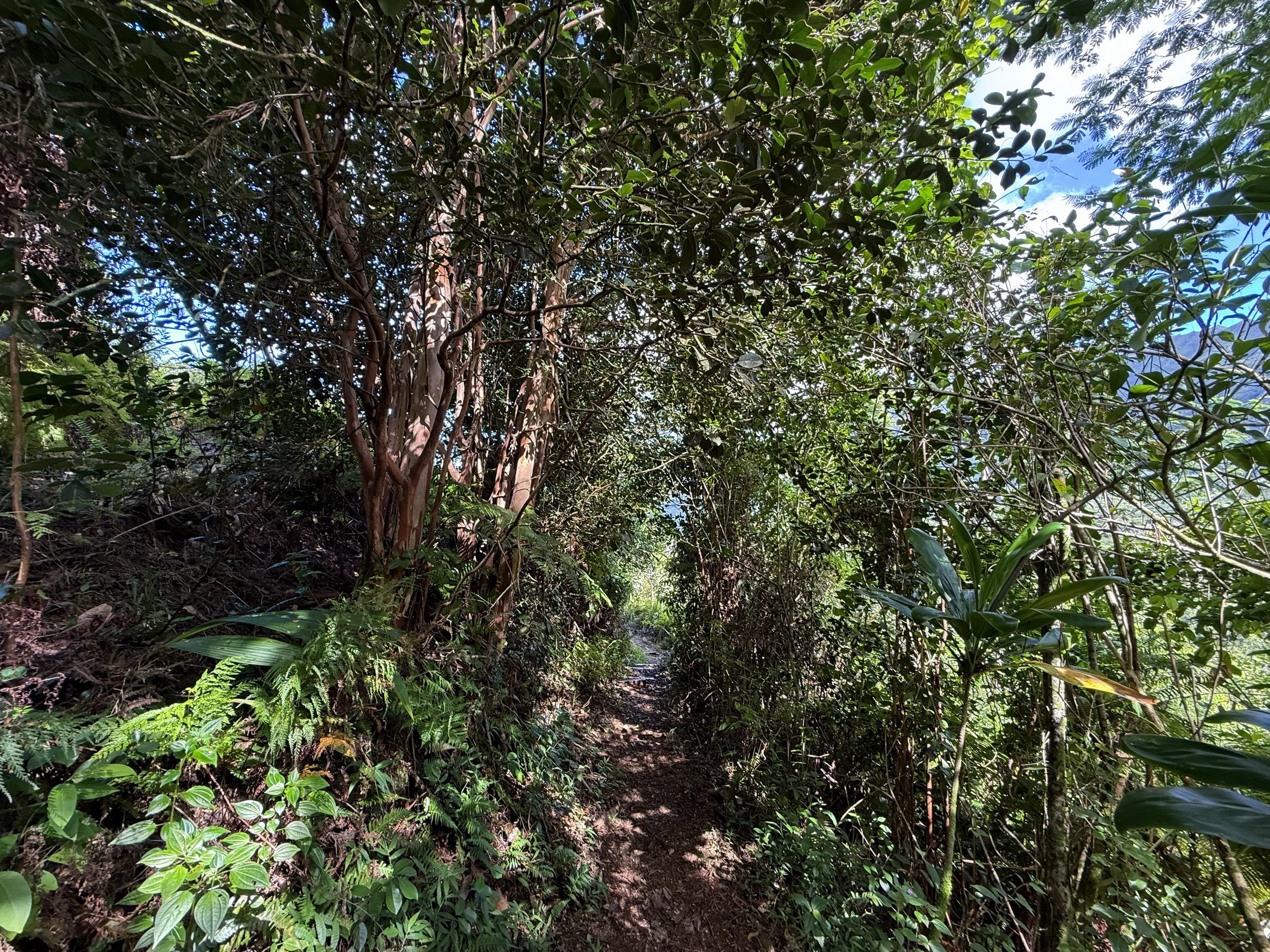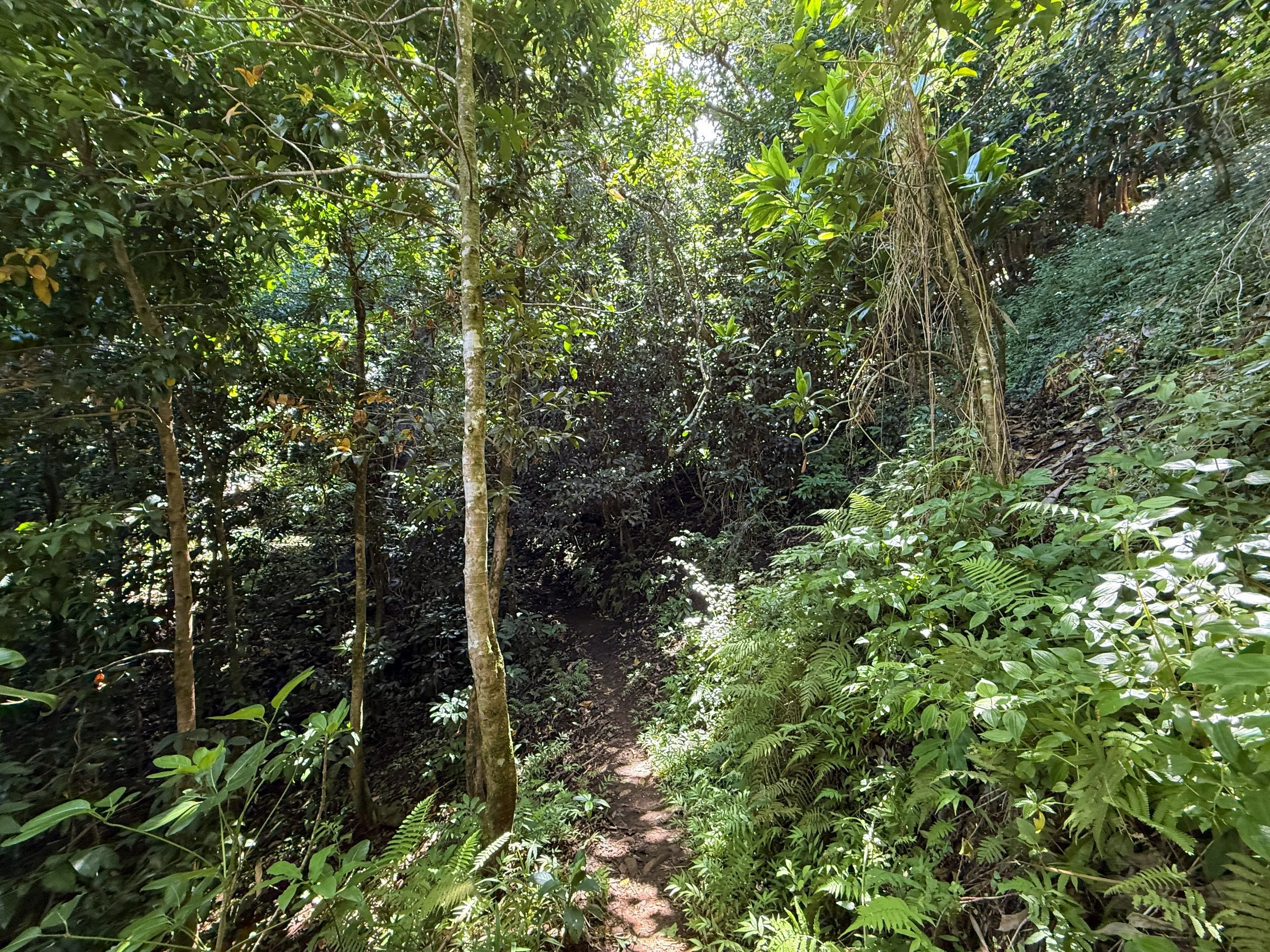 This short stretch along the base of Kōnānuanui is a perfect example of how the sun, moving over the ridge in the afternoon, makes the Maunawili Demonstration Trail much darker than it would be otherwise.