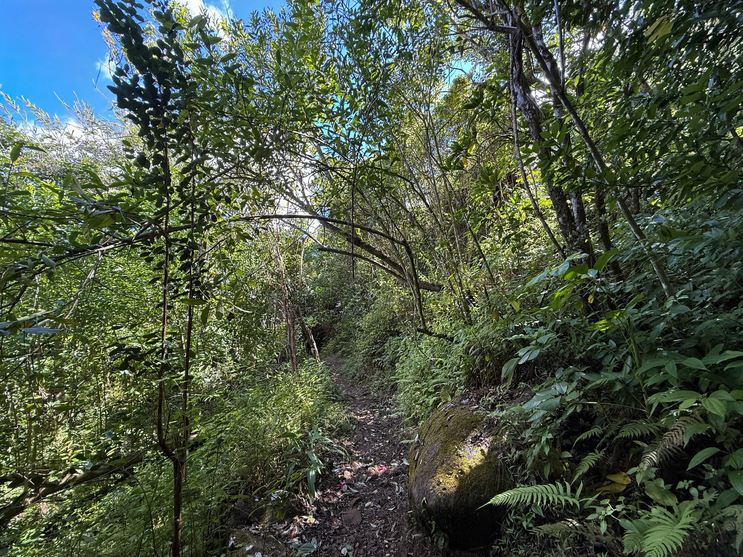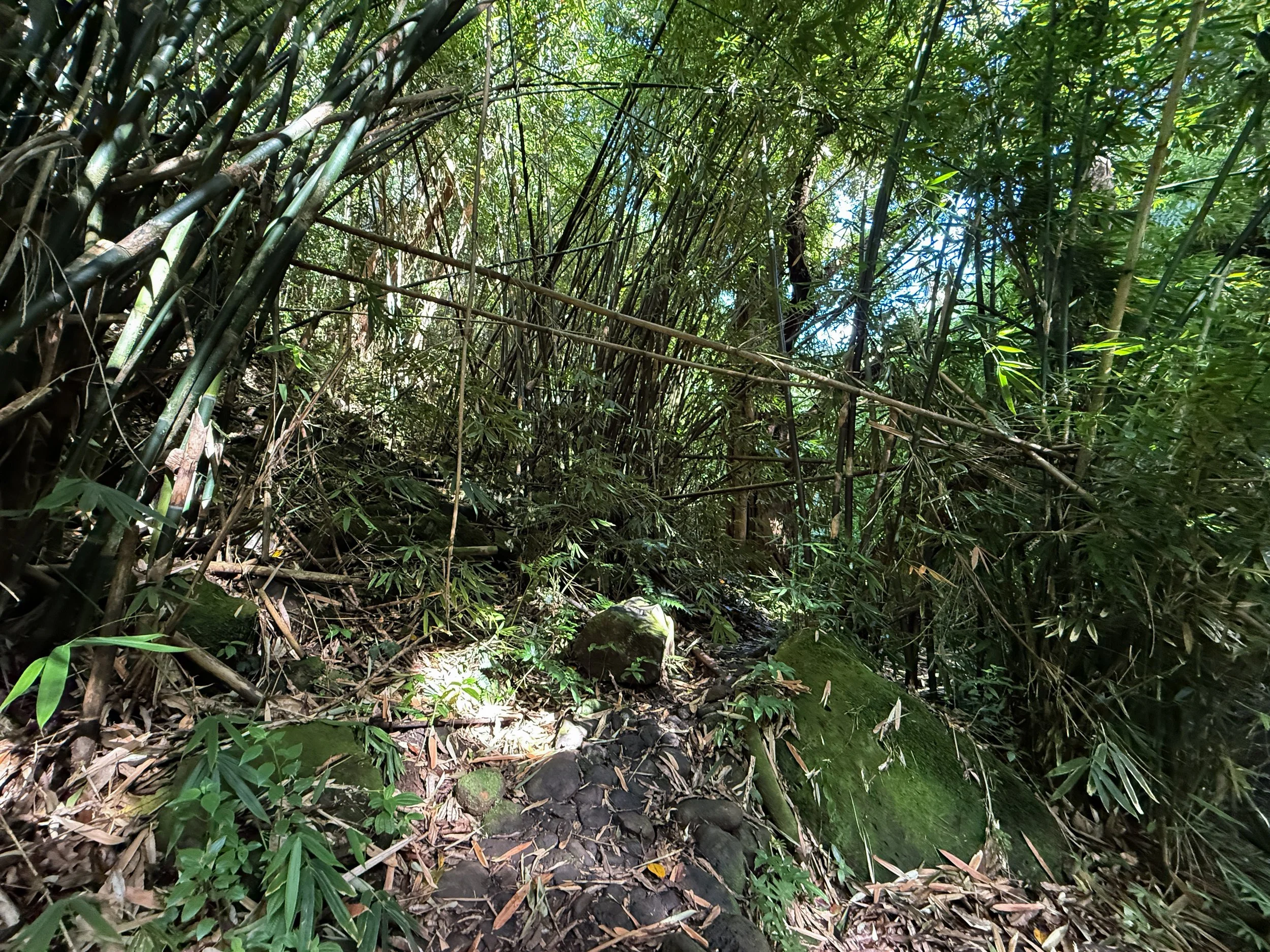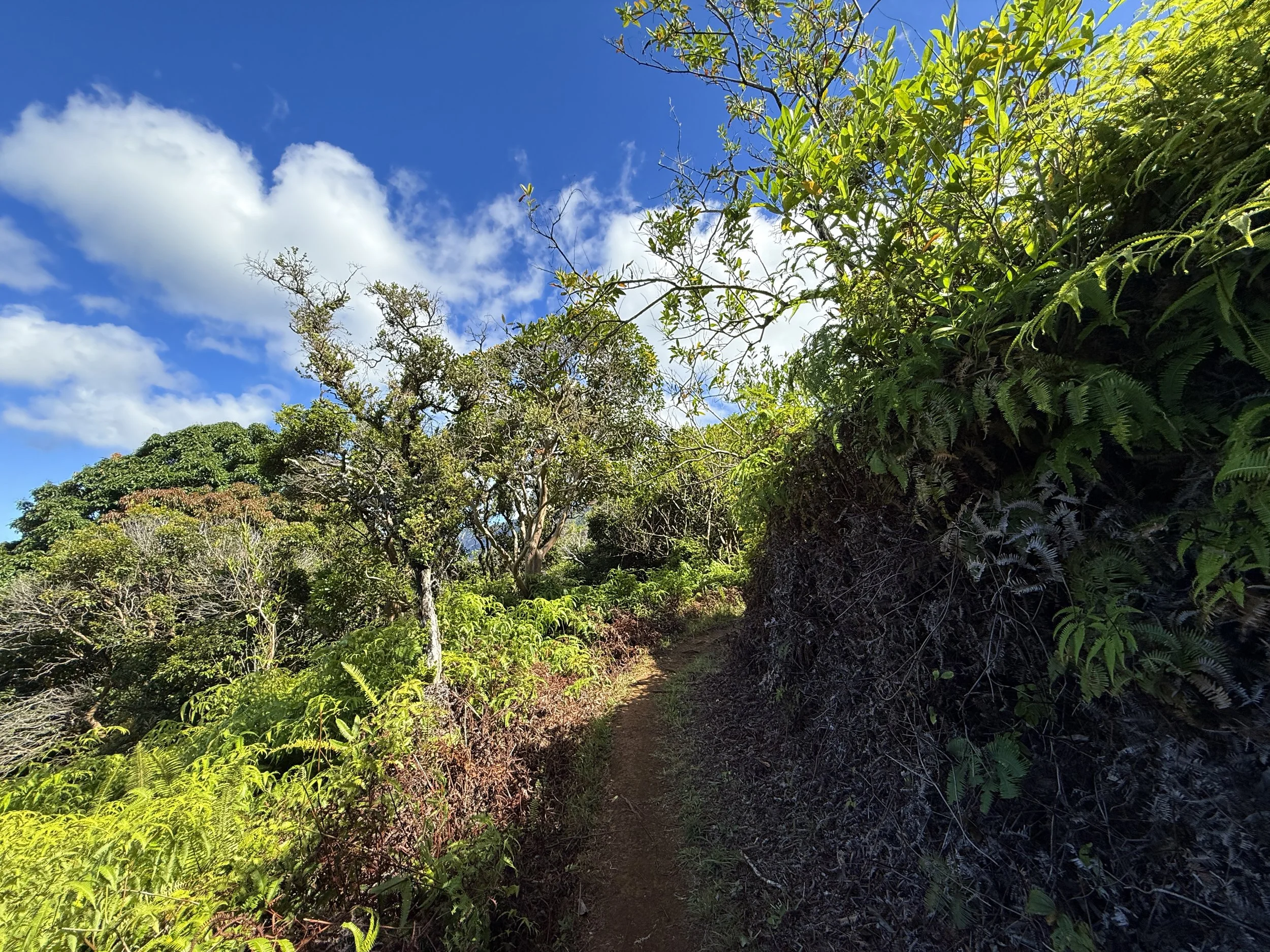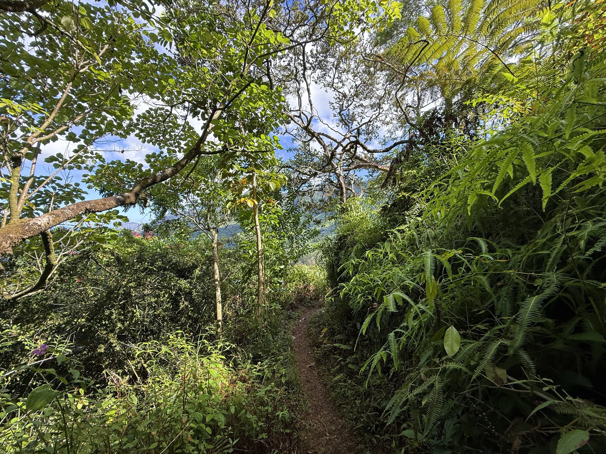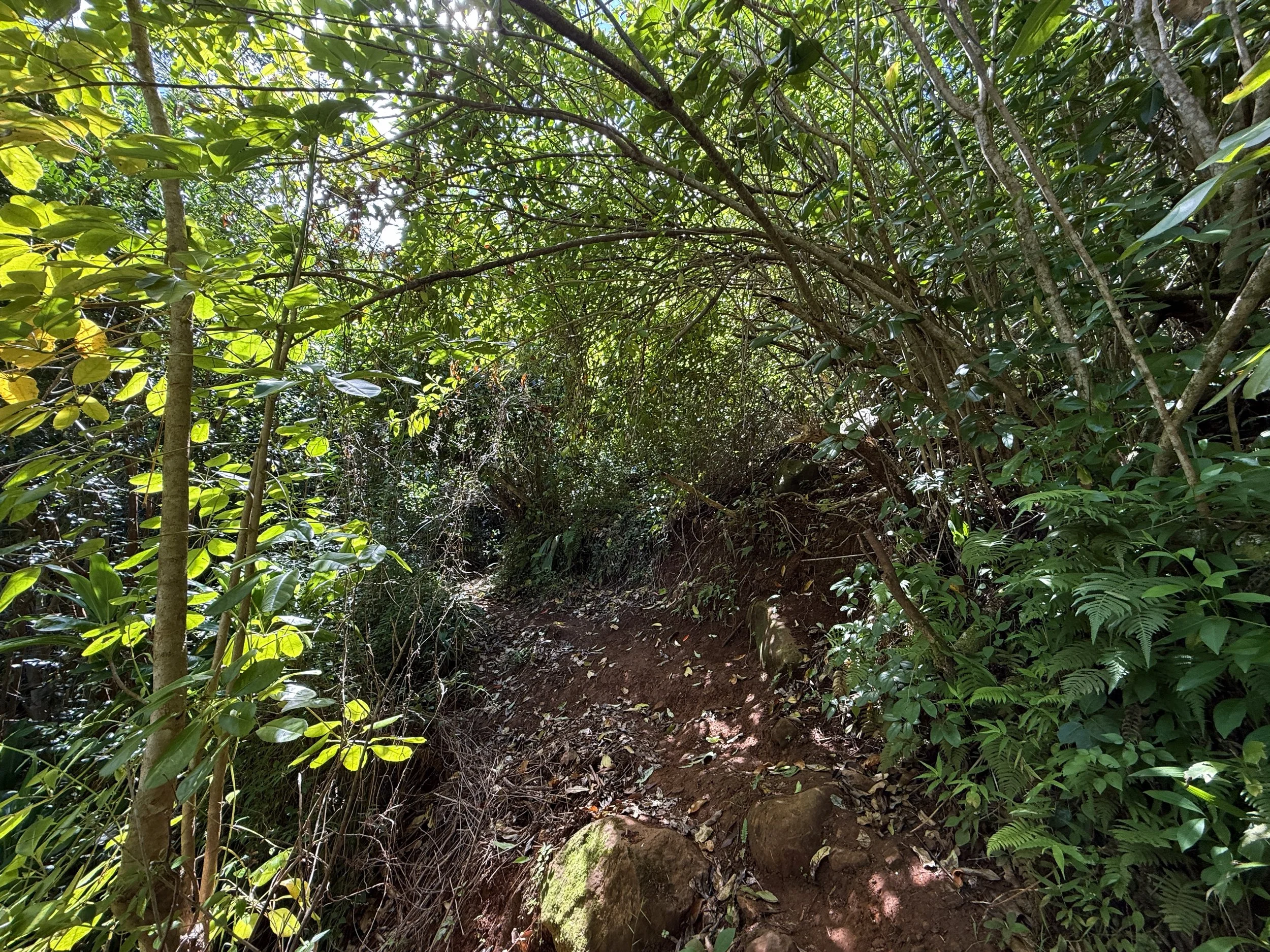 This short stretch along the base of Kōnānuanui is a perfect example of how the sun, moving over the ridge in the afternoon, makes the Maunawili Demonstration Trail much darker than it would be otherwise.