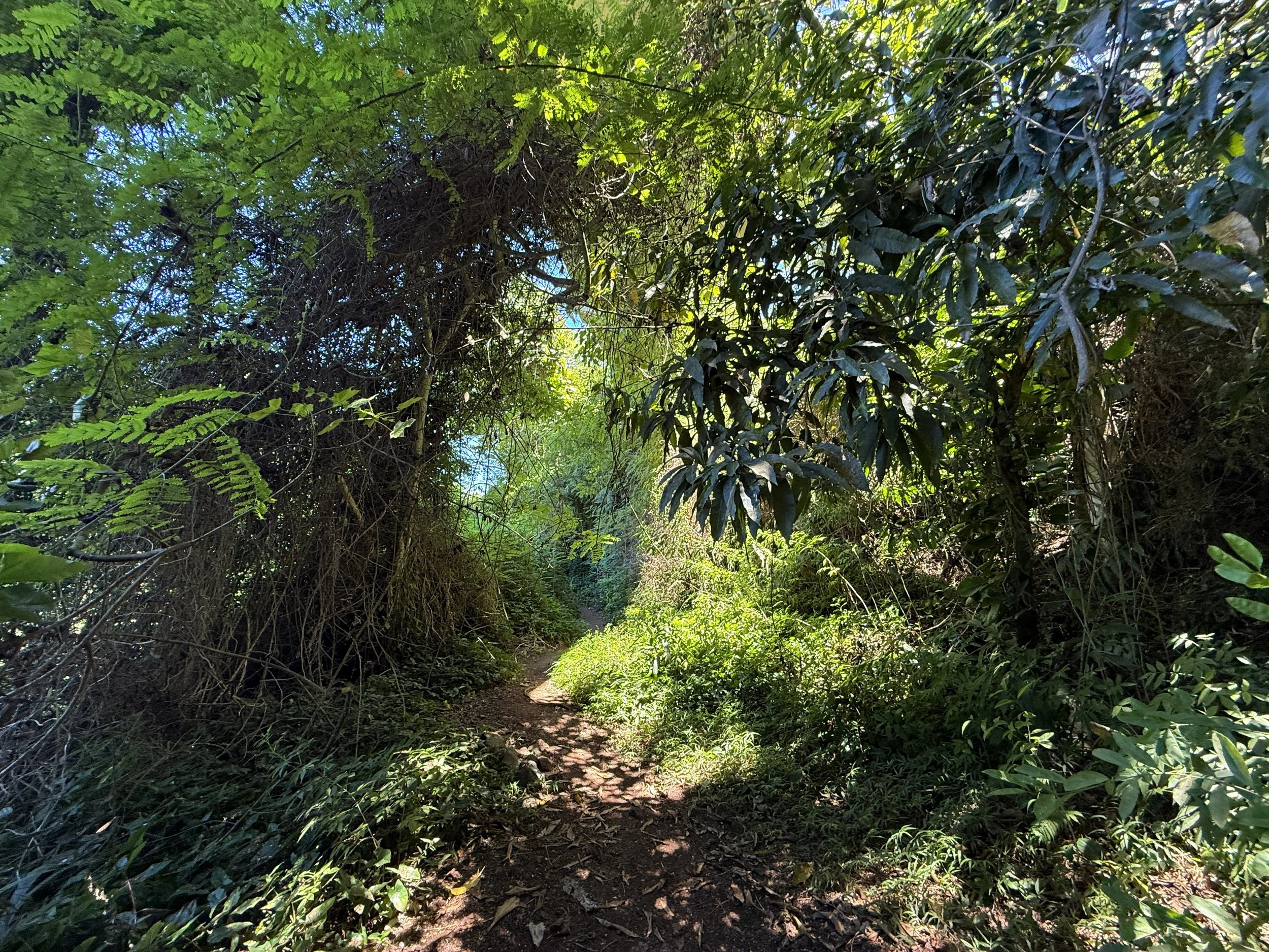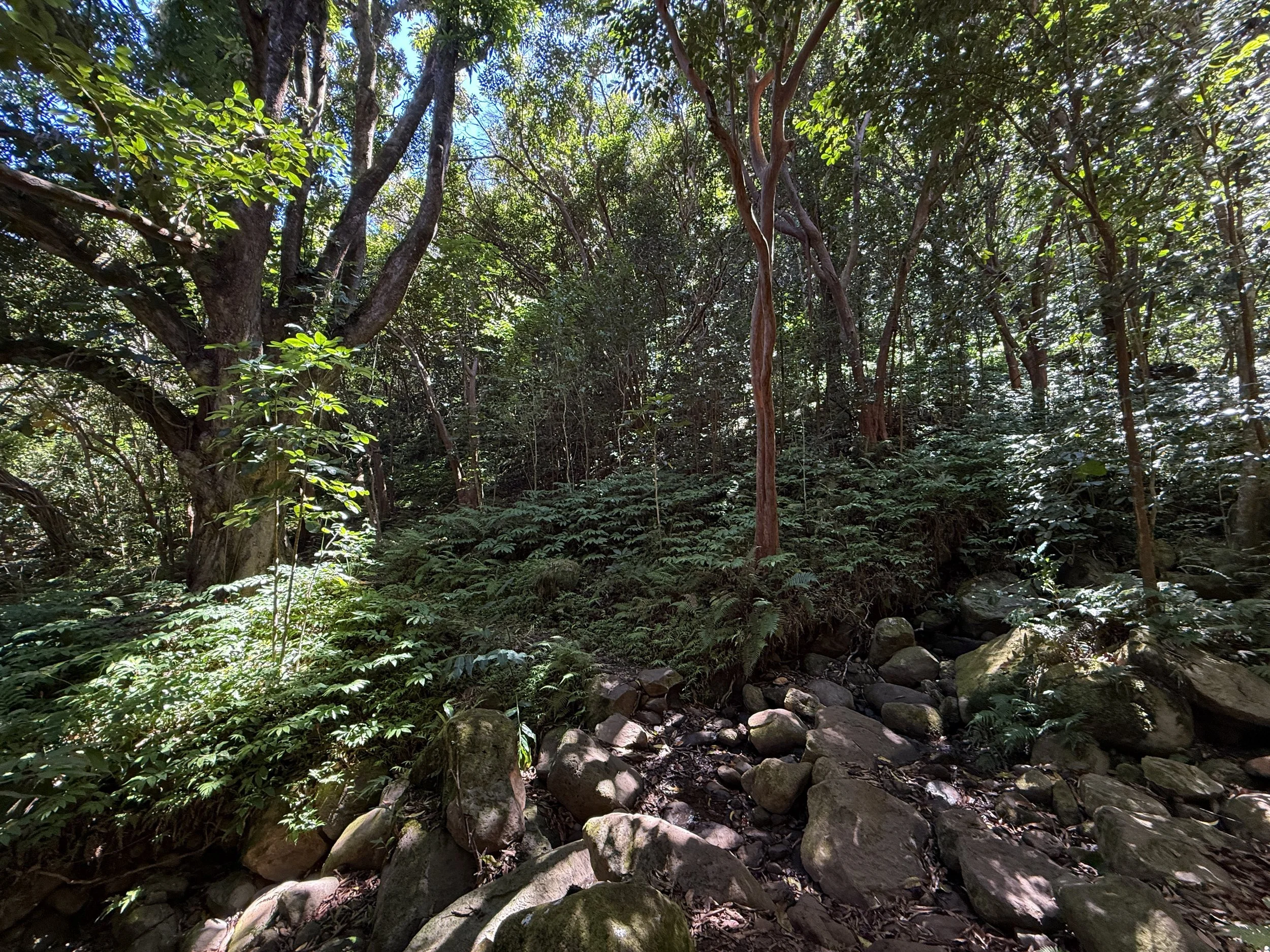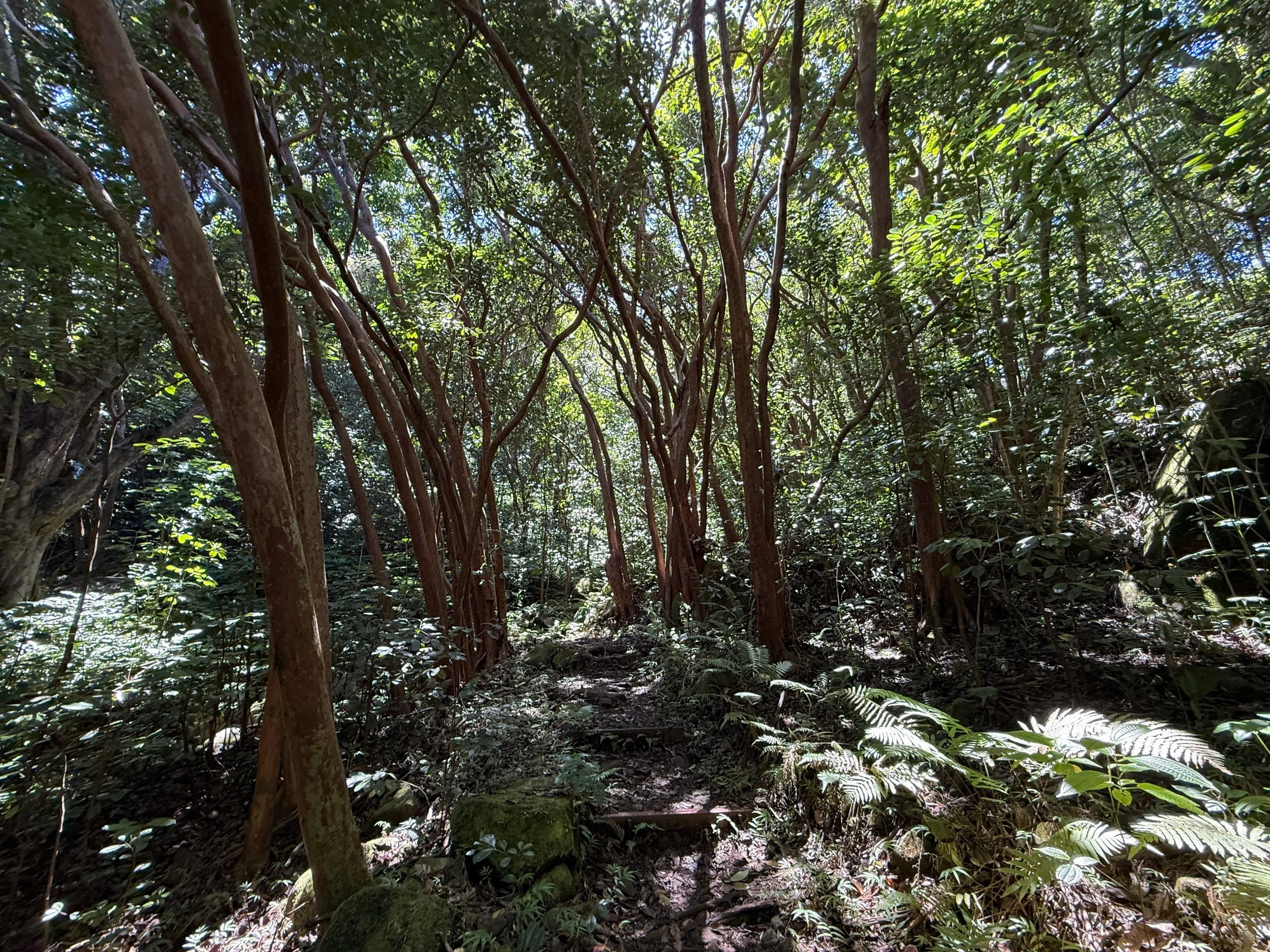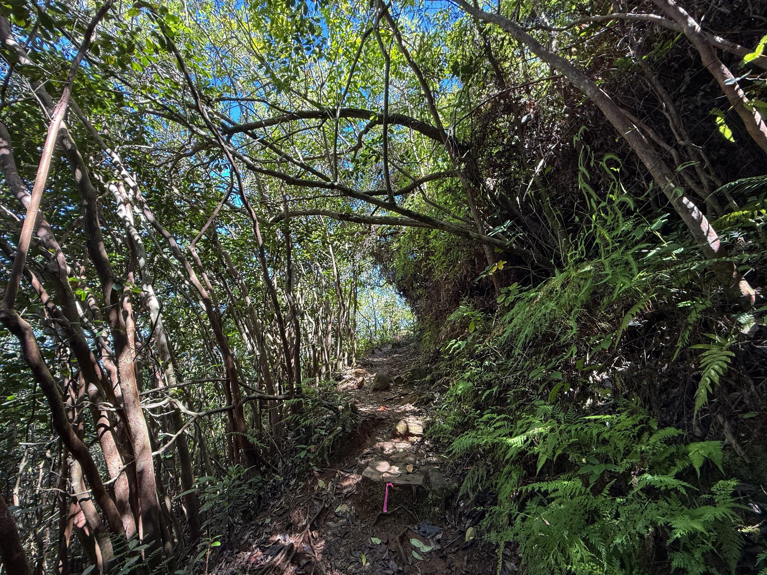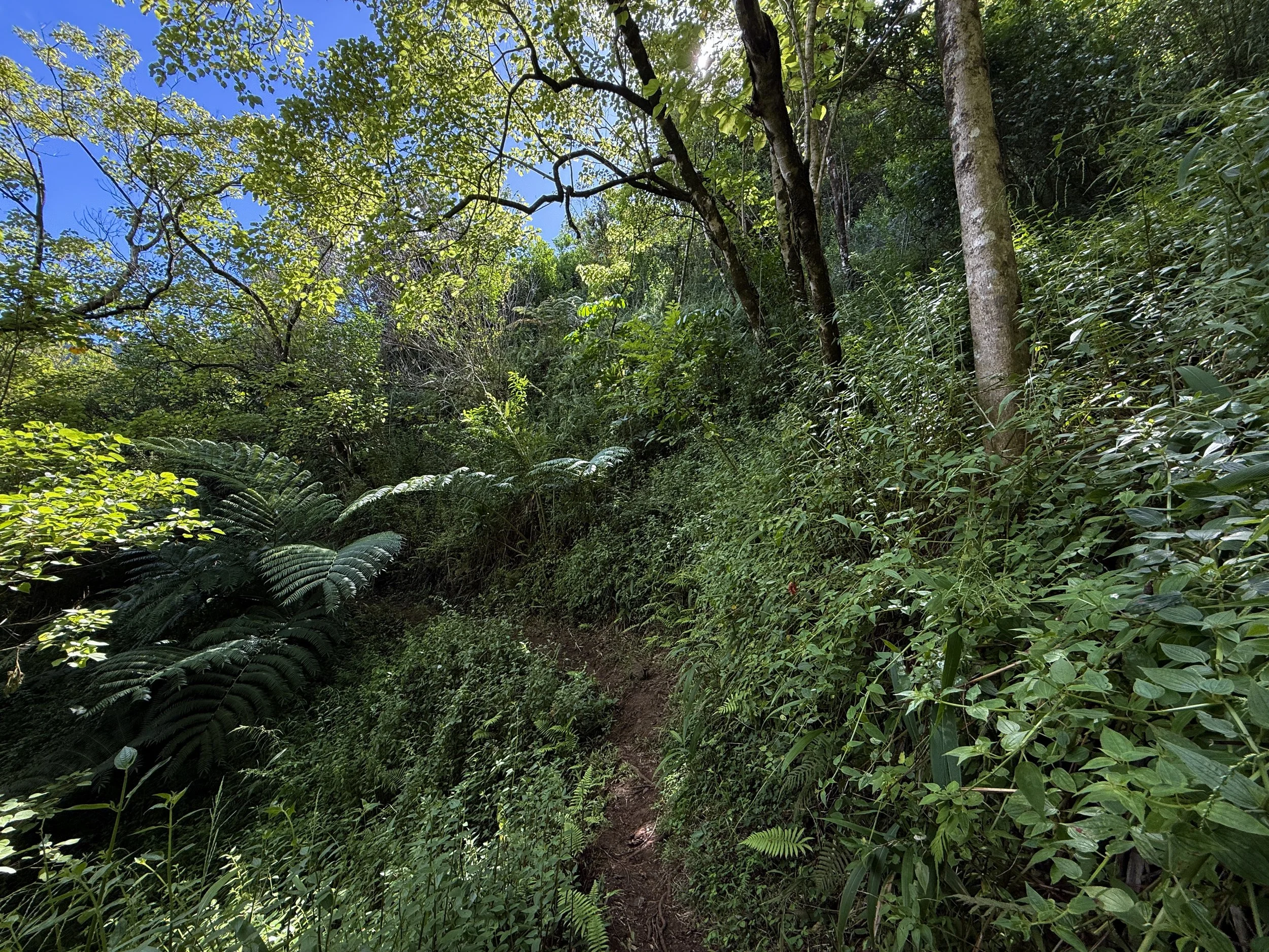 This short stretch along the base of Kōnānuanui is a perfect example of how the sun, moving over the ridge in the afternoon, makes the Maunawili Demonstration Trail much darker than it would be otherwise.