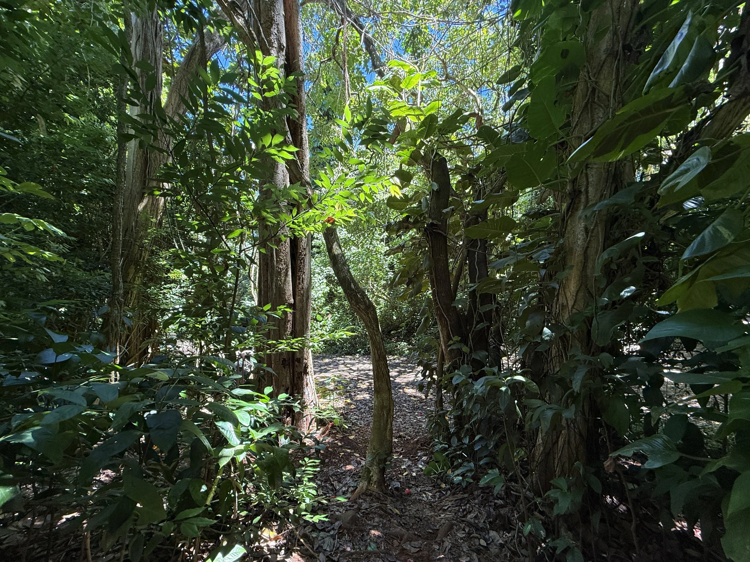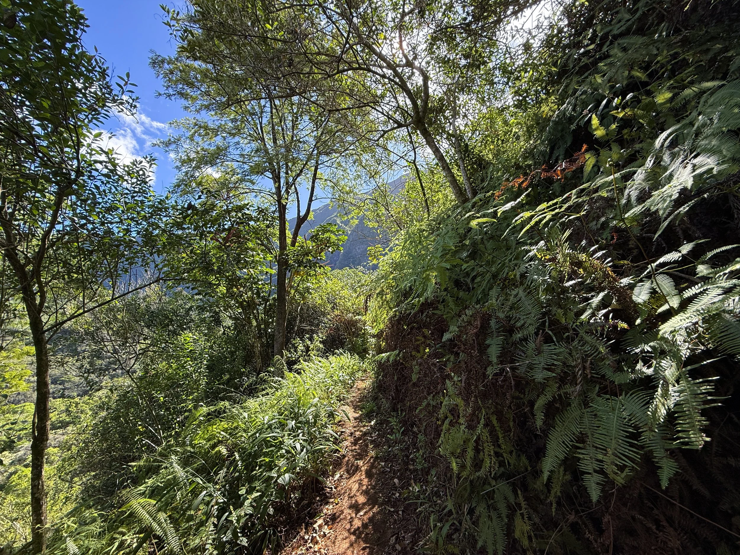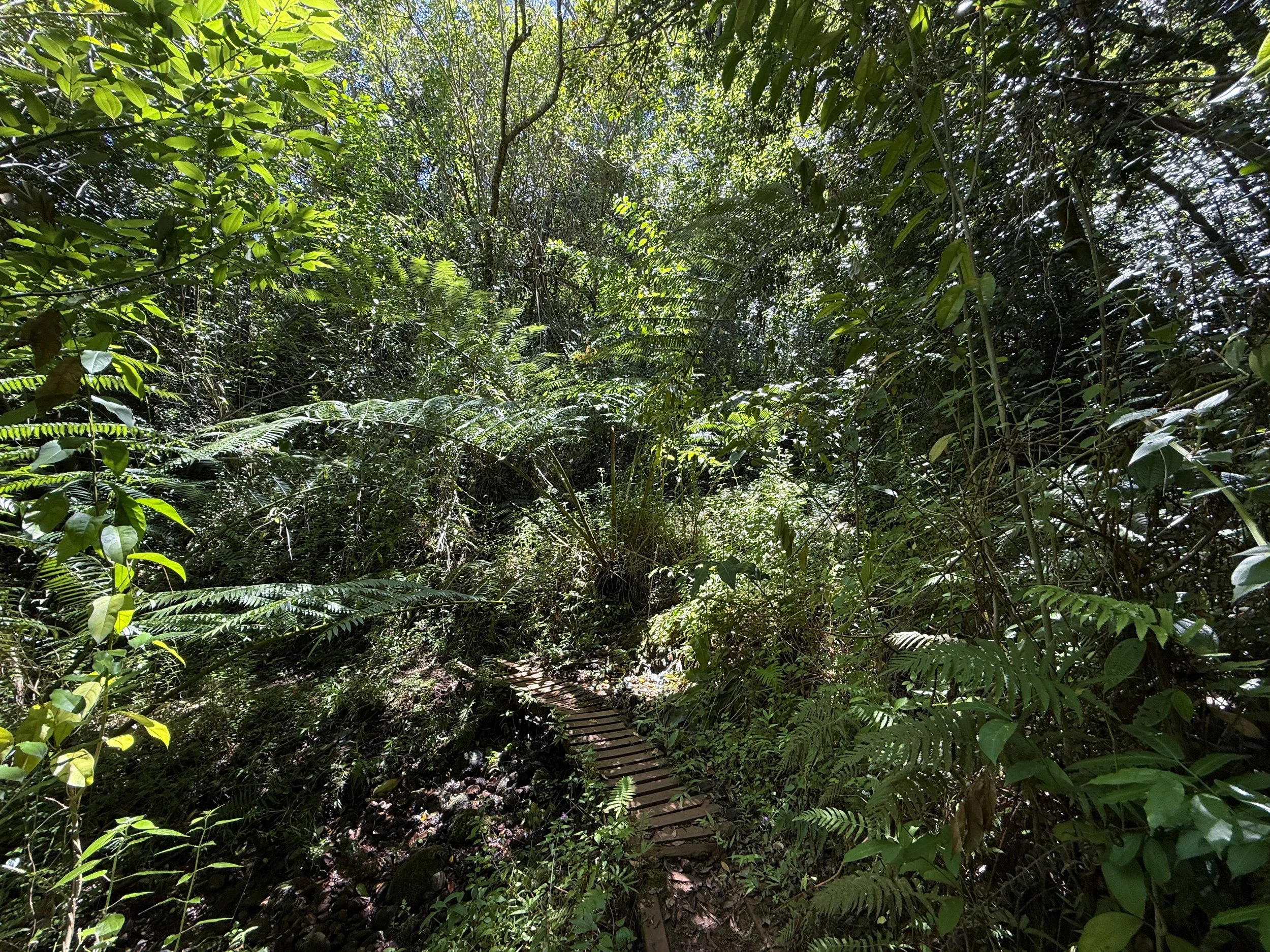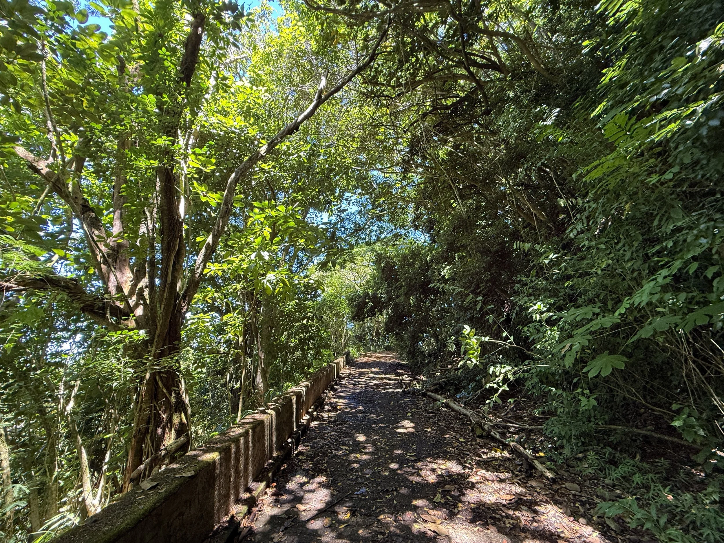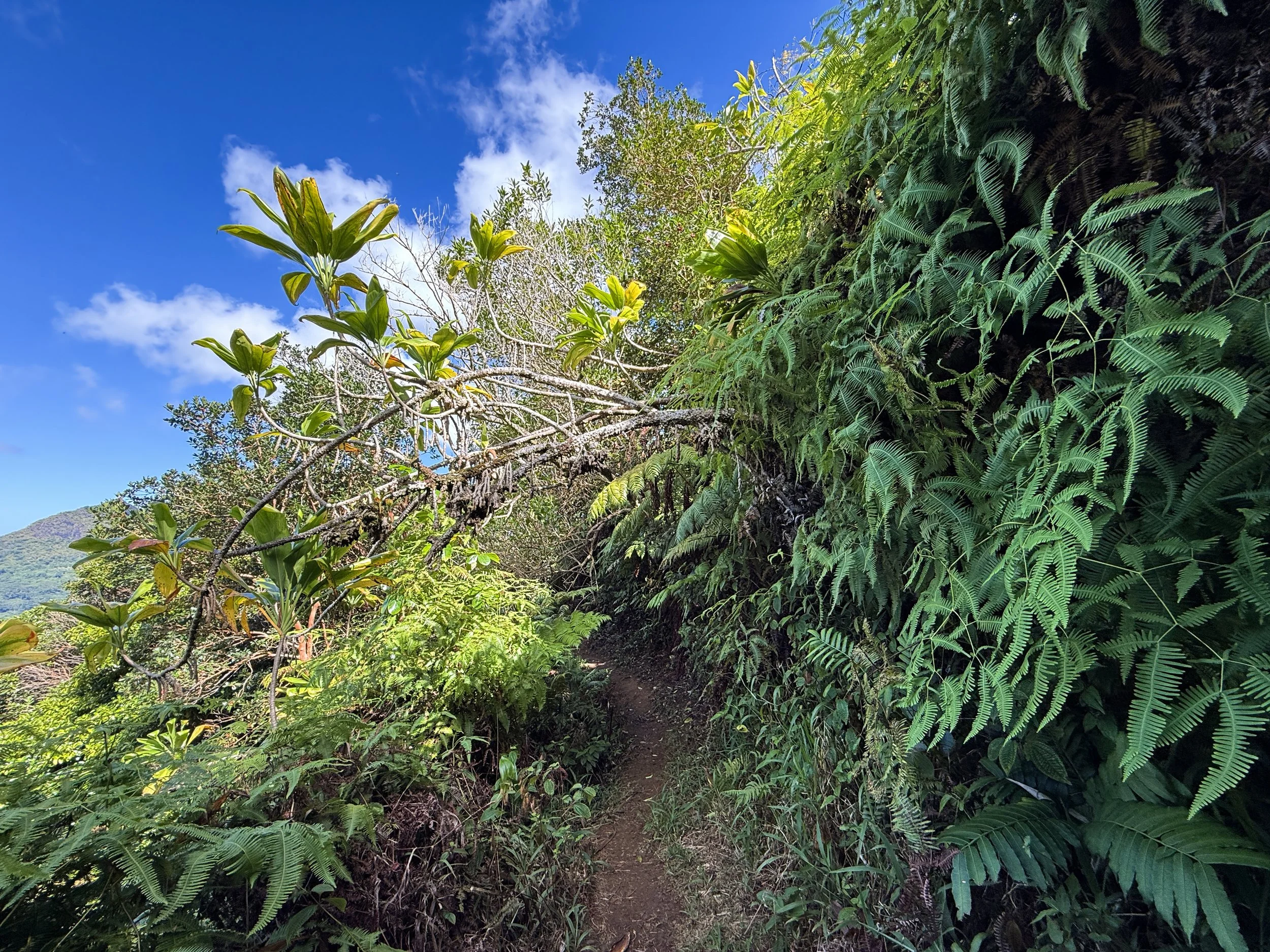 This short stretch along the base of Kōnānuanui is a perfect example of how the sun, moving over the ridge in the afternoon, makes the Maunawili Demonstration Trail much darker than it would be otherwise.