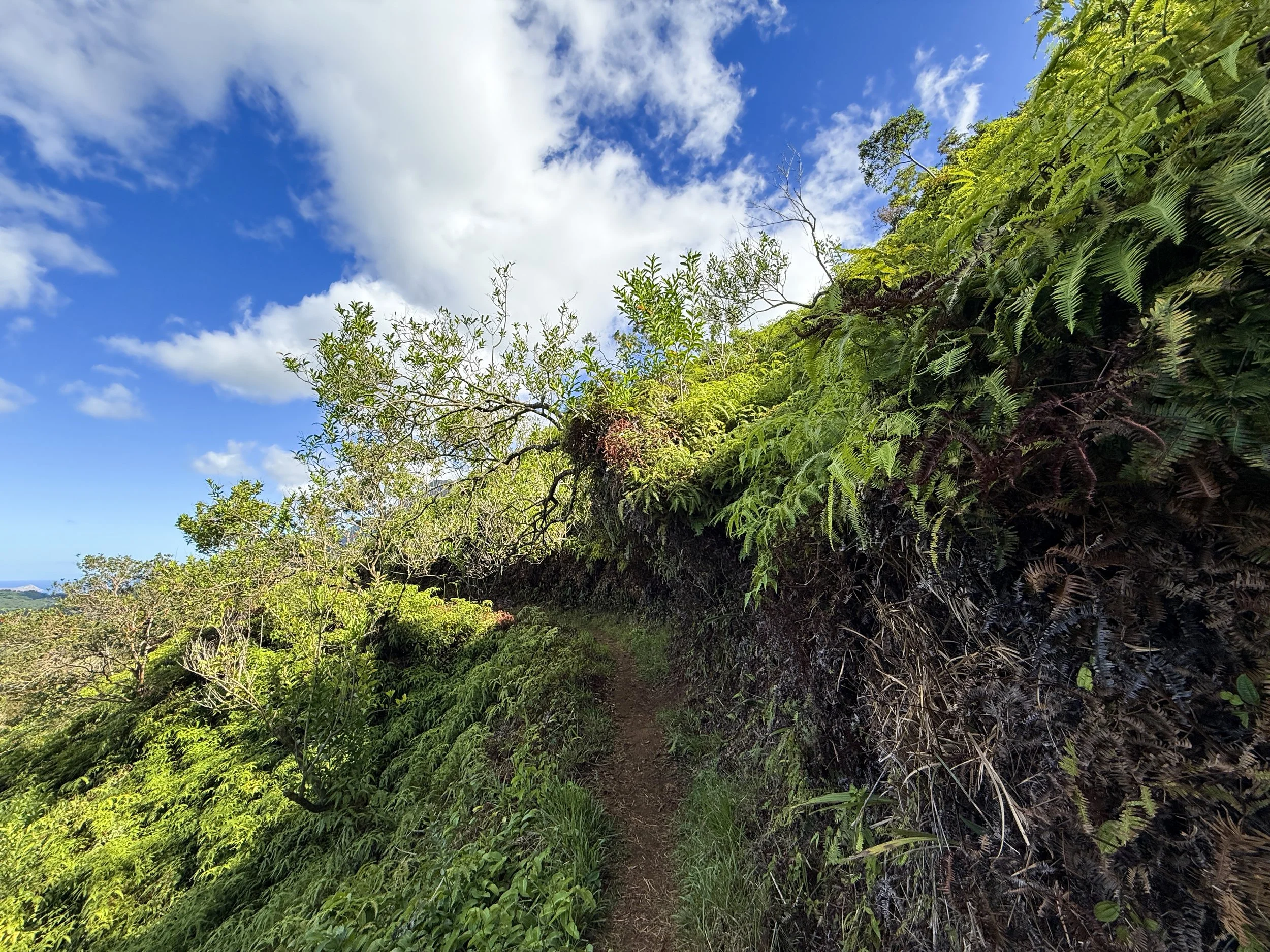 Once at the top of the ladder, the Maunawili Falls Trail continues just a few steps ahead to the cliffside and the junction, where the trail leaves the Old Pali Road behind.