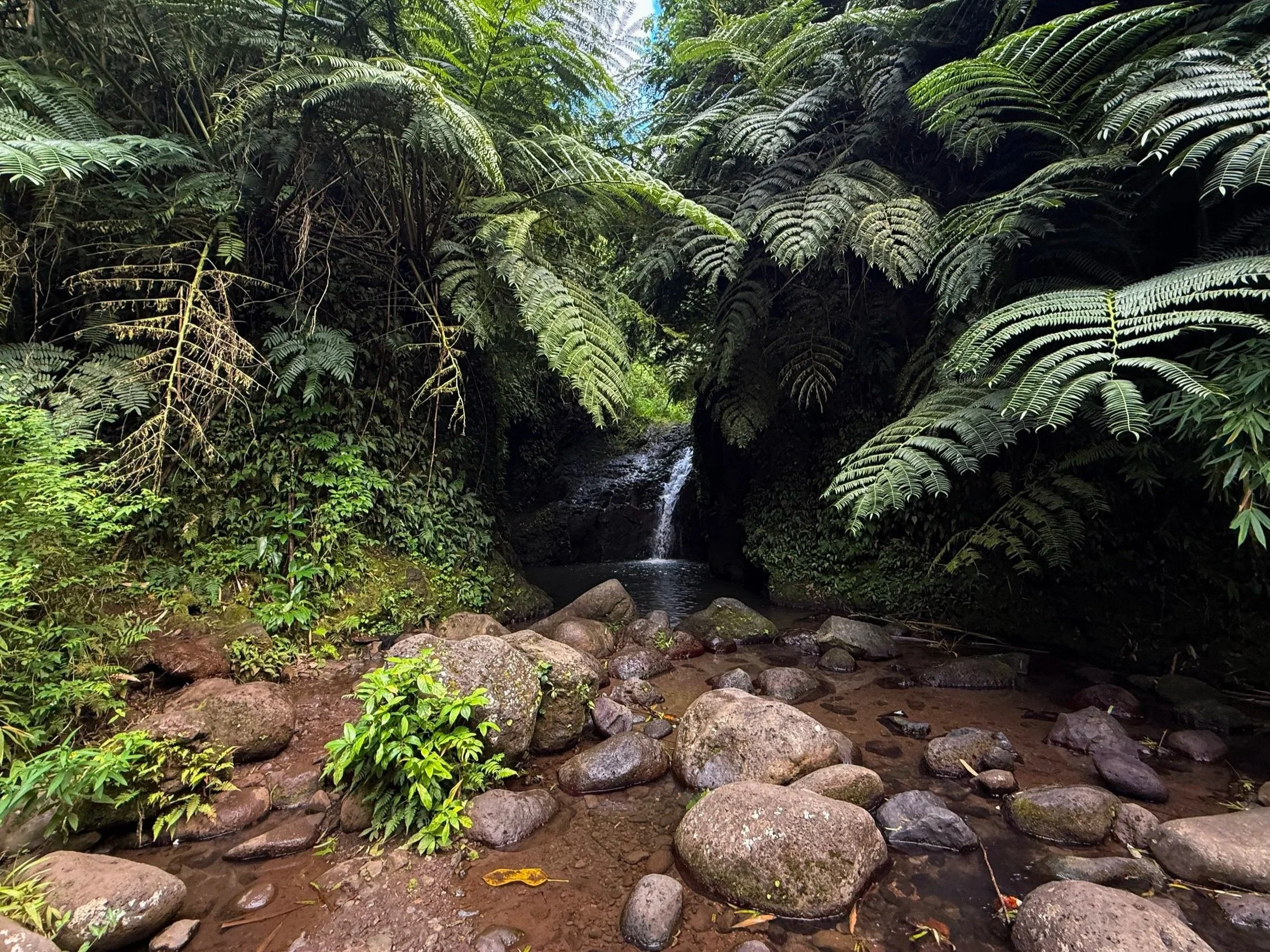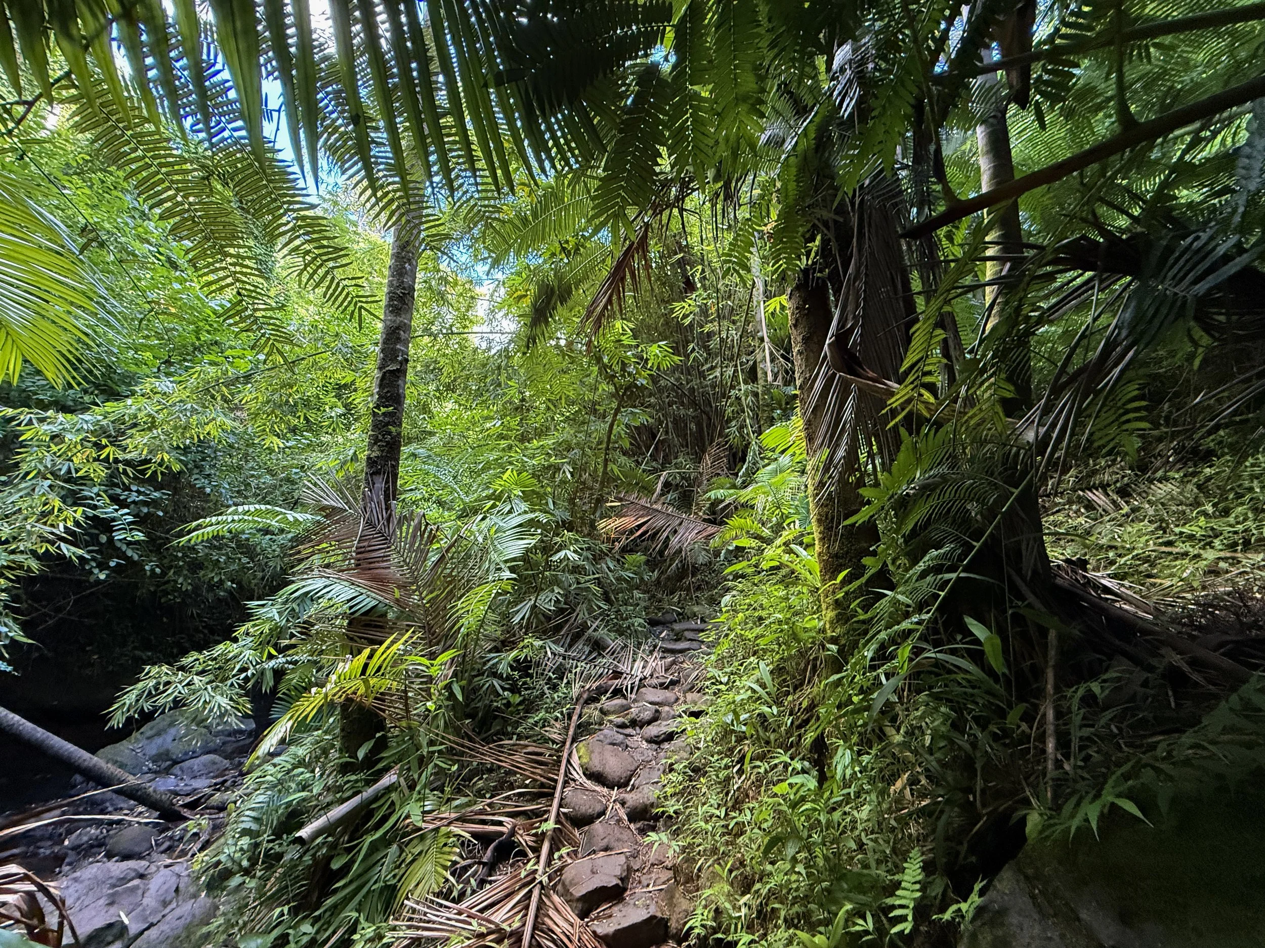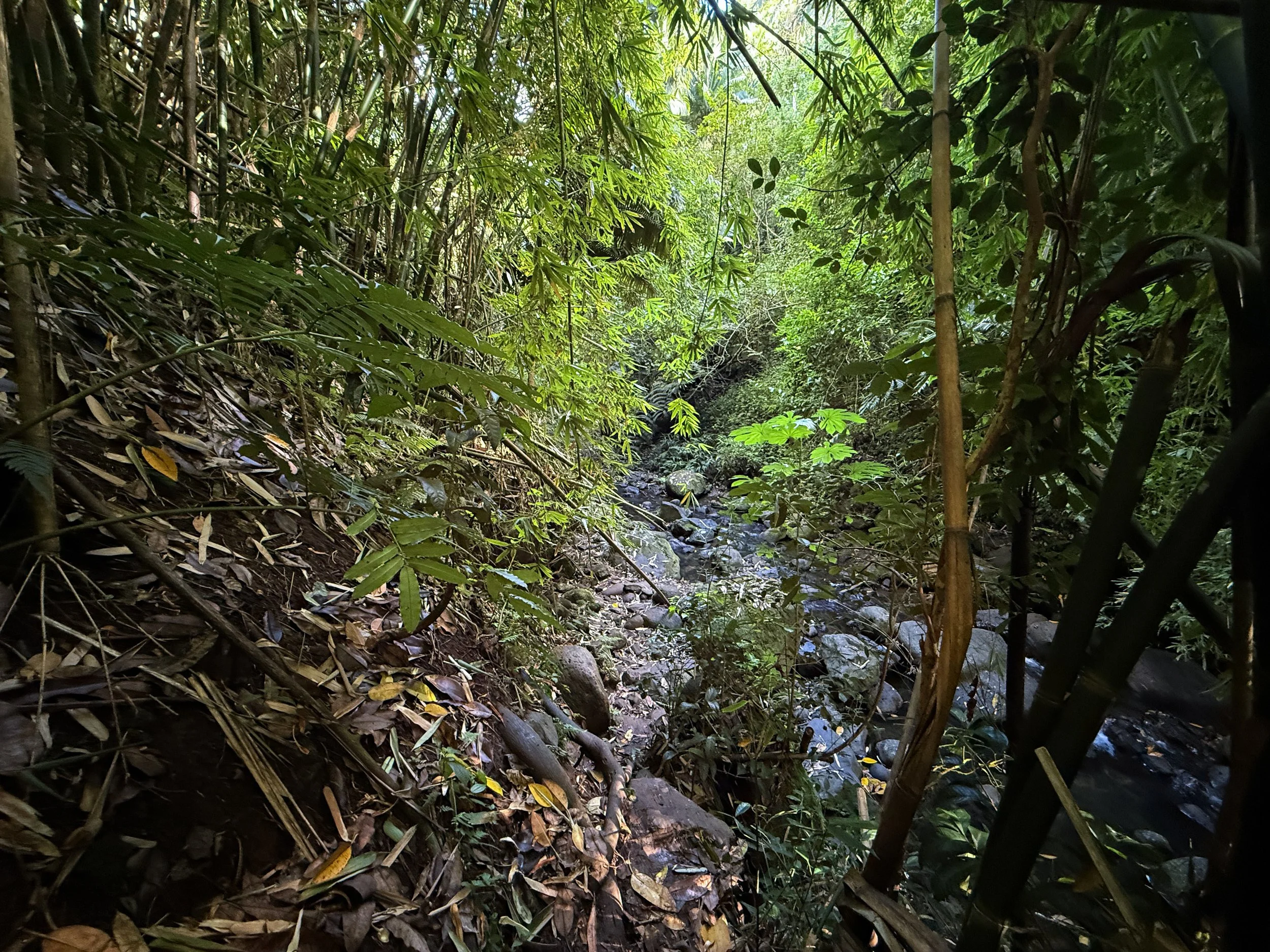 Almost immediately, the Maunawili Falls Trail drops back down to the stream, where it continues to the waterfall on the other side.