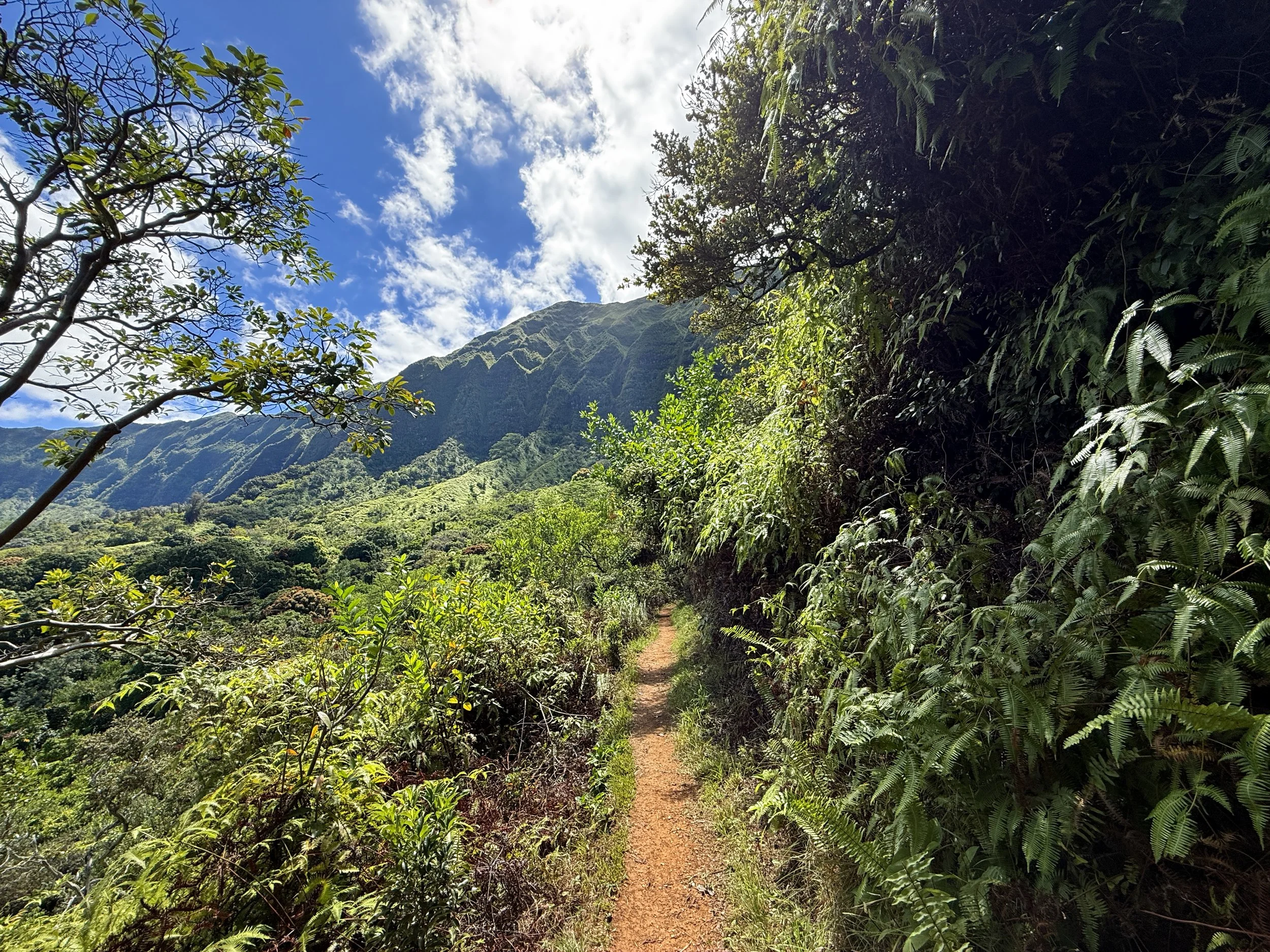 After hiking roughly 3.5 miles (5.6 km) from the Koʻolau Golf Club, the true Maunawili Falls Trail finally branches away into Maunawili Valley.