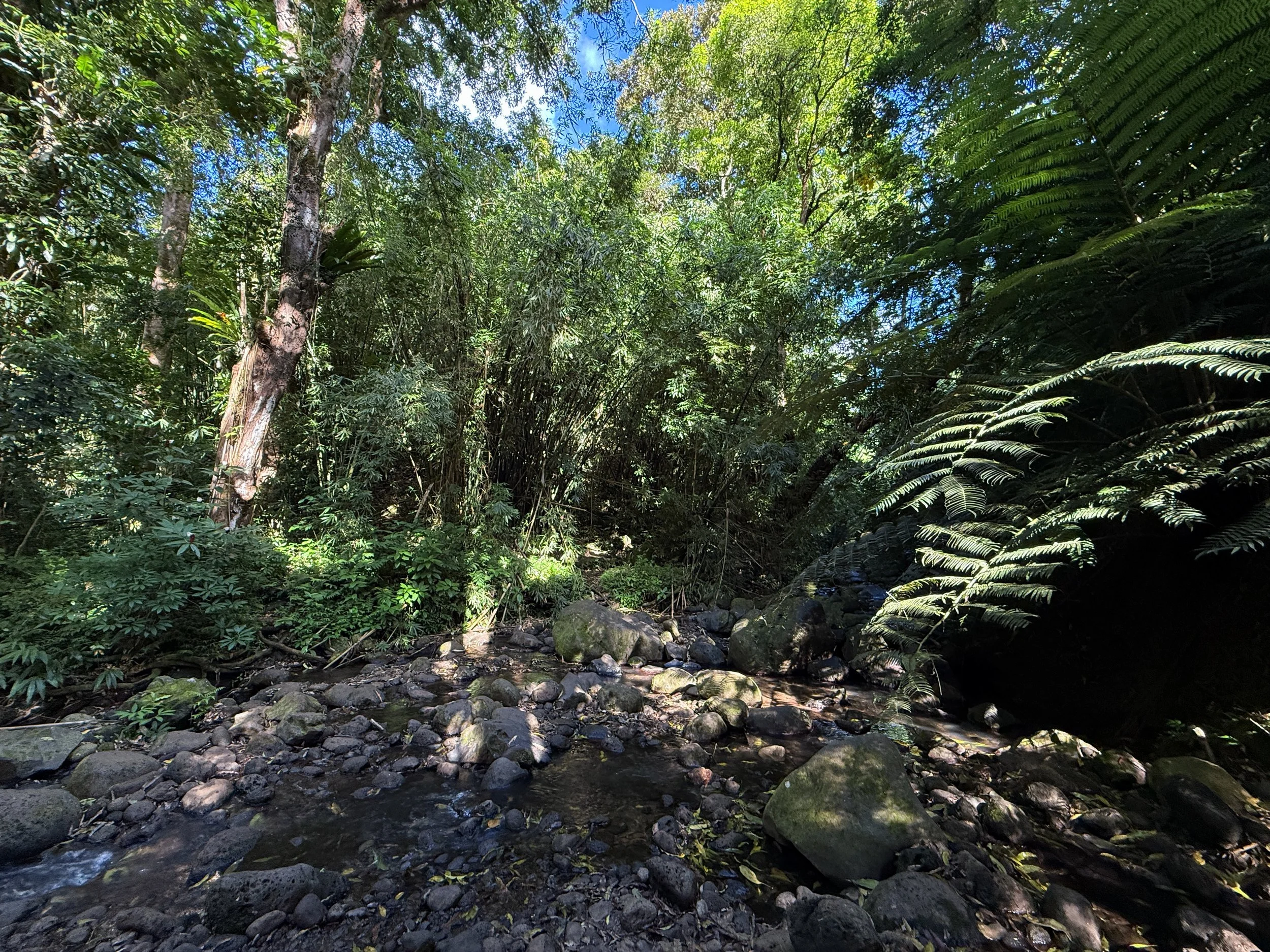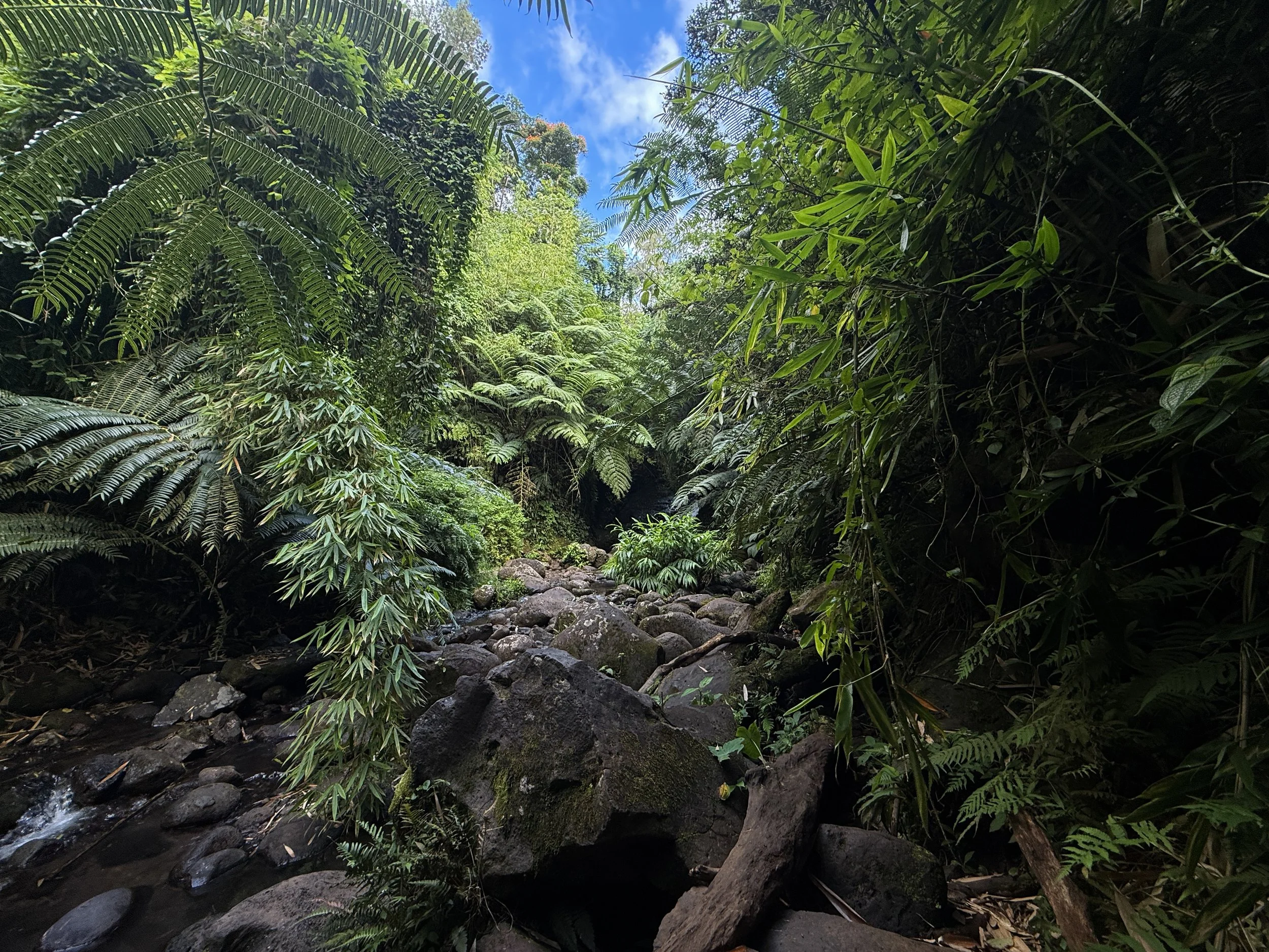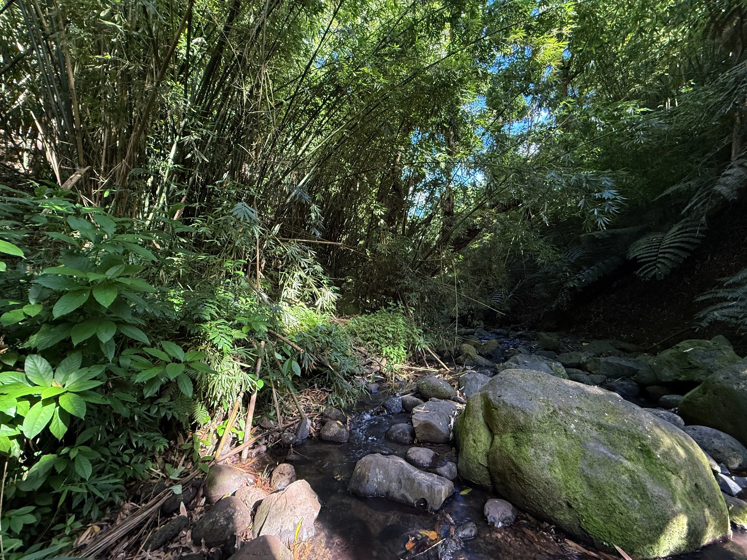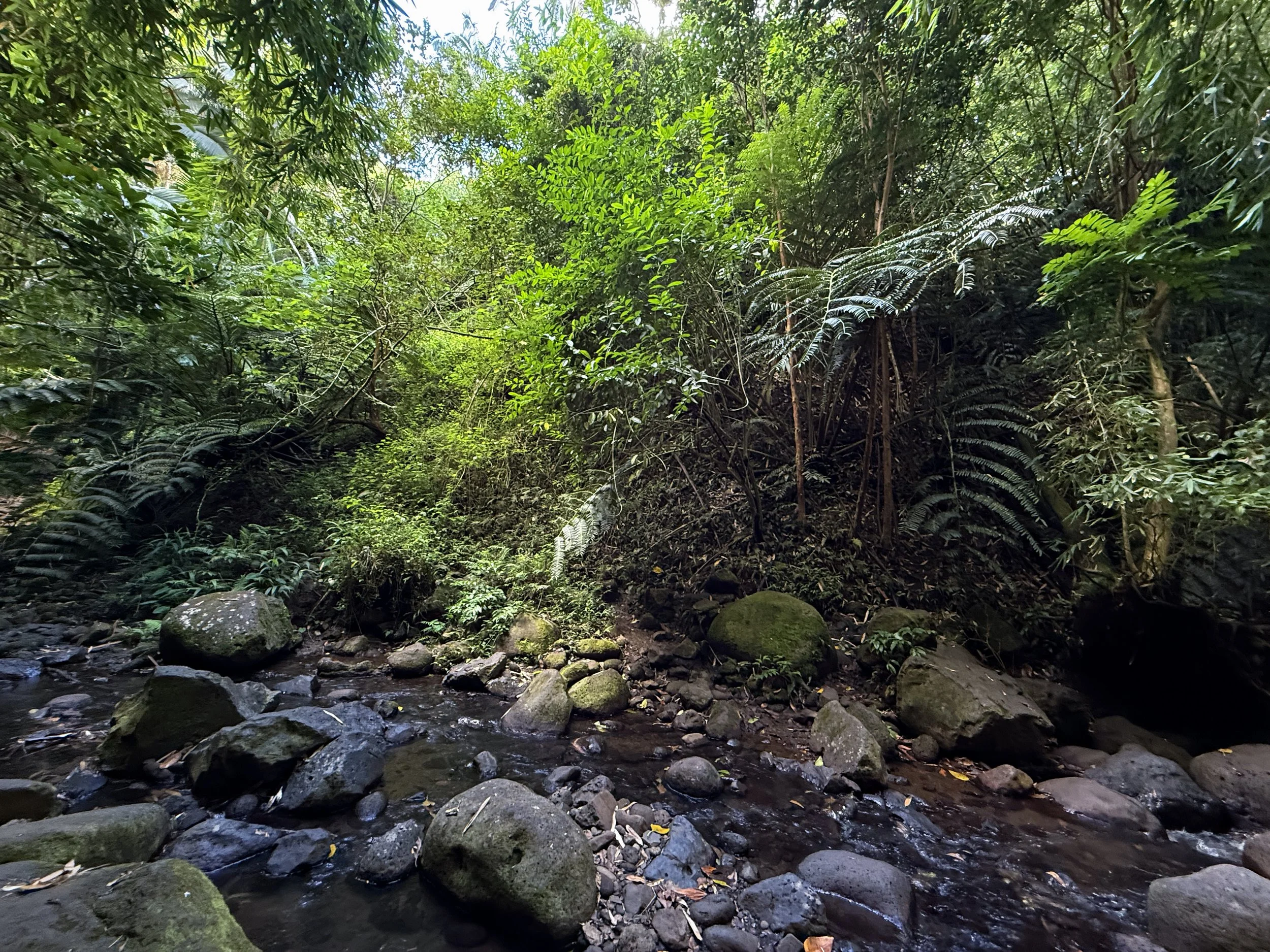 At this point, there’s either the option to hike directly up the stream toward Maunawili Falls, a short distance ahead, or go straight across to avoid the stream as much as possible and continue hiking along the trail.