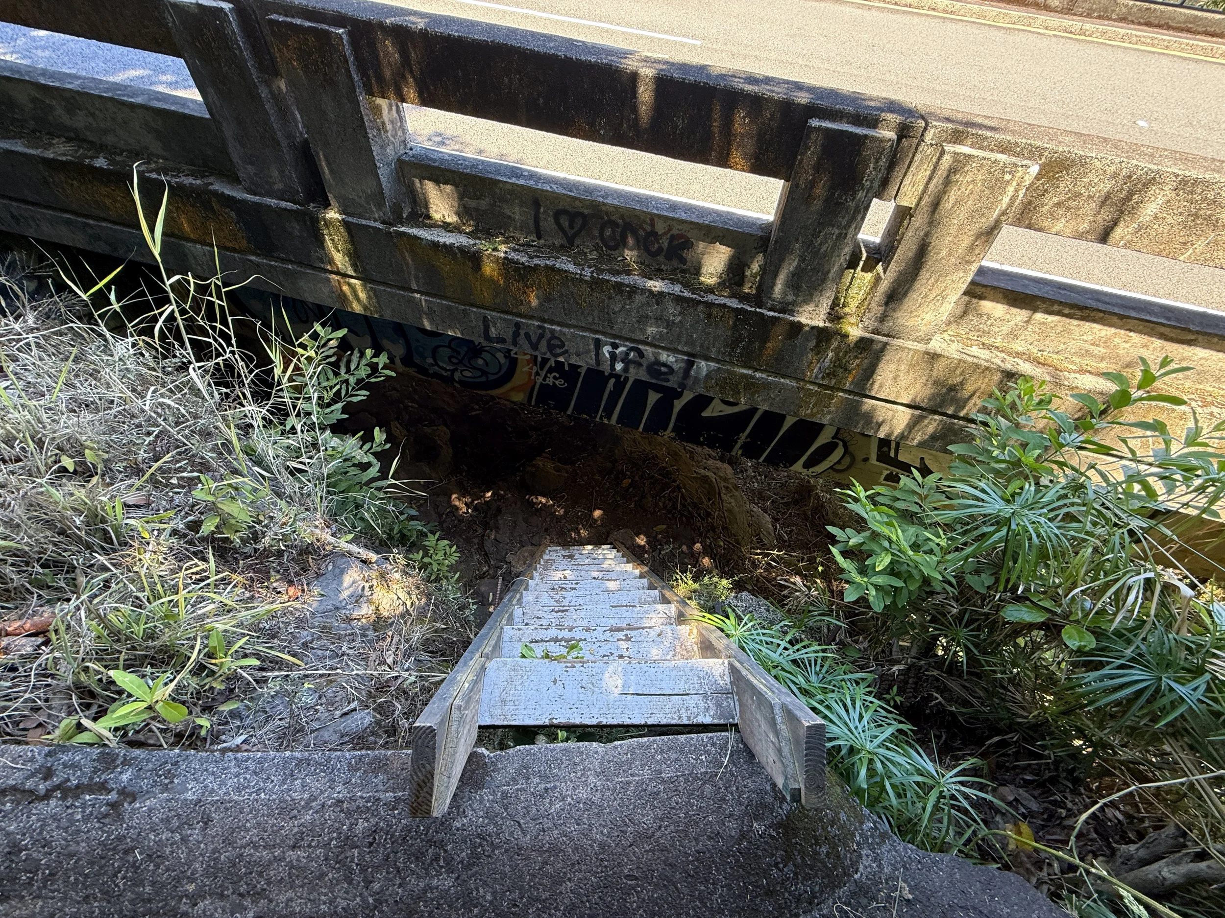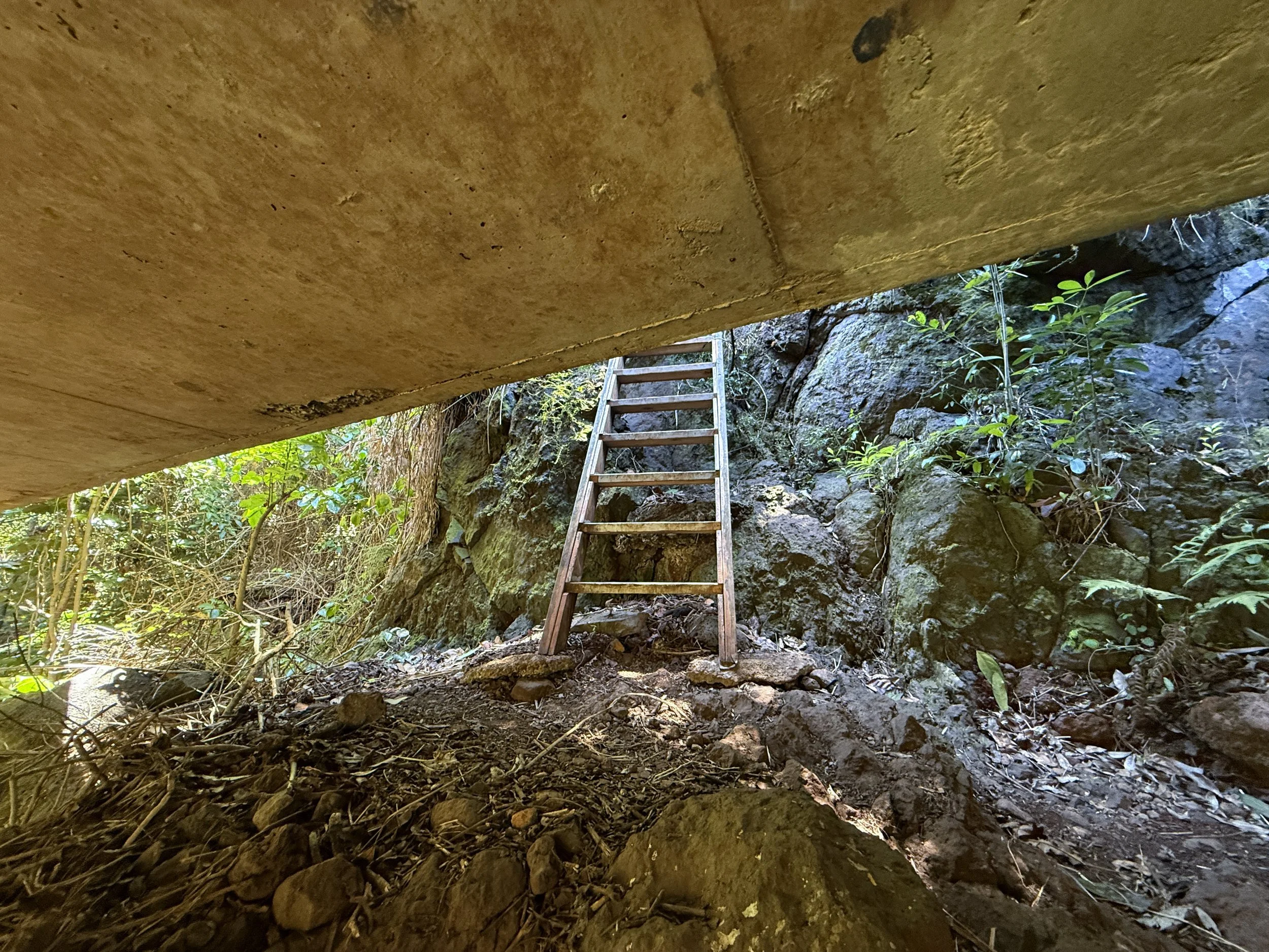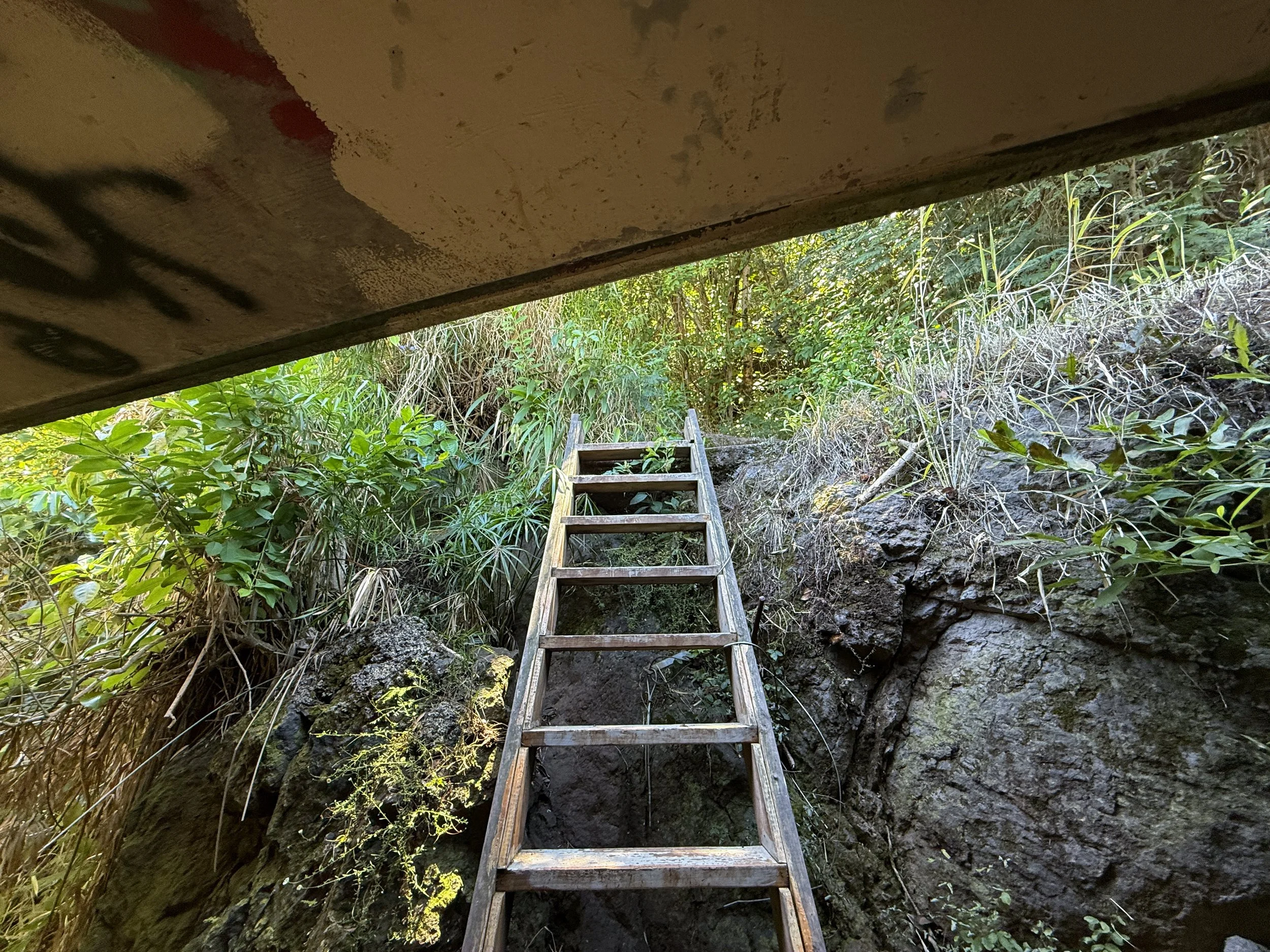 When the Maunawili Falls Trail reaches the second bridge, hikers must duck considerably lower than at the first bridge to reach the ladder on the other side.