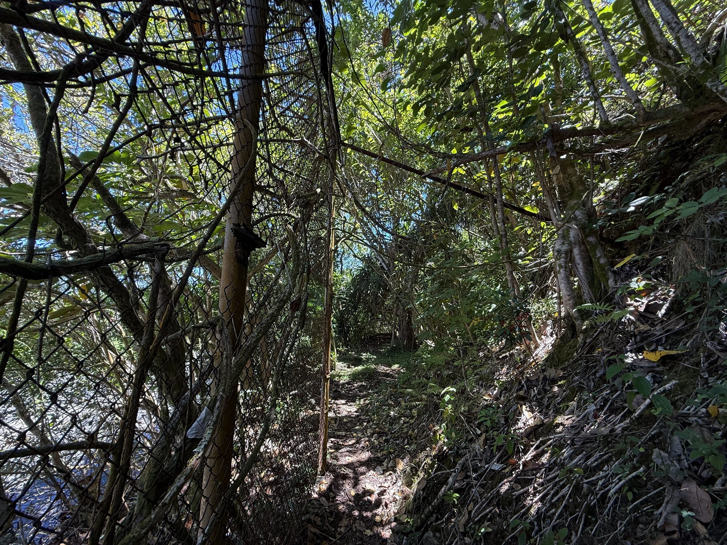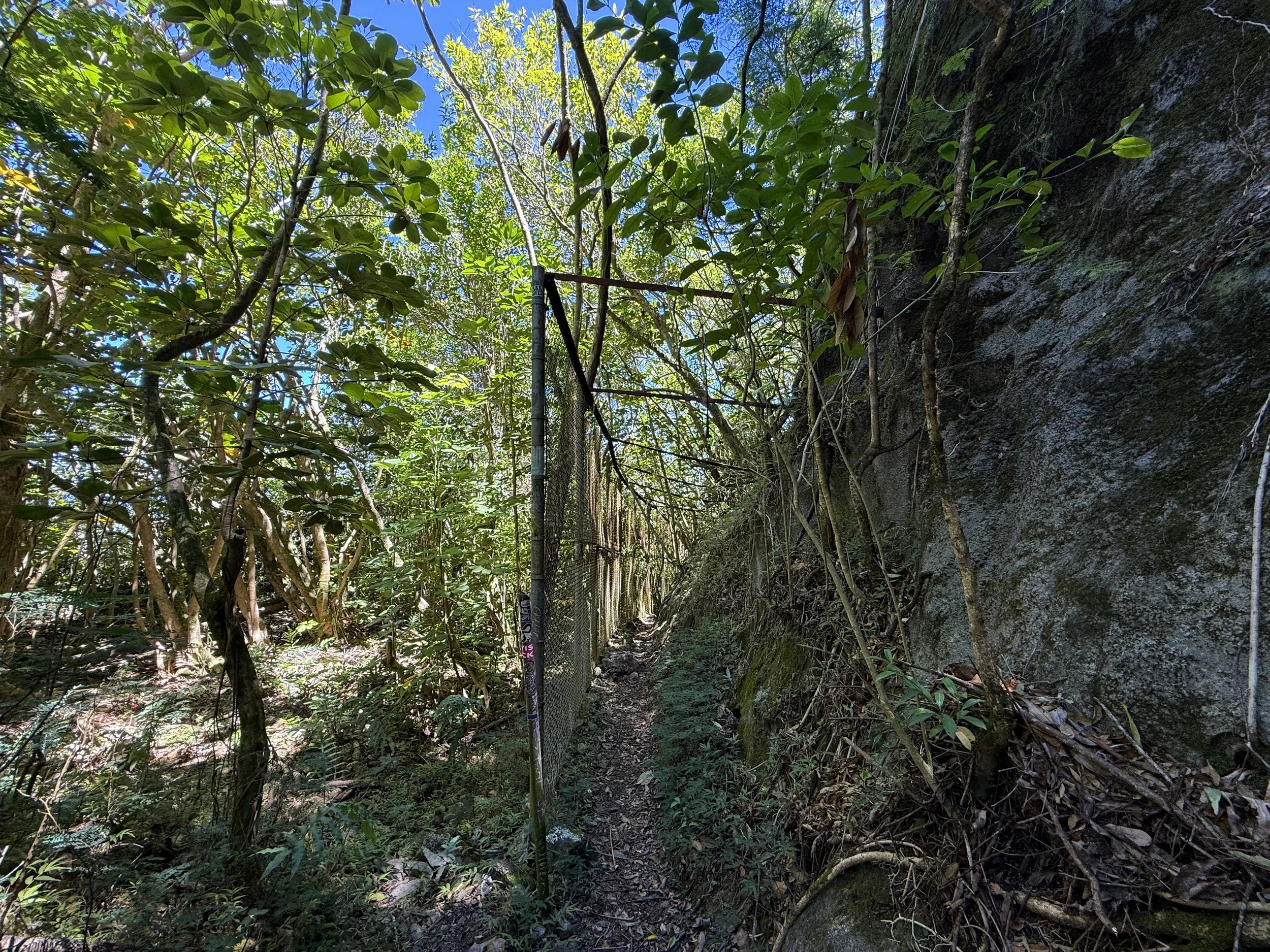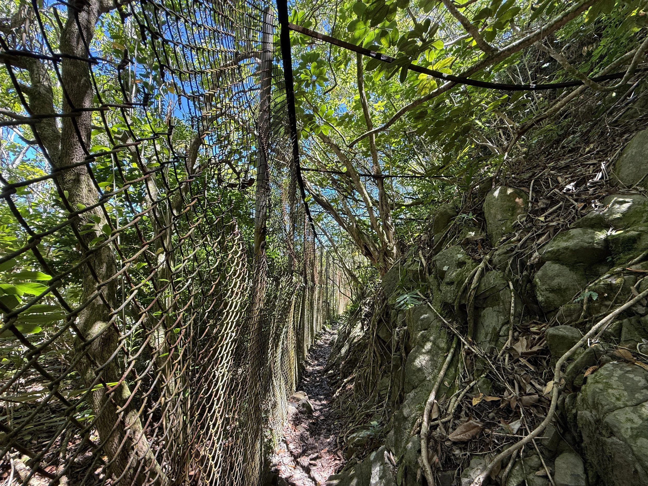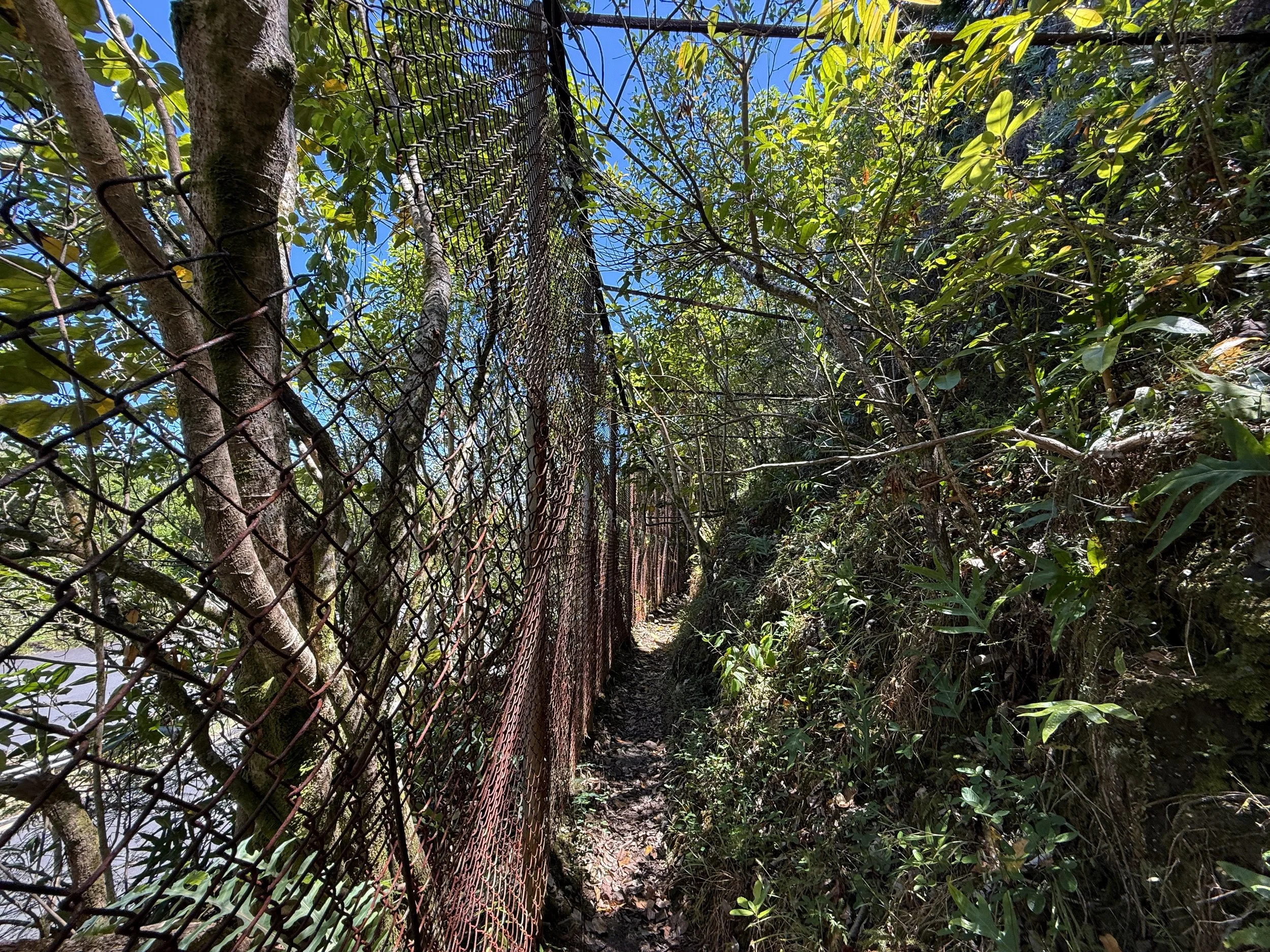 For a very short stretch, the Maunawili Falls Trail will squeeze its way between the cliffside and this chain-link fence, a remnant from the Demonstration Trail’s original construction.