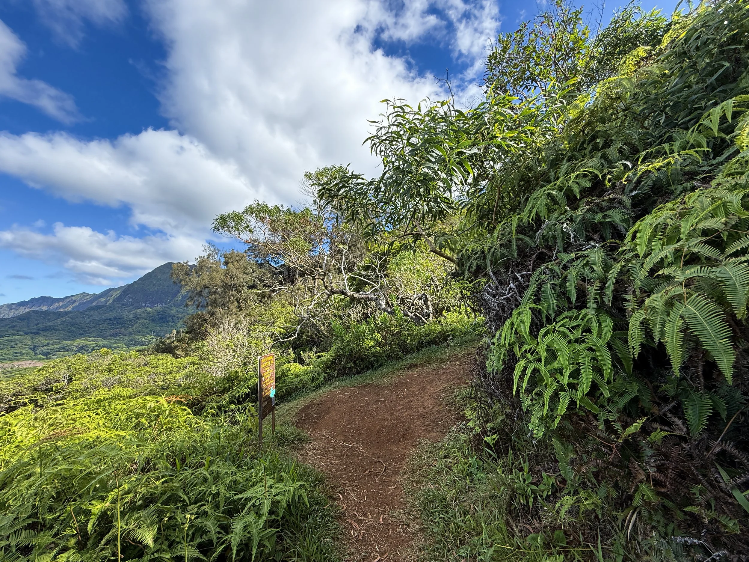 At about 0.5 miles (0.8 km) into the hike, Kīnāʻole Road reaches this three-way intersection, historically known as the Halfway House junction.
