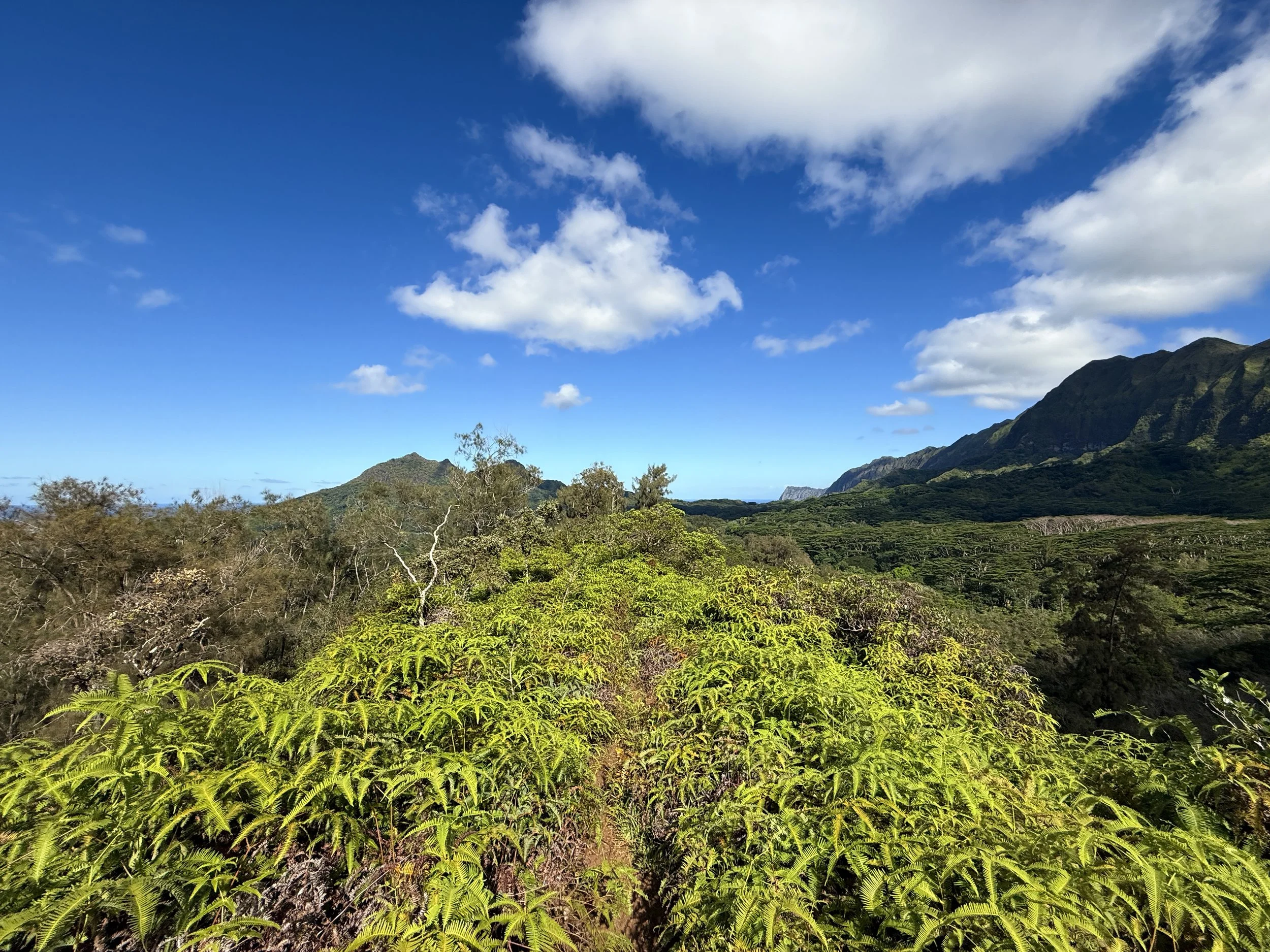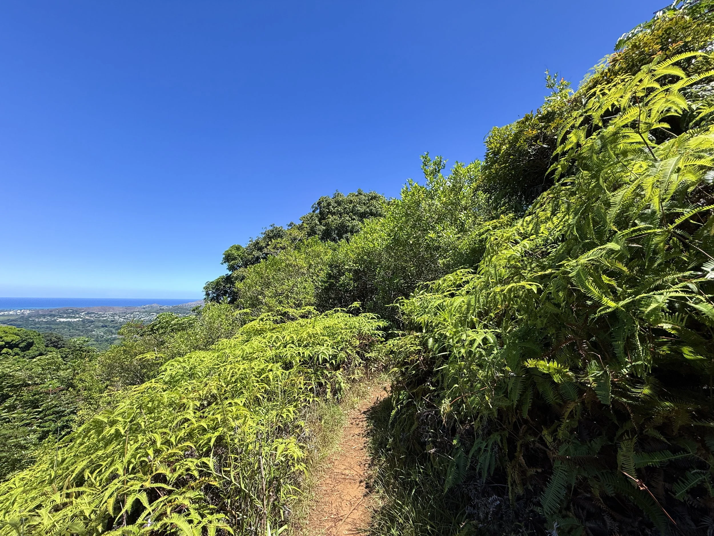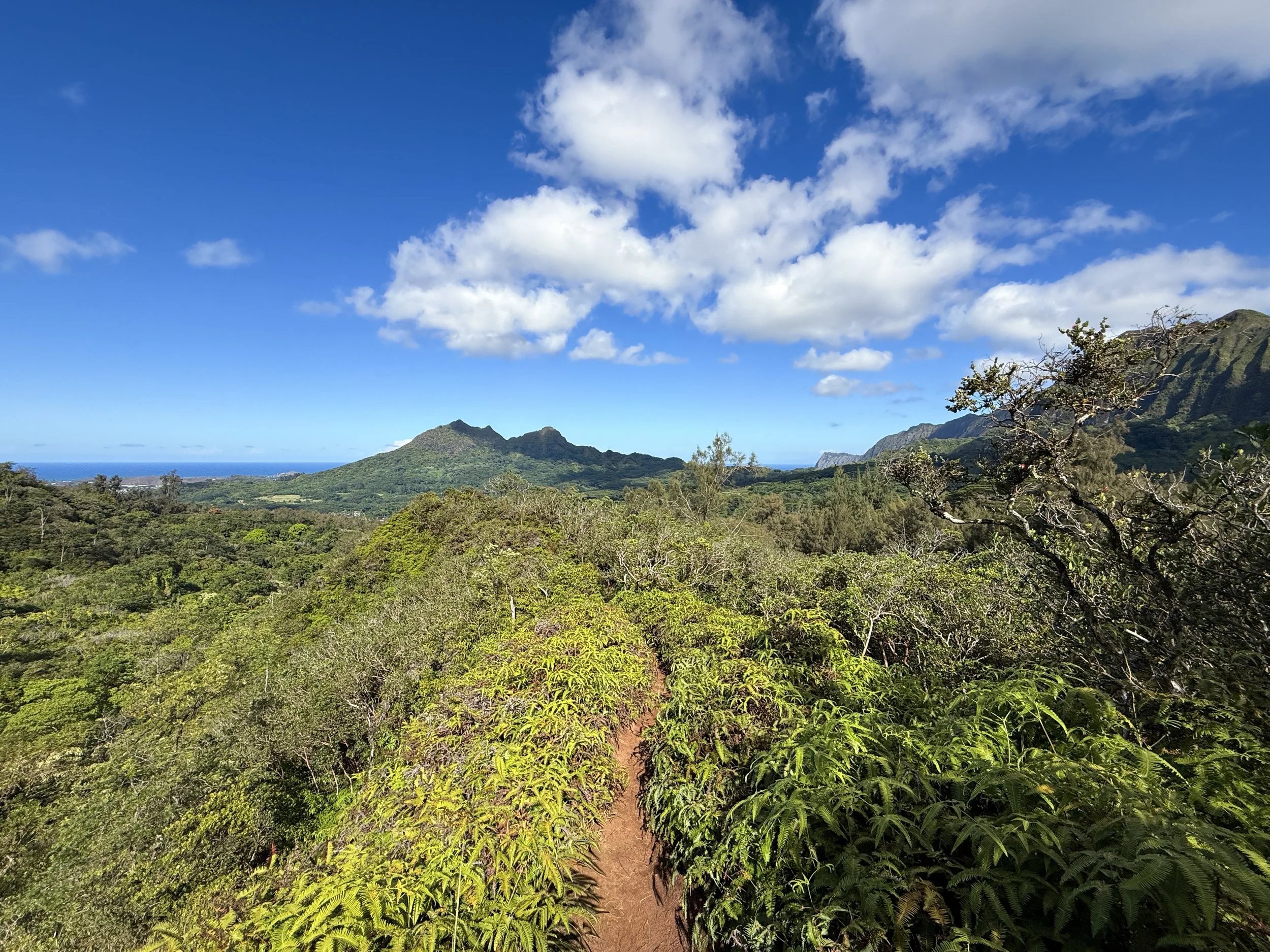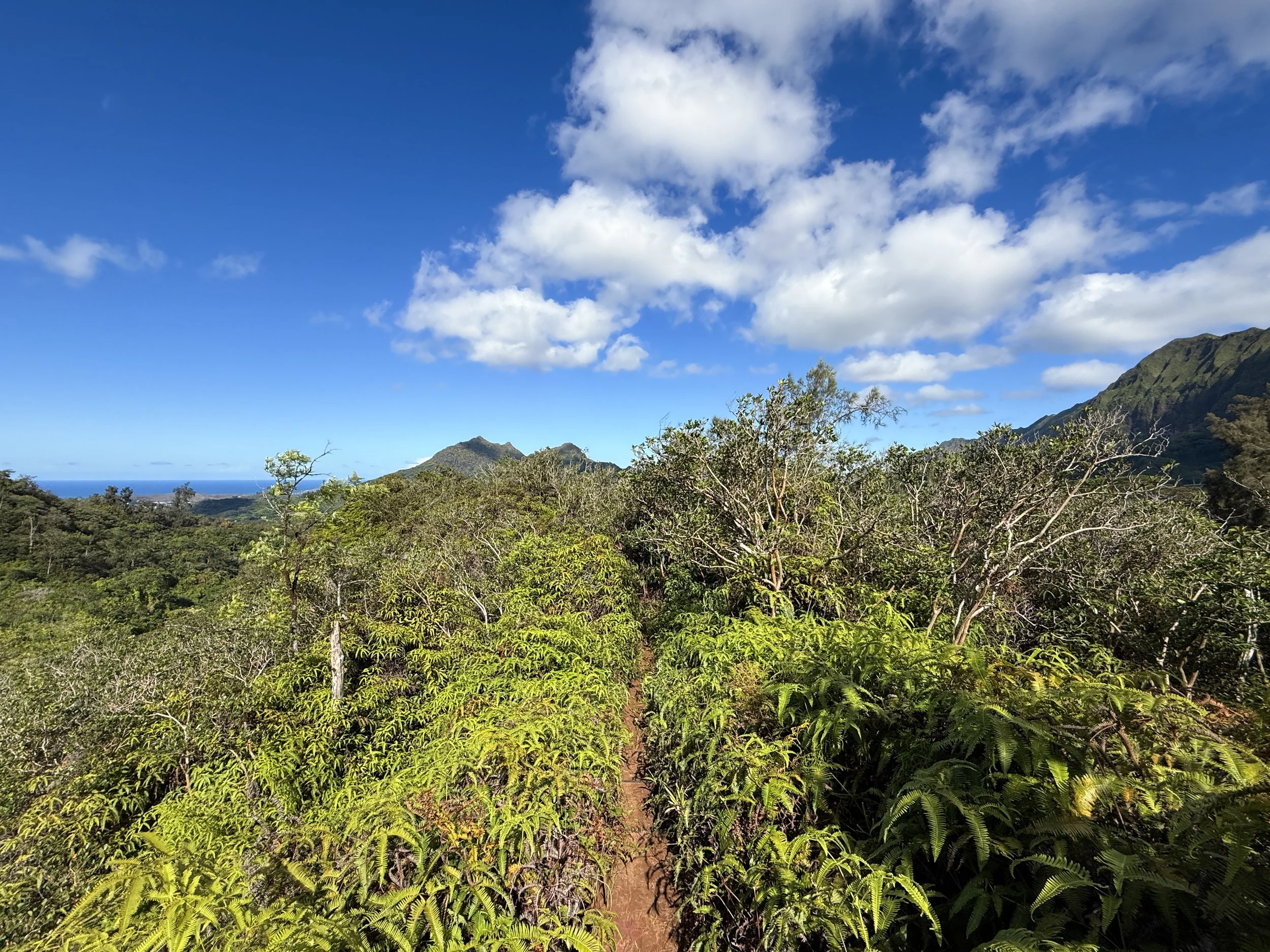 After Piliwale Ridge, hikers, for the first time, can start to look ahead and see the ridge heading down to Maunawili Falls!