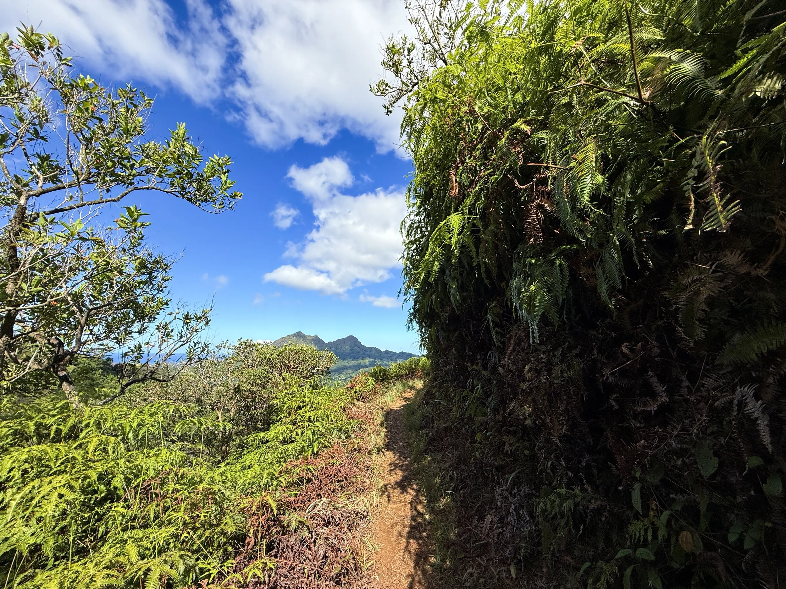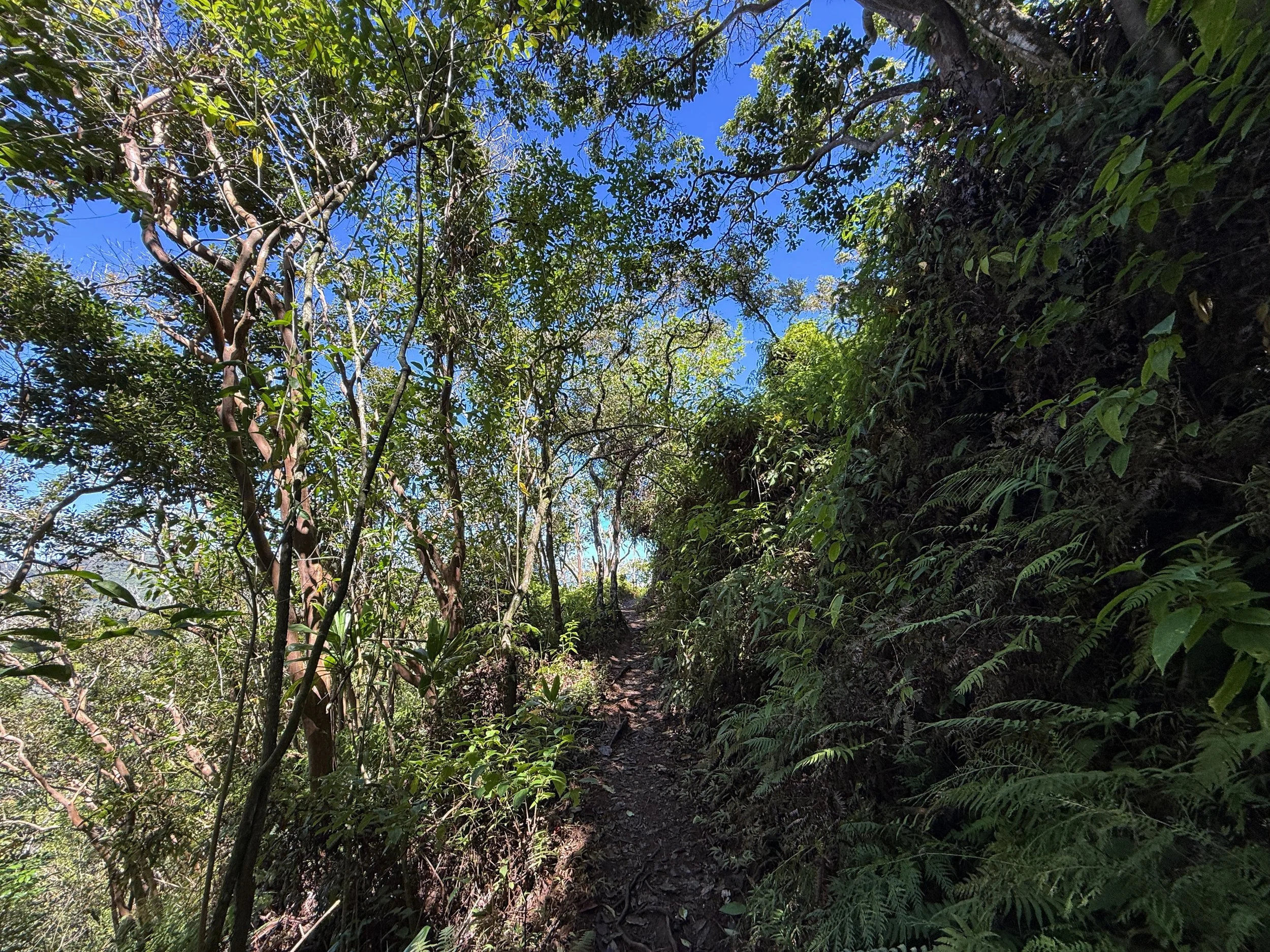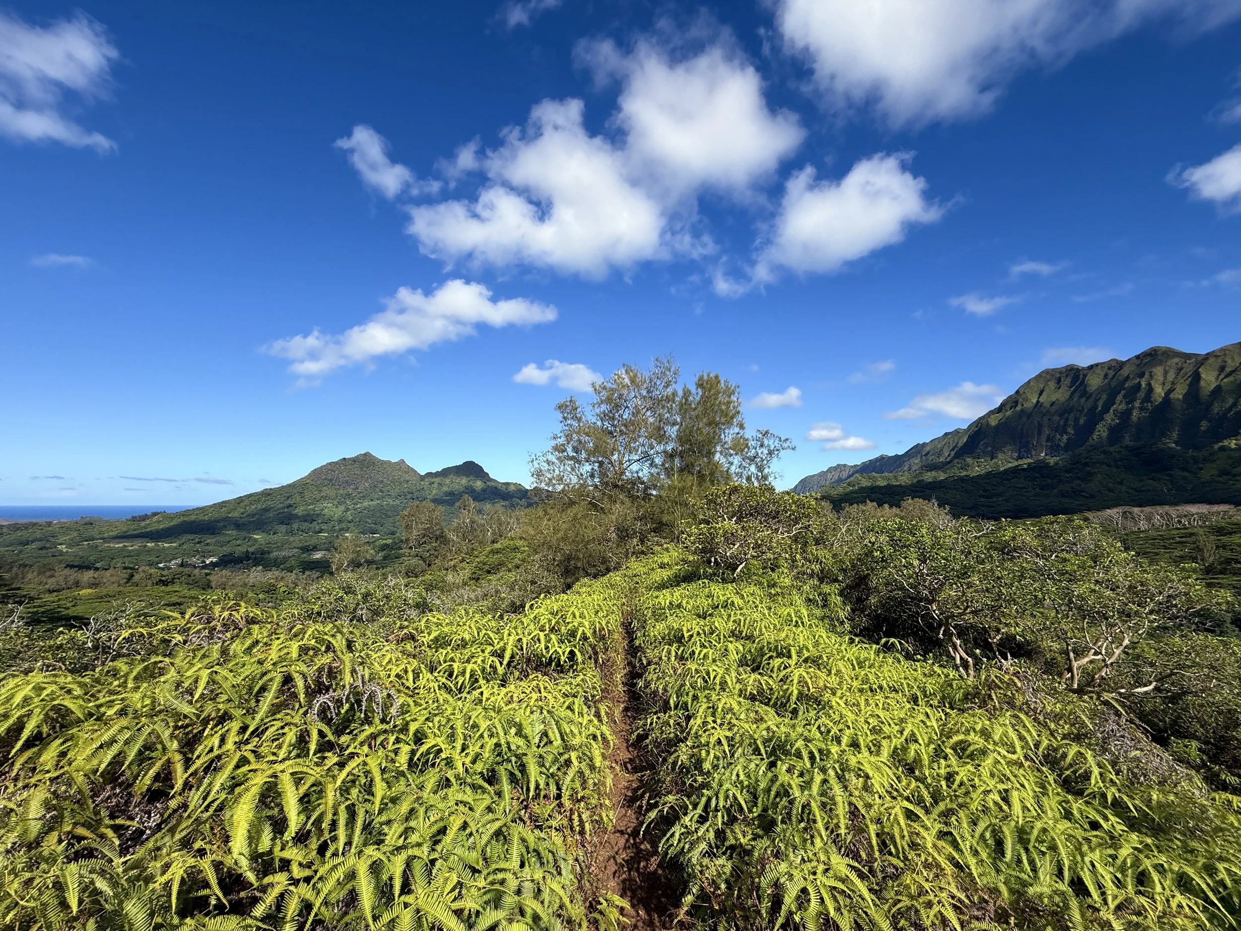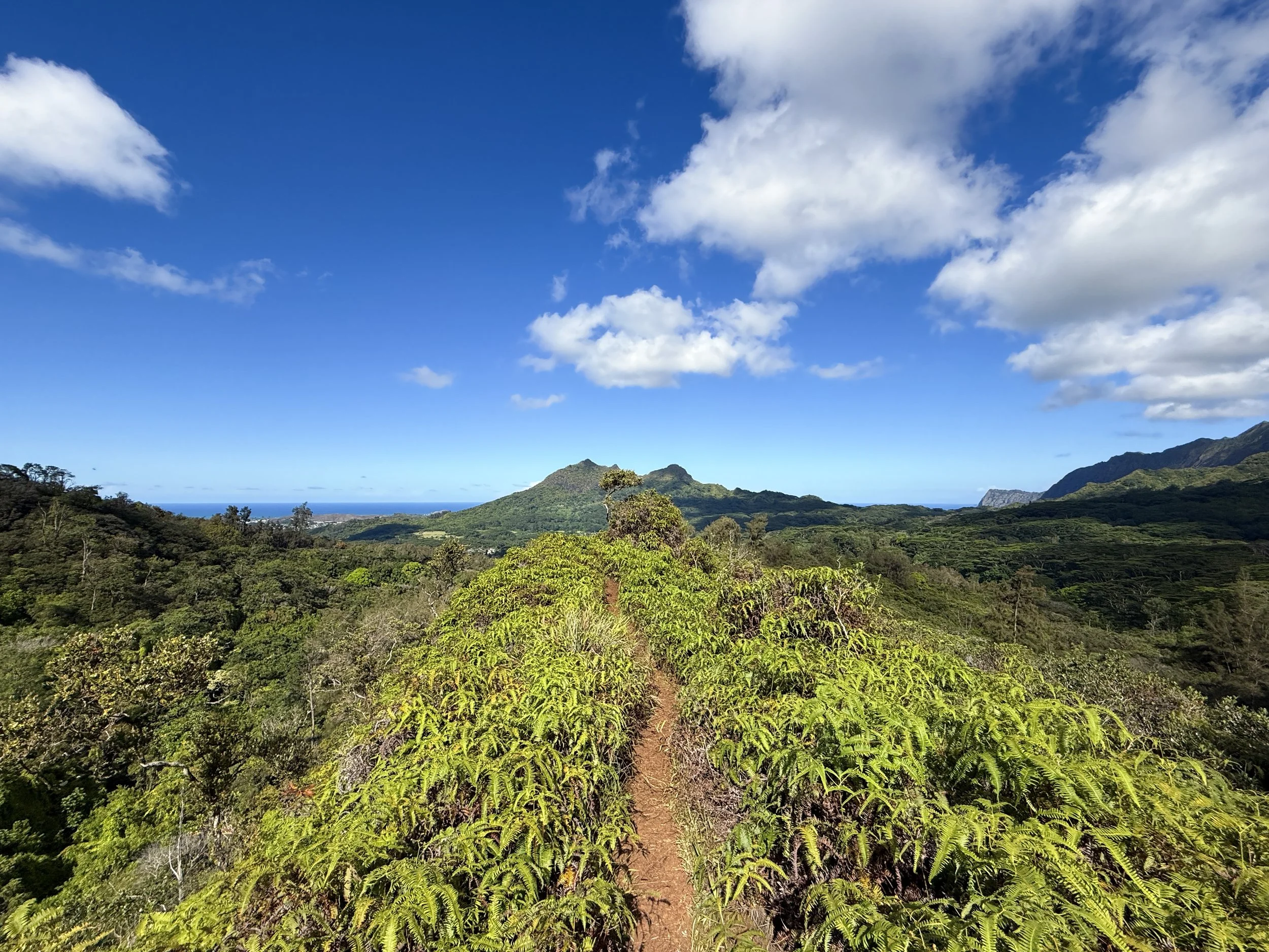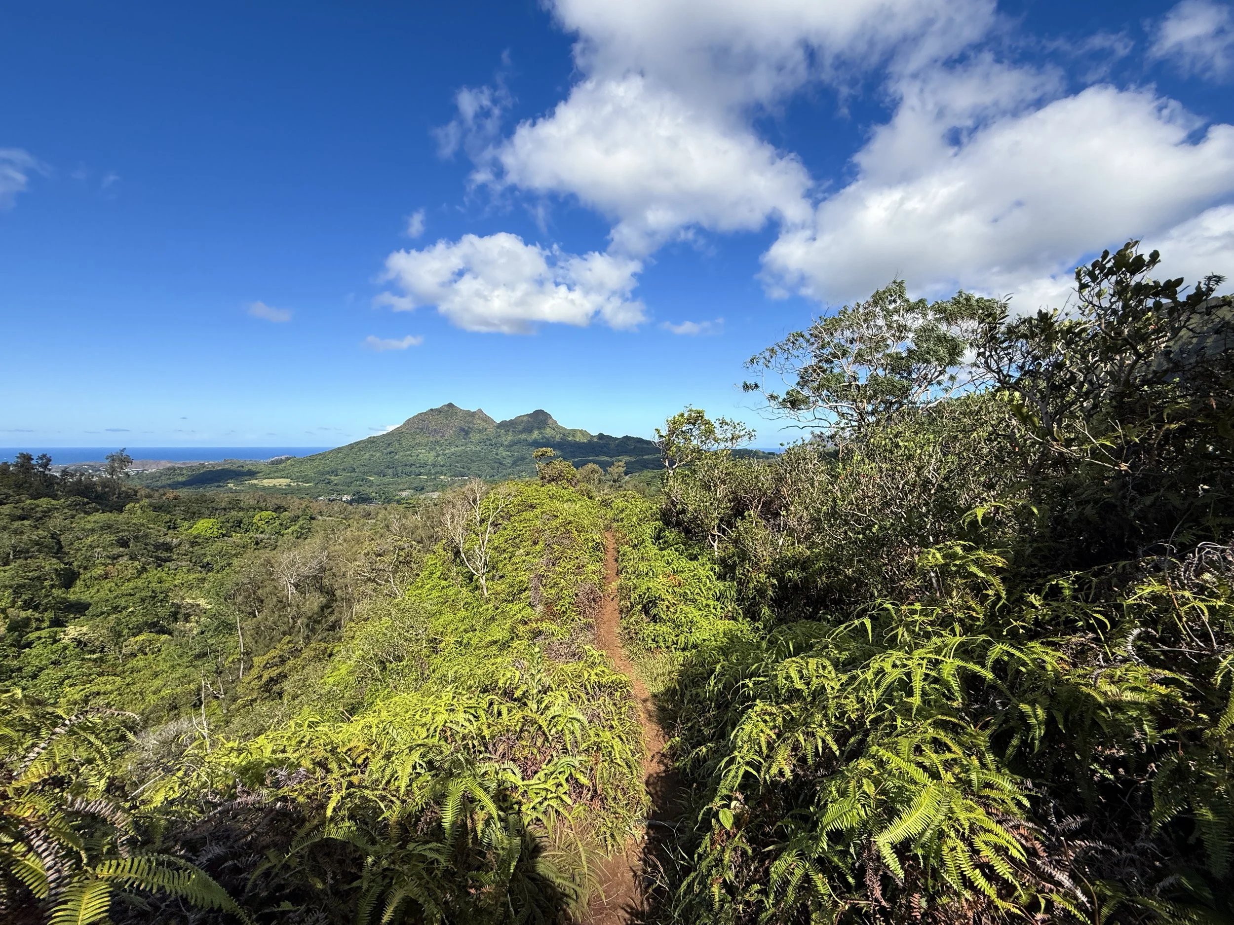 After Piliwale Ridge, hikers, for the first time, can start to look ahead and see the ridge heading down to Maunawili Falls!