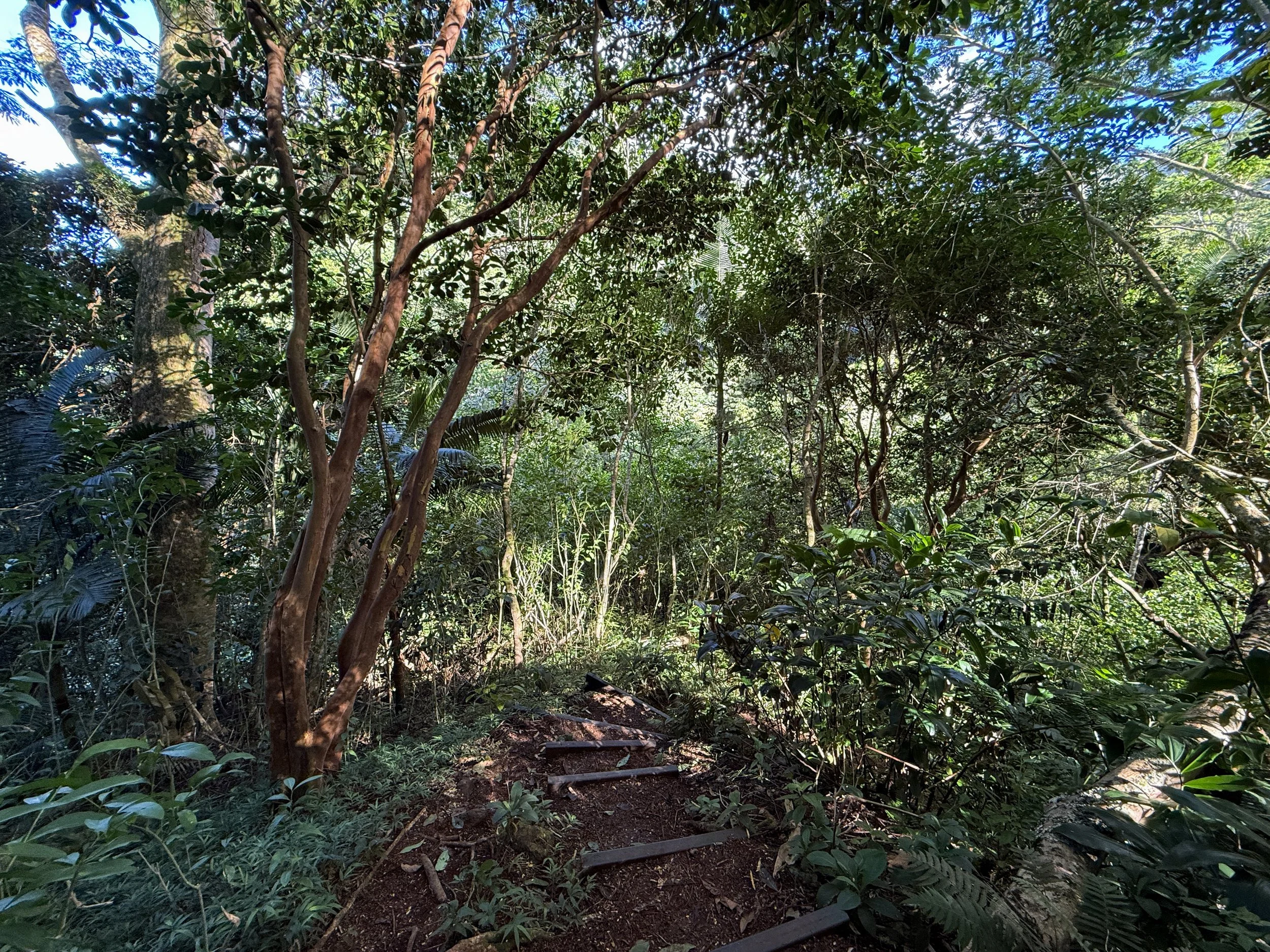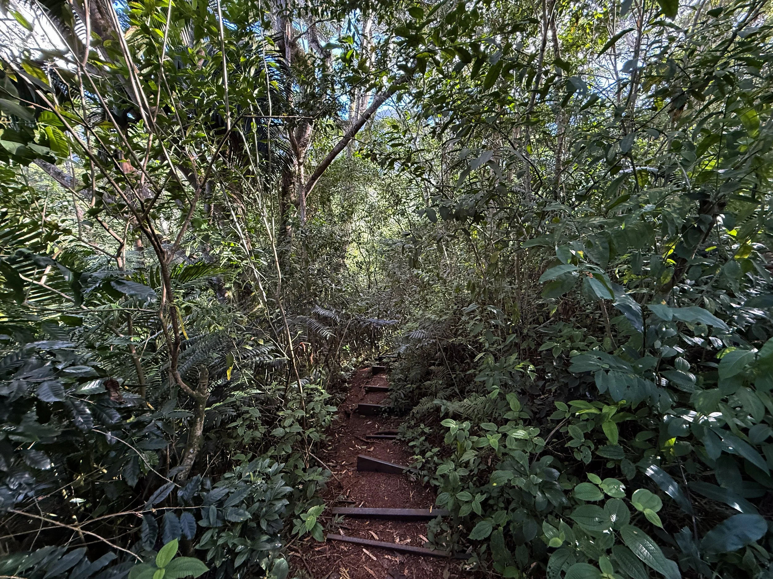 When the connector trail with the Old Pali Road and the Maunawili Demonstration Trail re-enters the forest, the views won’t open up again until the stairs that lead down to the connection with the hairpin turn.
