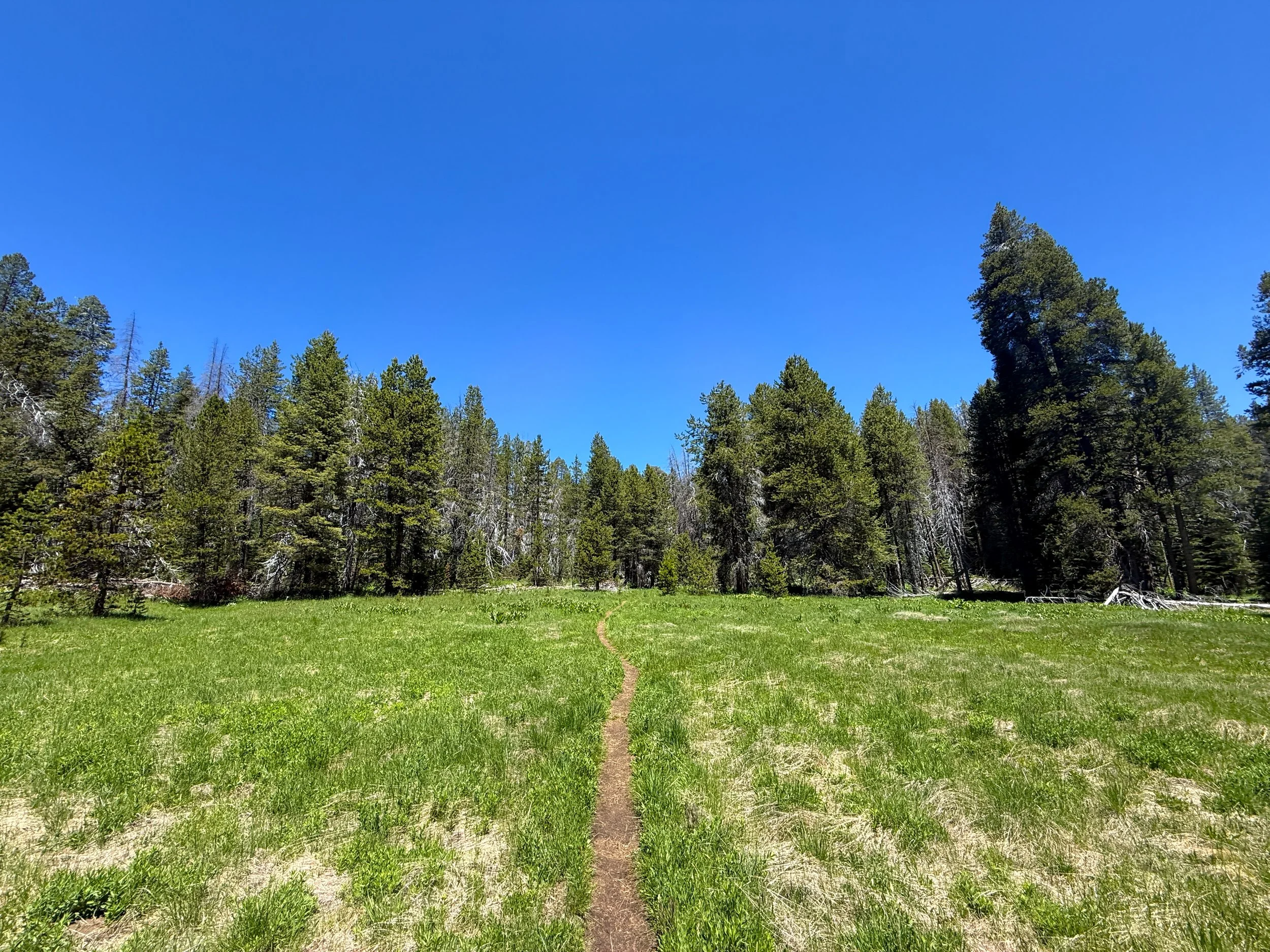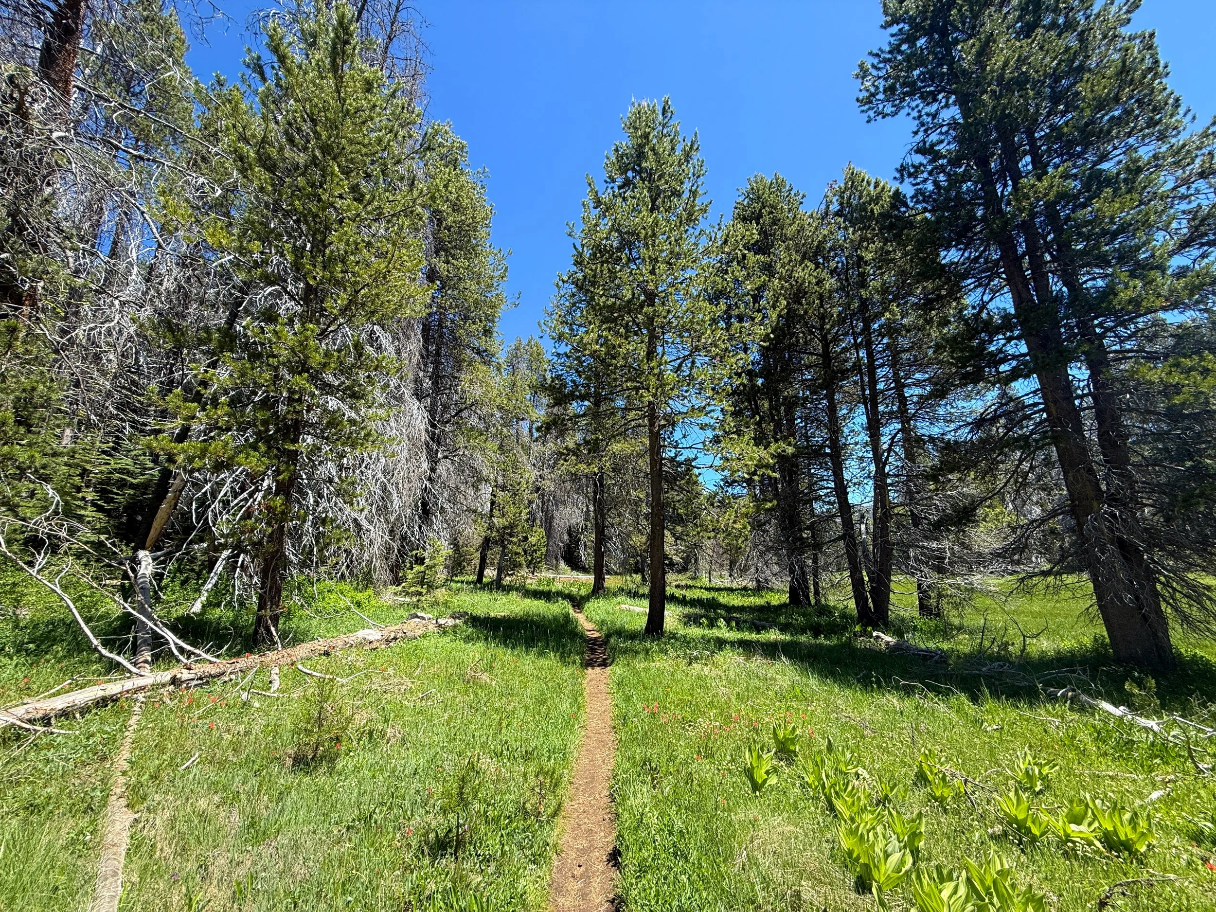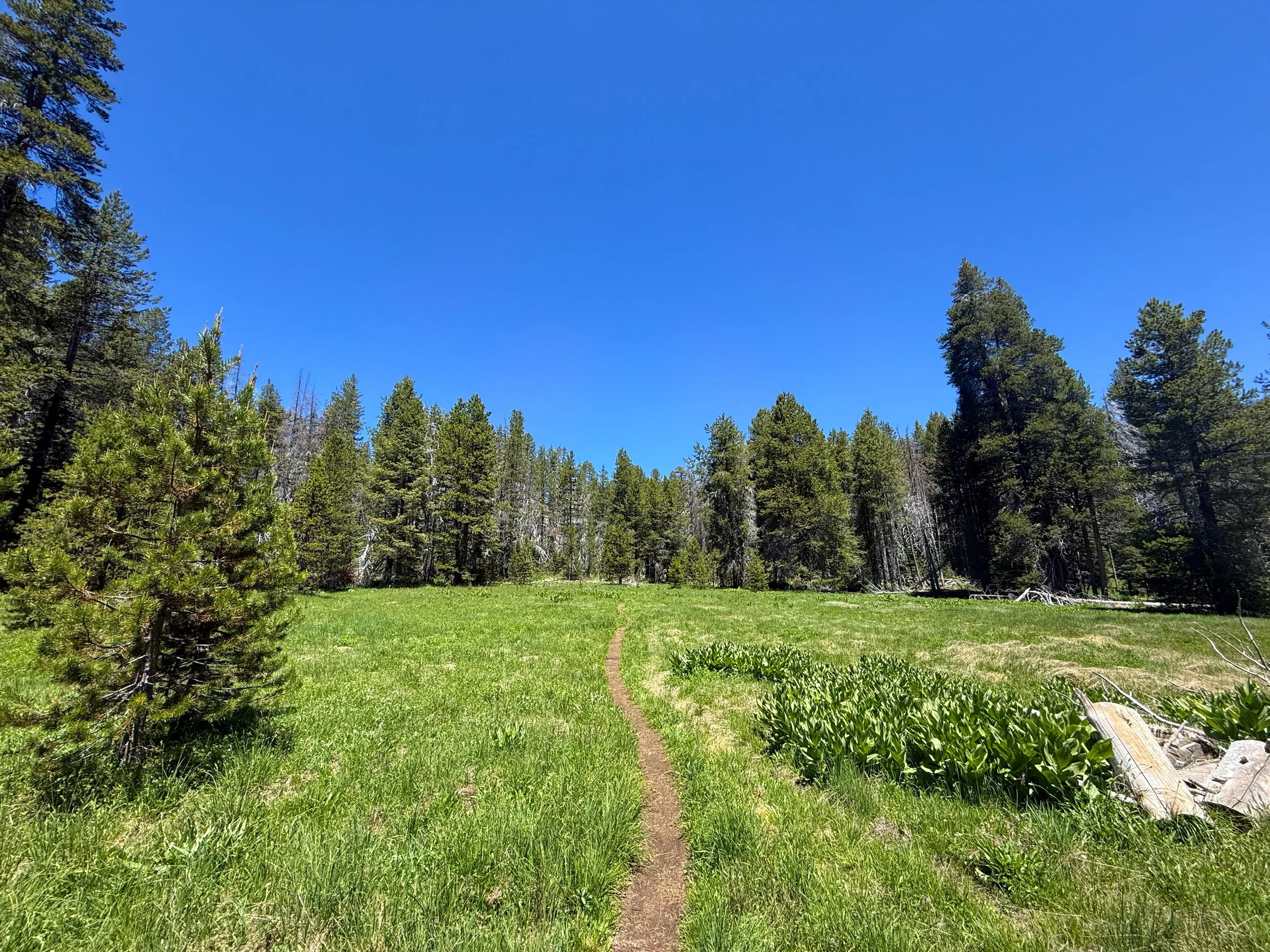 After the initial split, the McGurk Meadows Trail simply navigates its way through a mixed Lodgepole Pine forest, until the trees suddenly end at the meadow—just after McGurk Cabin.