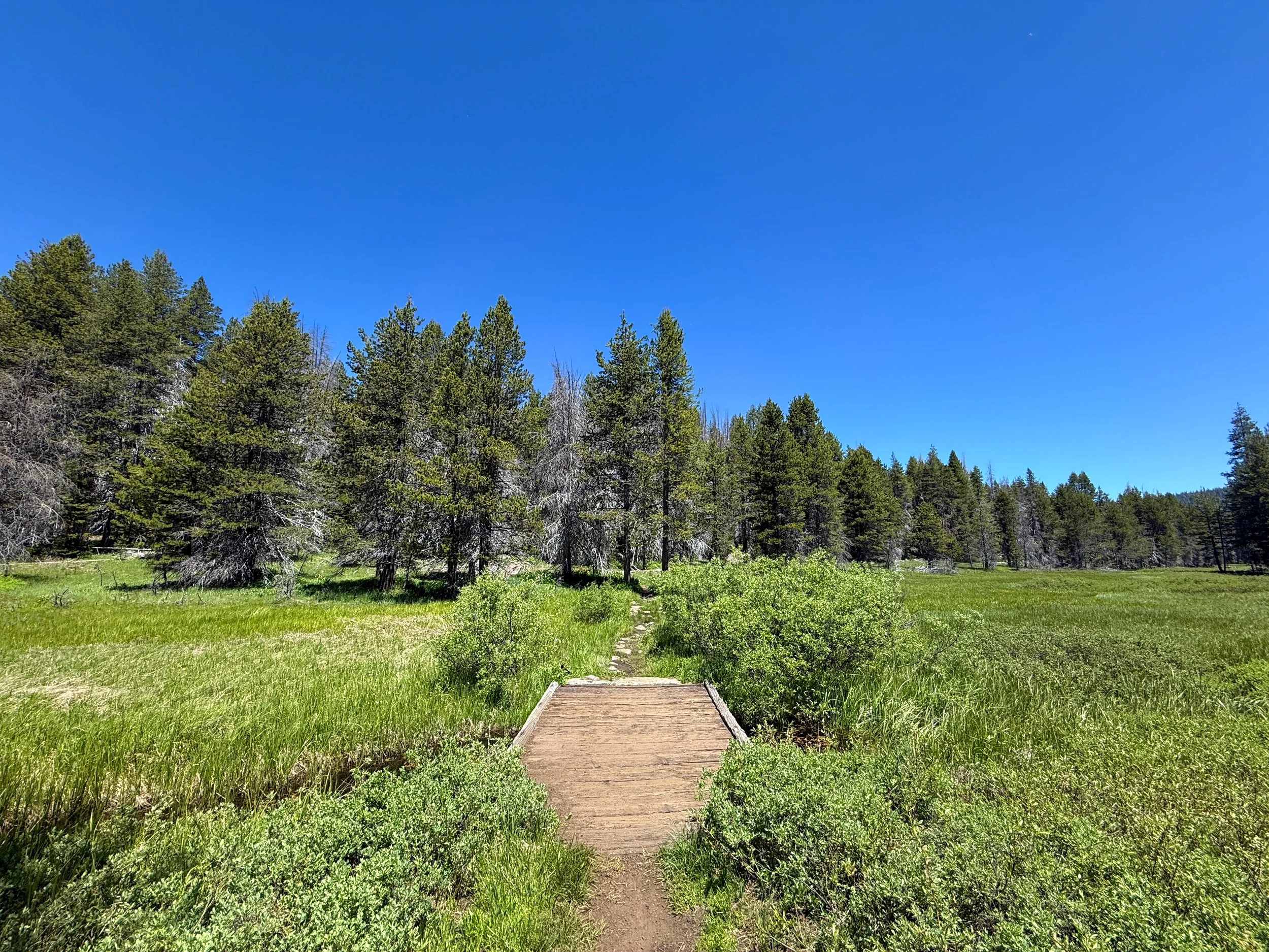 In the early summer months, when snowmelt is at or near its peak, some sections through McGurk Meadow may be underwater.